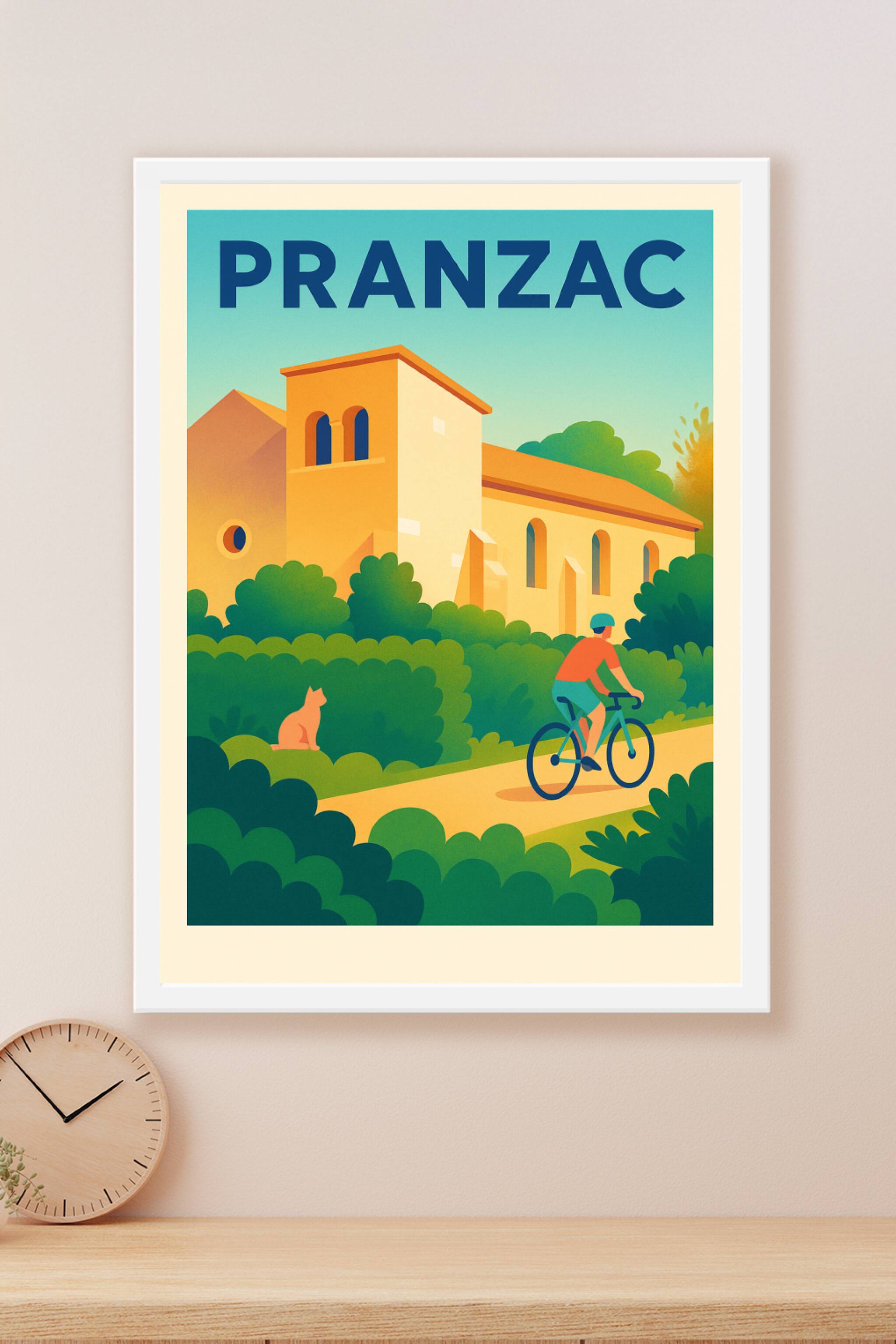 Découvrez l'atmosphère paisible et verdoyante de Pranzac à travers cette affiche illustrée, où une balade à vélo se déroule au cœur d’un village pi...