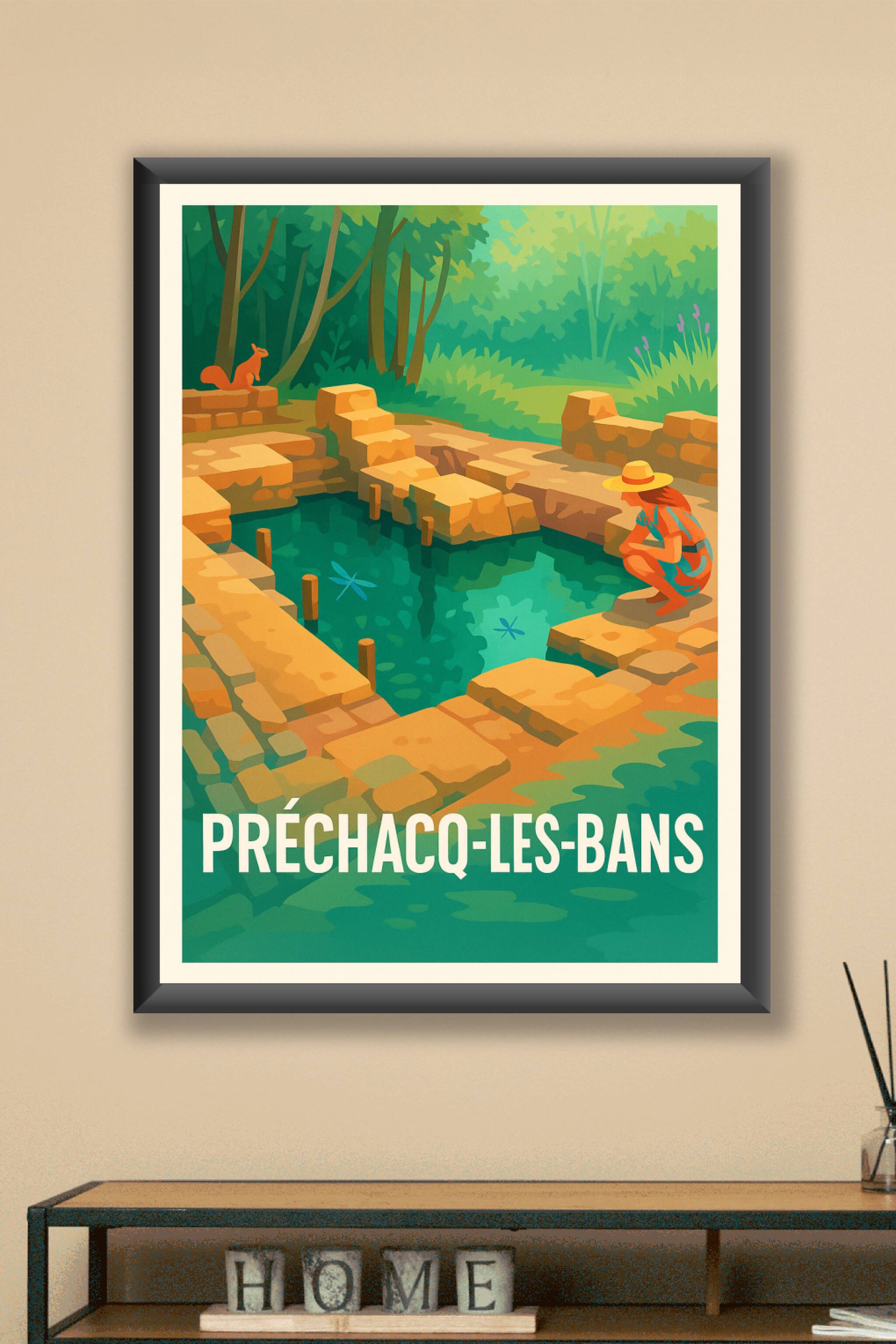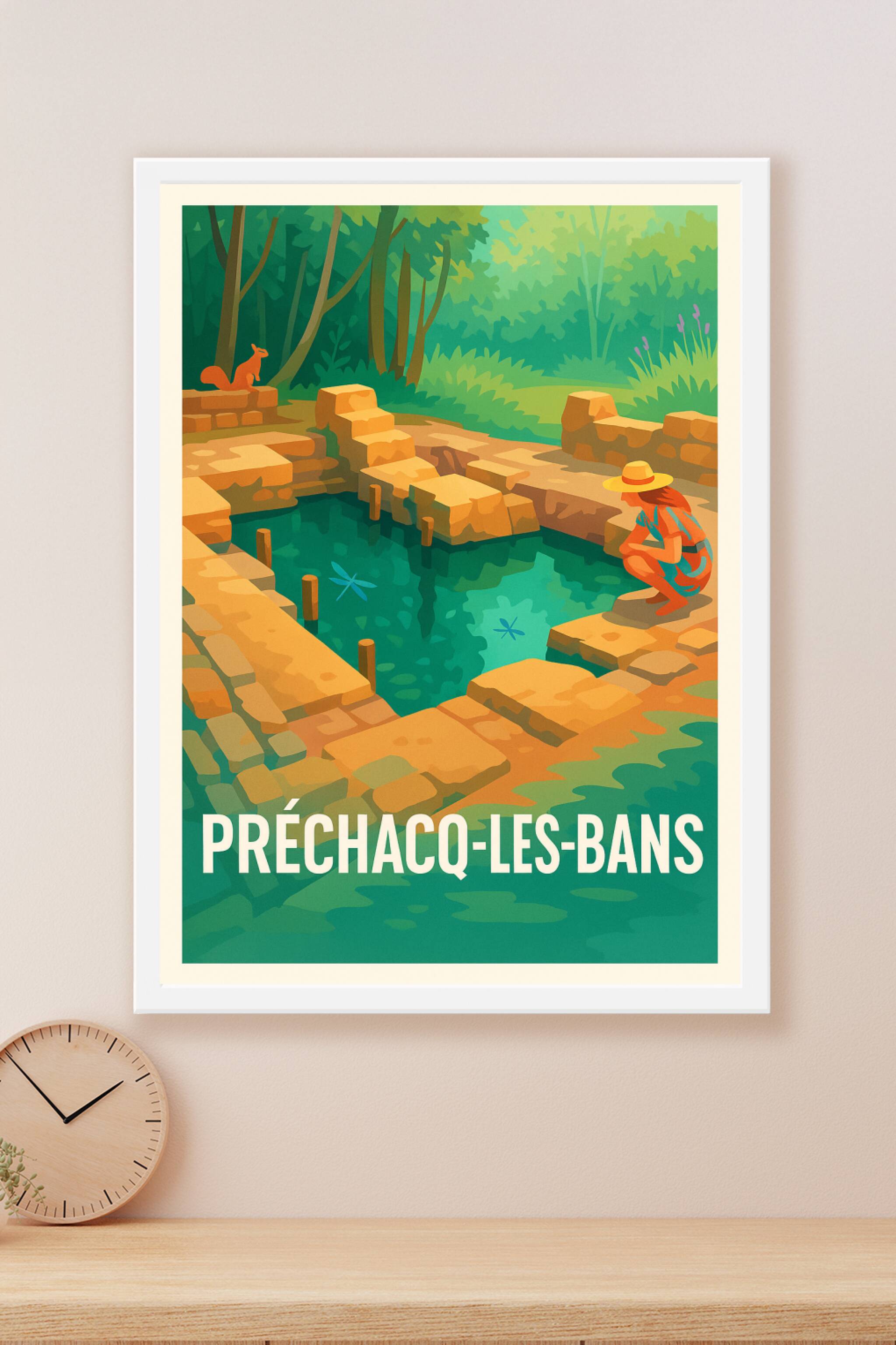 Découvrez la sérénité unique de Préchacq-les-Bains avec cette affiche illustrée qui capture l'atmosphère paisible des sources thermales et leur env...