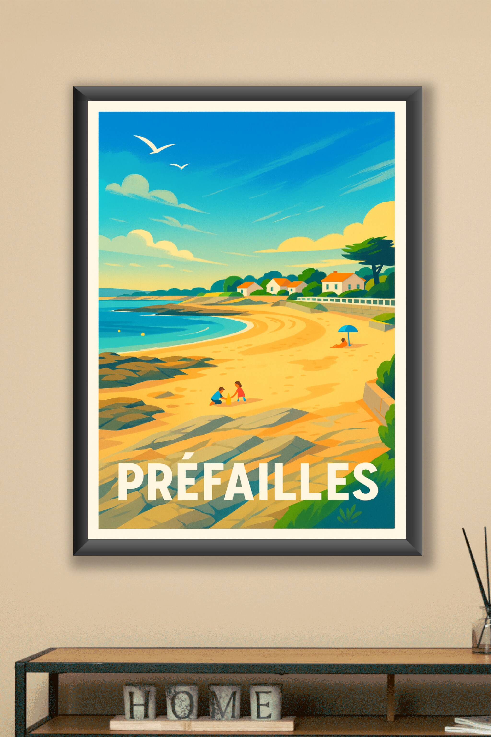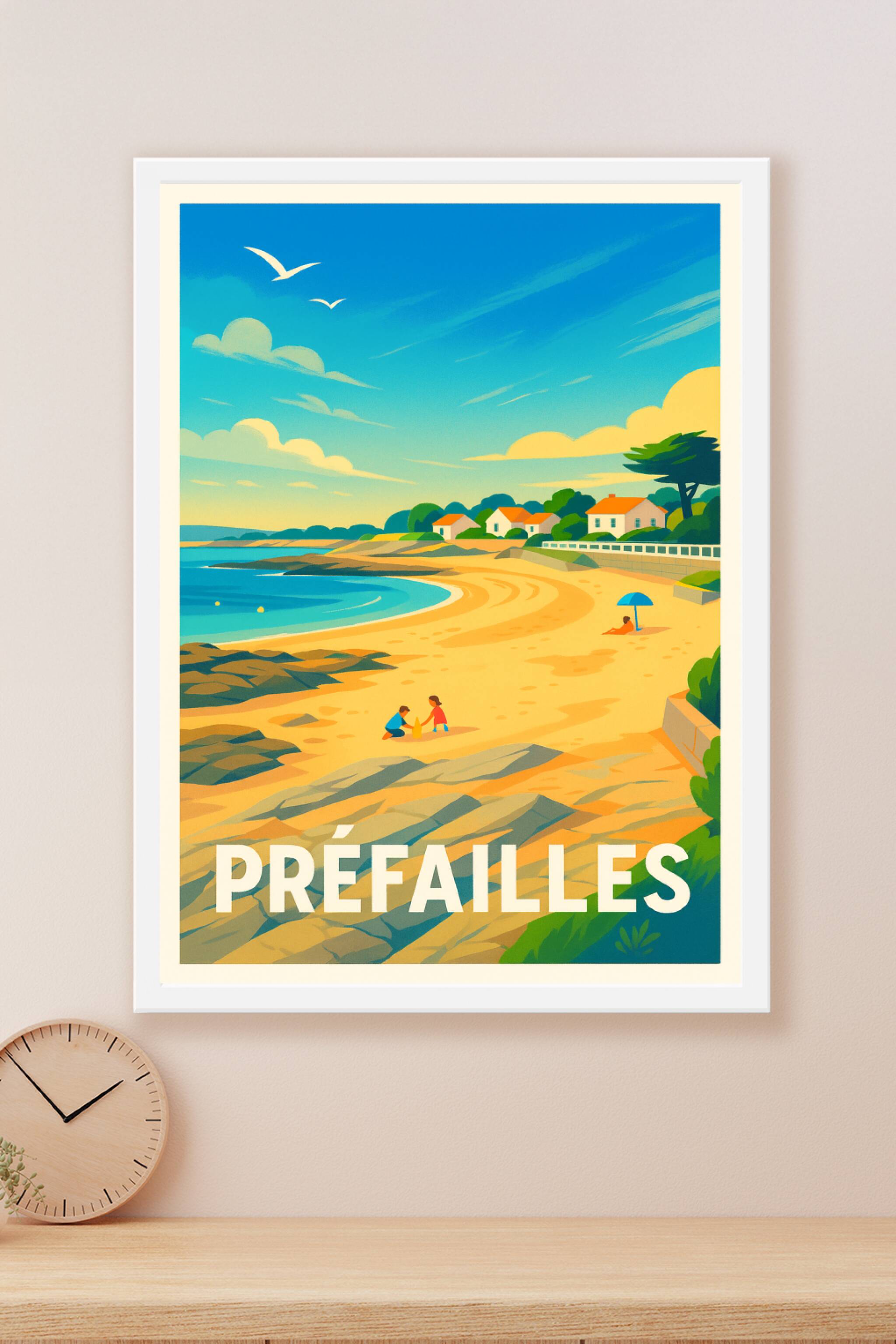 Découvrez la douceur de vivre balnéaire avec cette affiche illustrant la plage paisible de Préfailles, ses petites maisons au toit rouge et son amb...