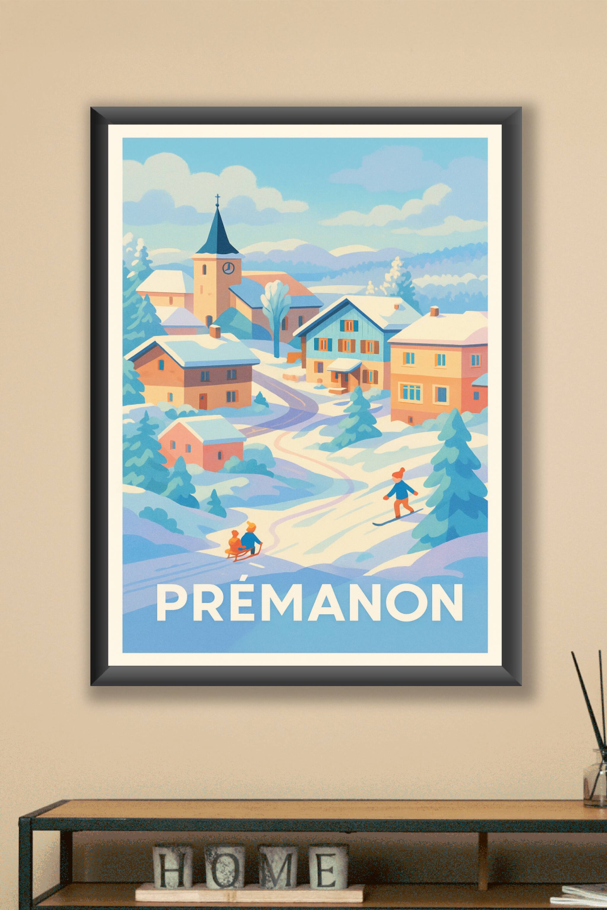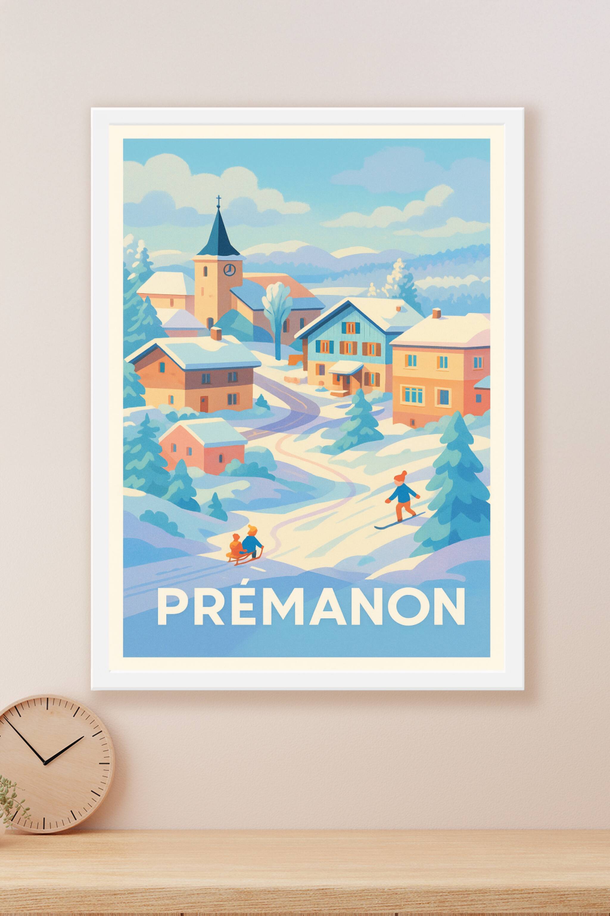 Découvrez le charme paisible et la douceur des paysages enneigés de Prémanon avec cette affiche illustrée pleine de douceur. Ce poster met en scène...