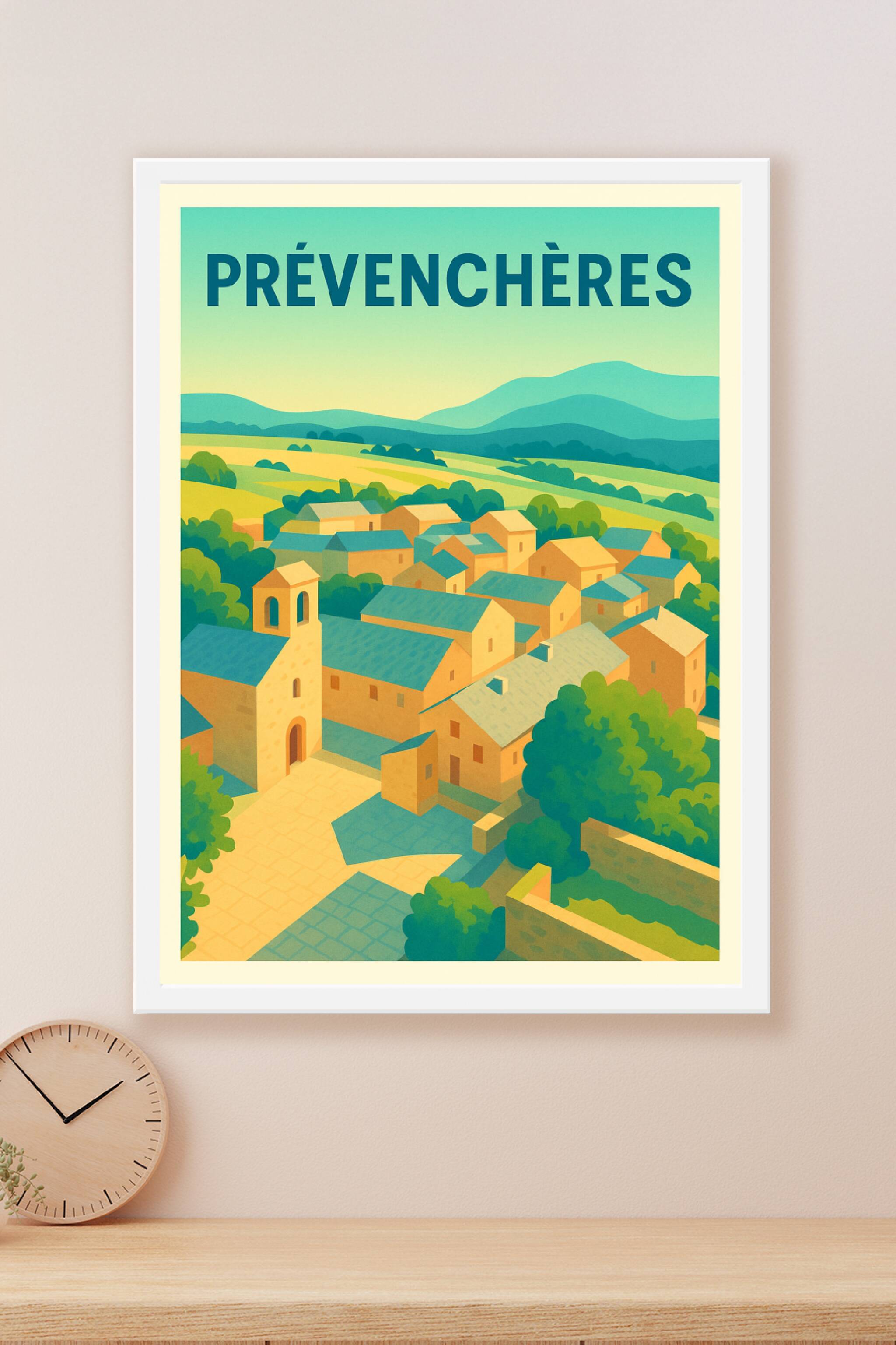 Découvrez l'élégance sereine de Prévenchères avec cette affiche illustrée aux couleurs douces et équilibrées, qui capture l'essence paisible d'un v...