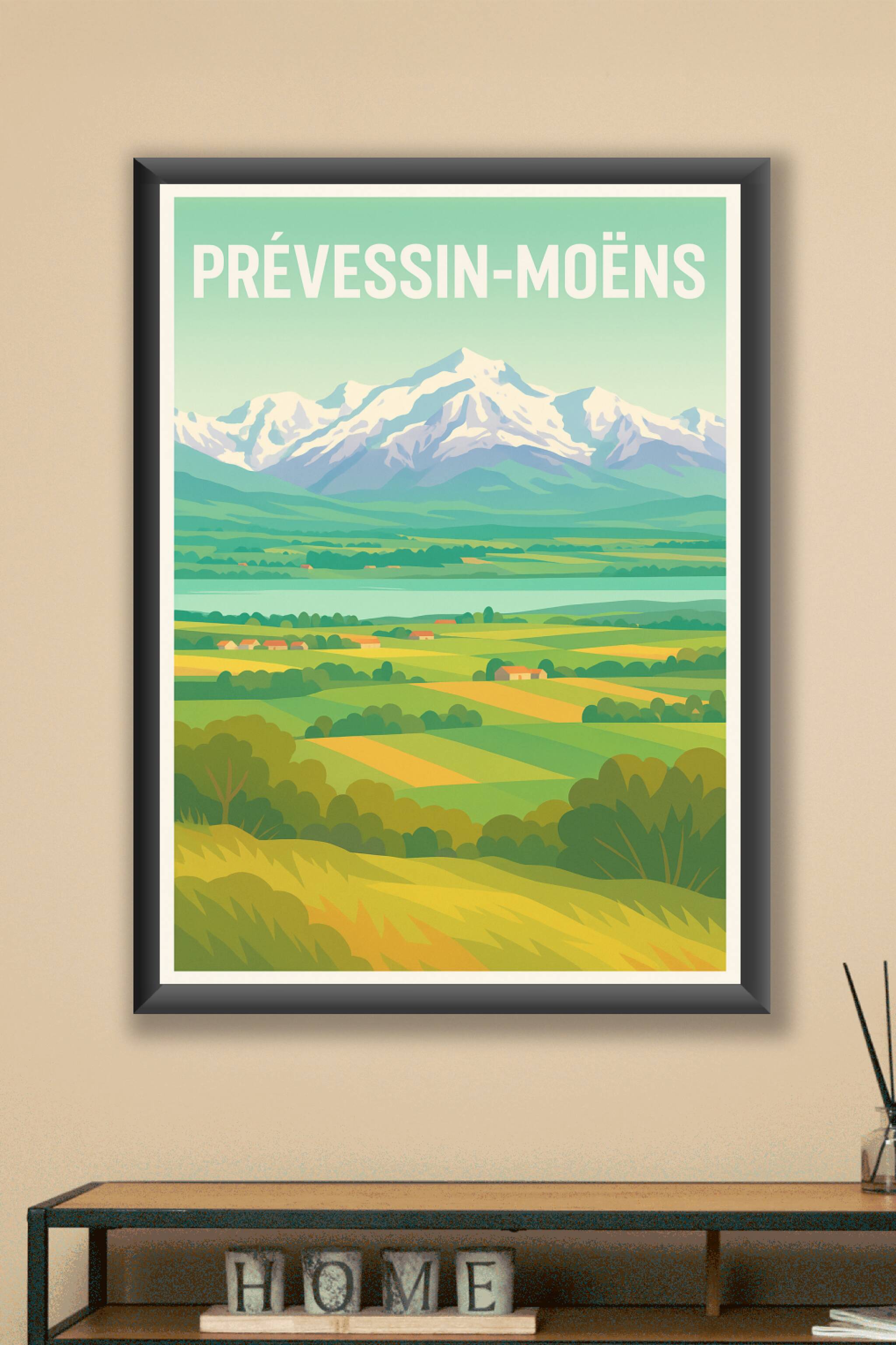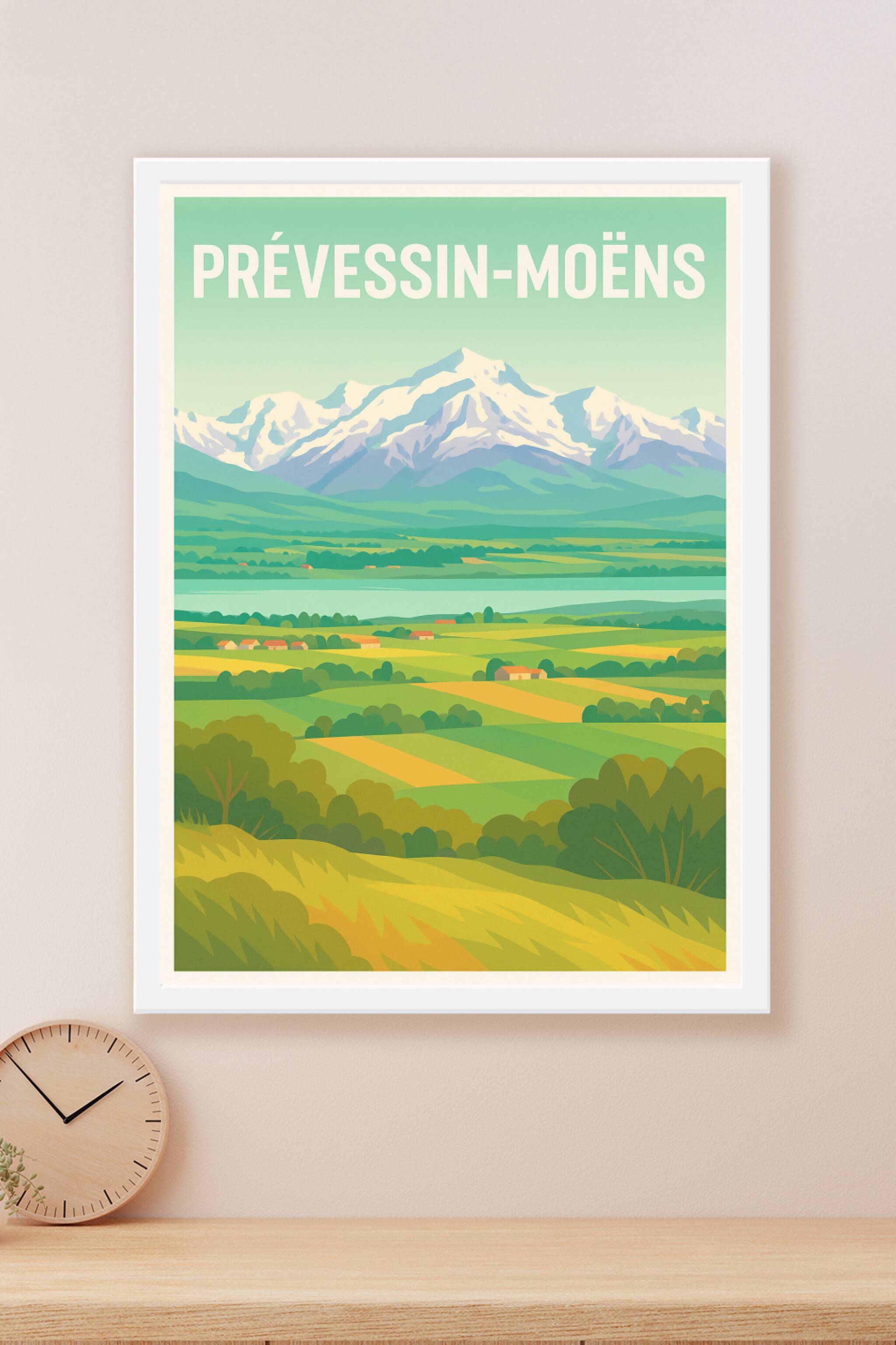 Découvrez la sérénité des paysages verdoyants et des champs baignés de lumière à Prévessin-Moëns avec cette affiche illustrée au style vintage et é...