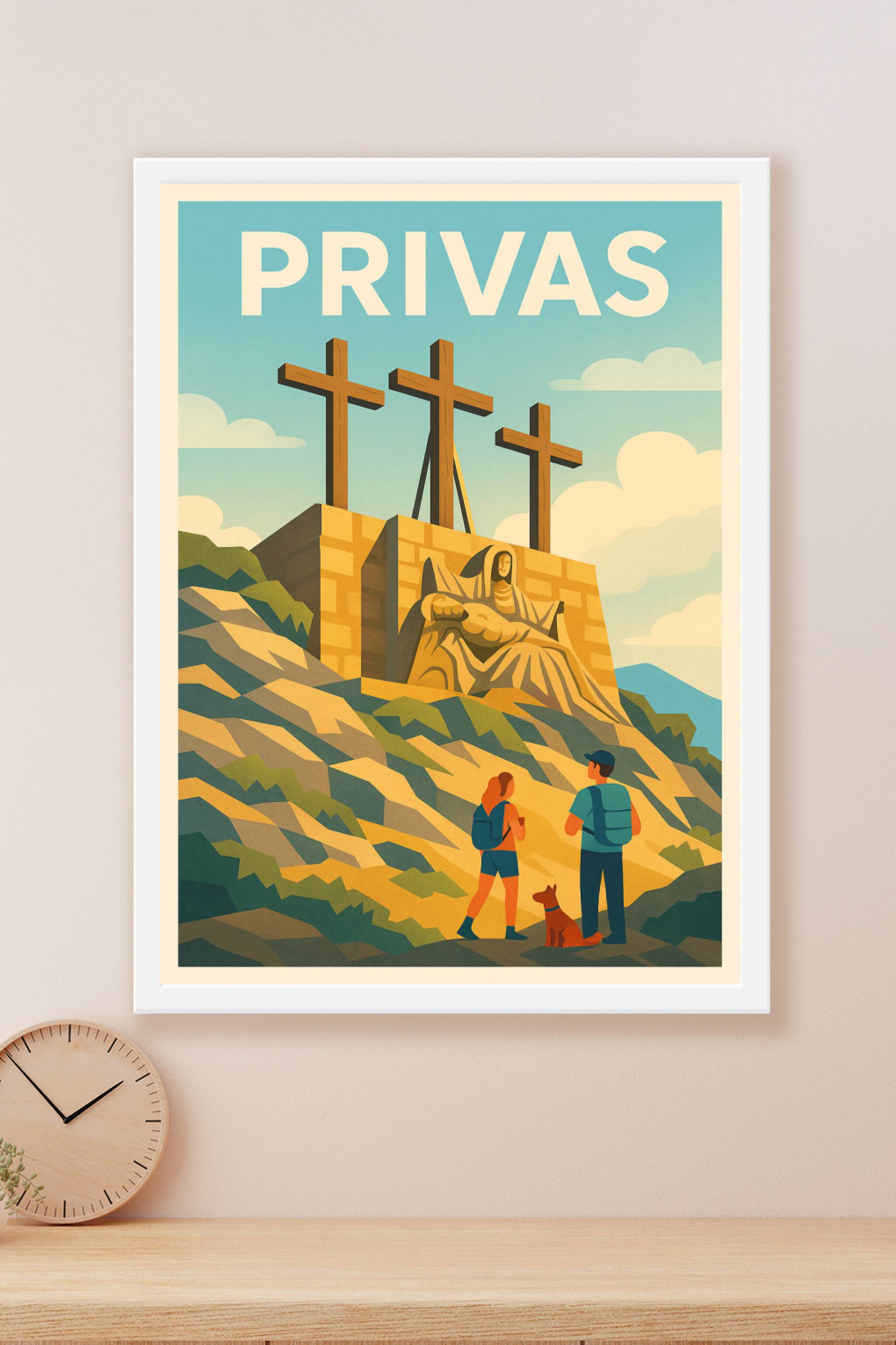 Découvrez la beauté et la sérénité de Privas à travers cette affiche illustrée représentant le célèbre monument aux trois croix et la pietà, symbol...