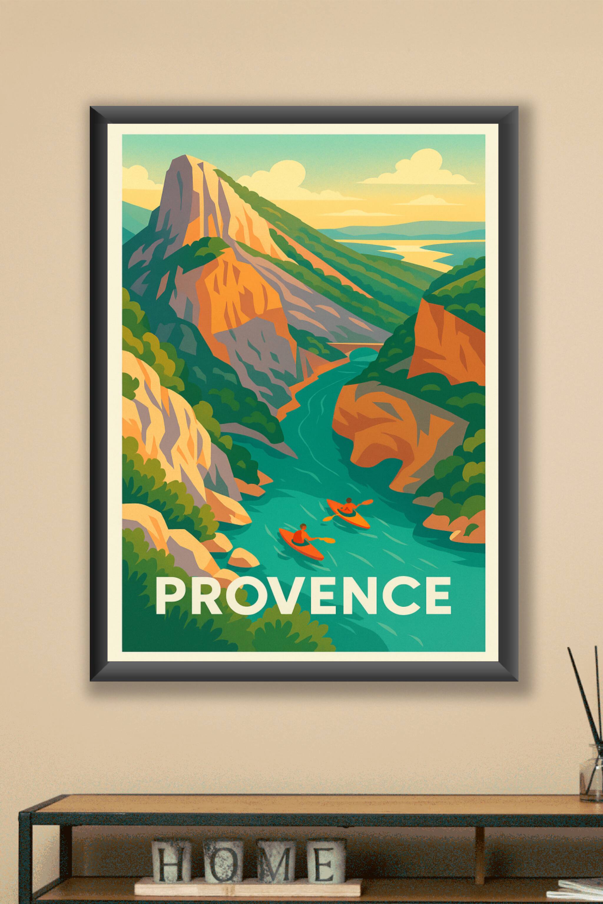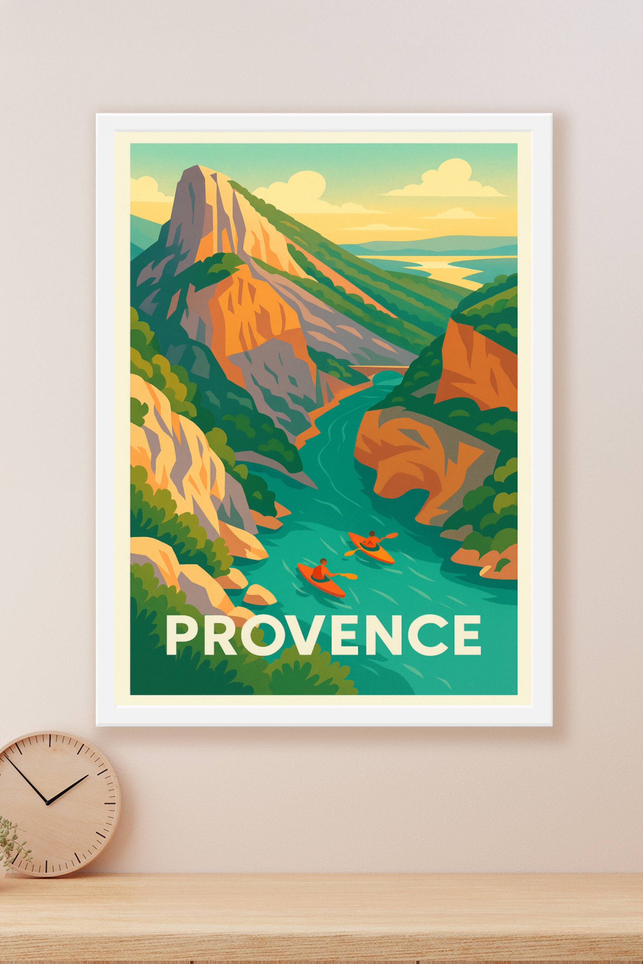 Découvrez la beauté sauvage et éclatante de la Provence avec cette affiche illustrée représentant deux kayakistes naviguant sur une rivière turquoi...