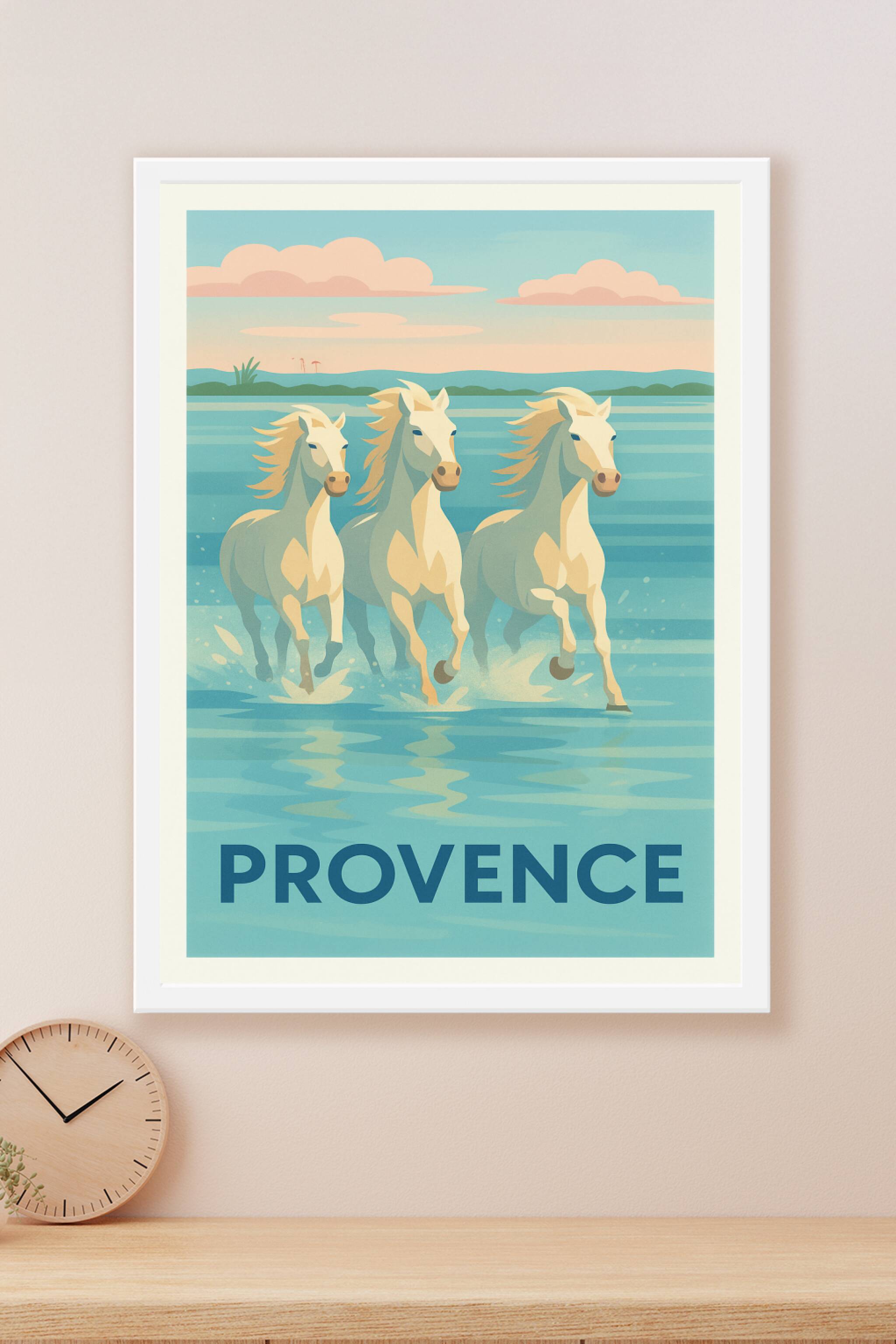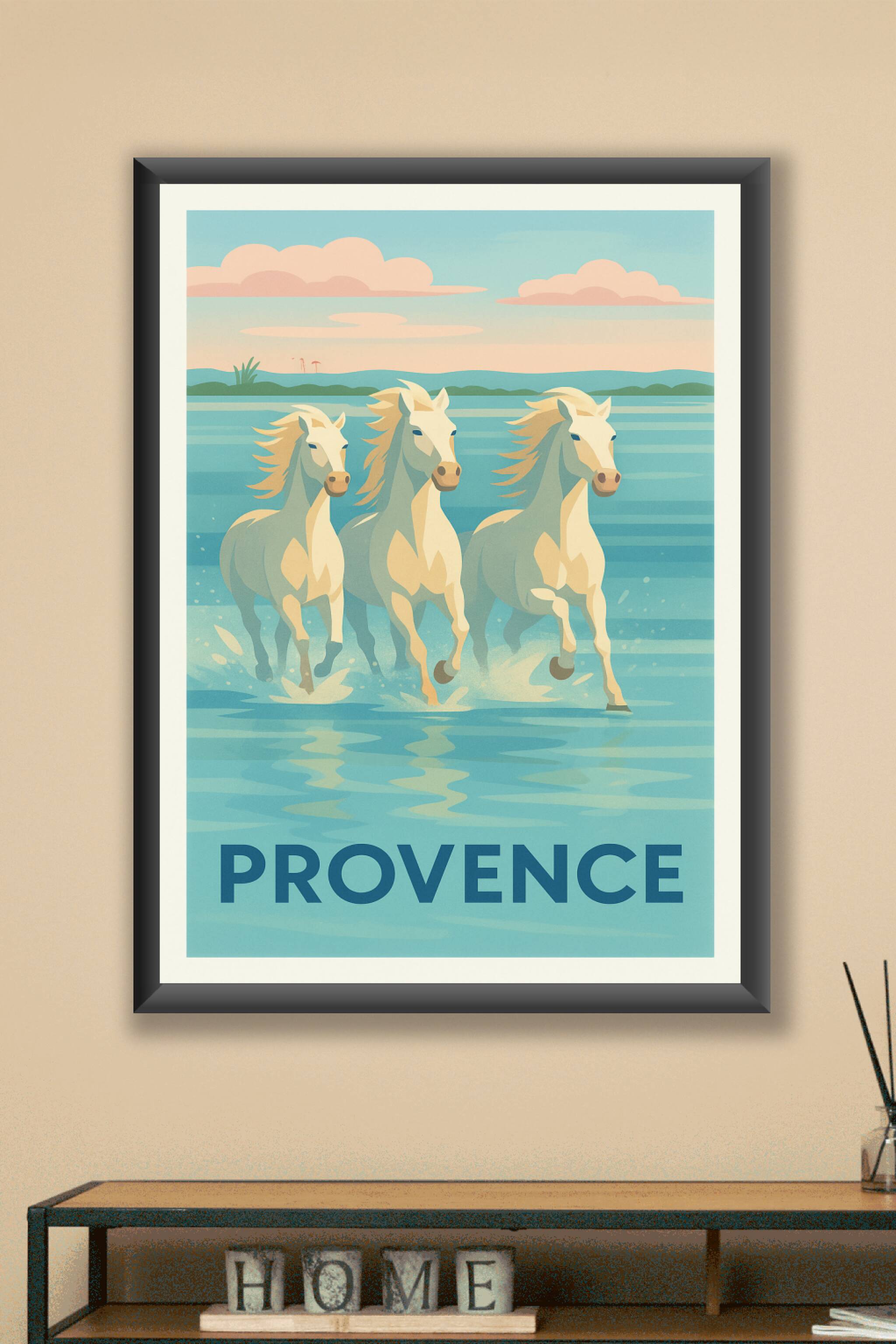Découvrez toute la beauté sauvage et l'élégance de la Provence avec cette affiche illustrant trois chevaux blancs courant dans les eaux calmes de l...