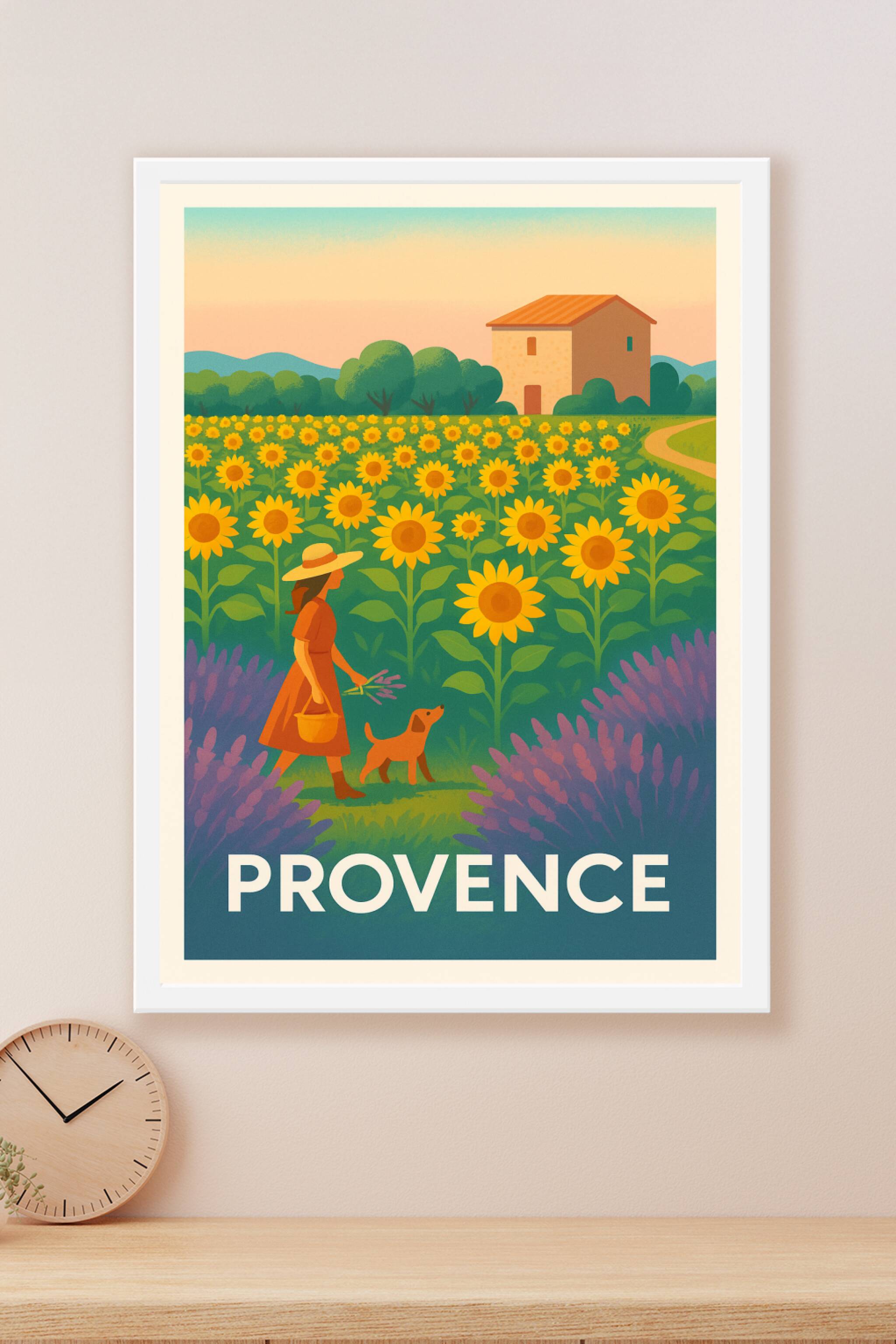 Découvrez la douceur de vivre en Provence avec cette affiche illustrée, mettant en scène un champ de tournesols baigné par la lumière dorée du crépuscule. Une femme en robe vintage flâne accompagnée de son chien, symbolisant la sérénité et la beauté naturelle de cette région emblématique.Ce poster est imprimé en tirage "Fine Art" sur un papier 305g coton de haute qualité, assurant une reproduction fidèle des couleurs et une durabilité exceptionnelle. Disponible en formats A1 à A4, avec ou sans cadre, cette affiche apportera une touche chaleureuse et authentique à votre intérieur.Profitez d'une impression premium 100% made in France pour embellir votre décoration ou offrir un cadeau original aux admirateurs de la Provence.