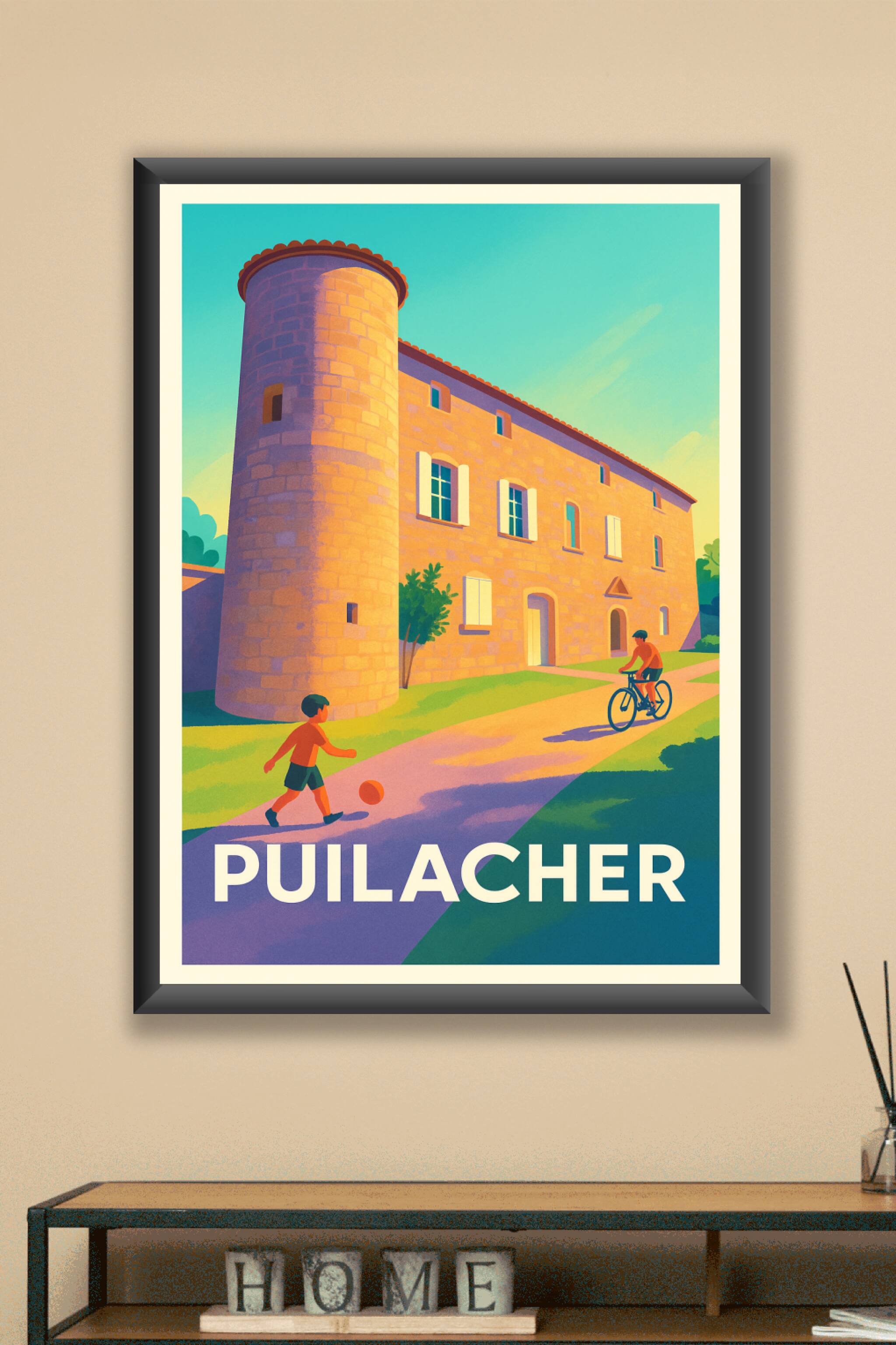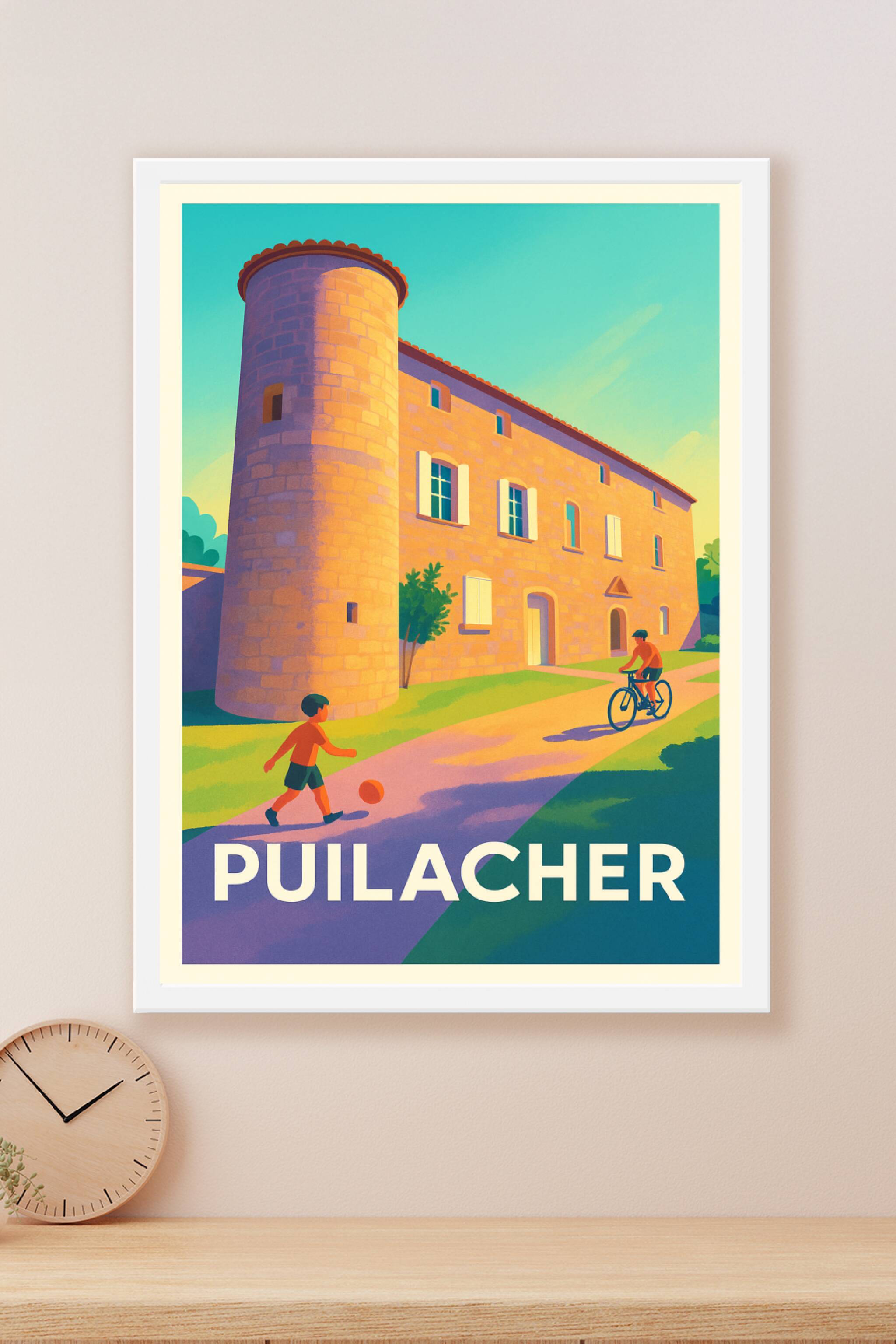 Découvrez l'ambiance paisible et ensoleillée de Puilacher à travers cette affiche illustrée qui met en scène un bâtiment historique baigné de lumiè...
