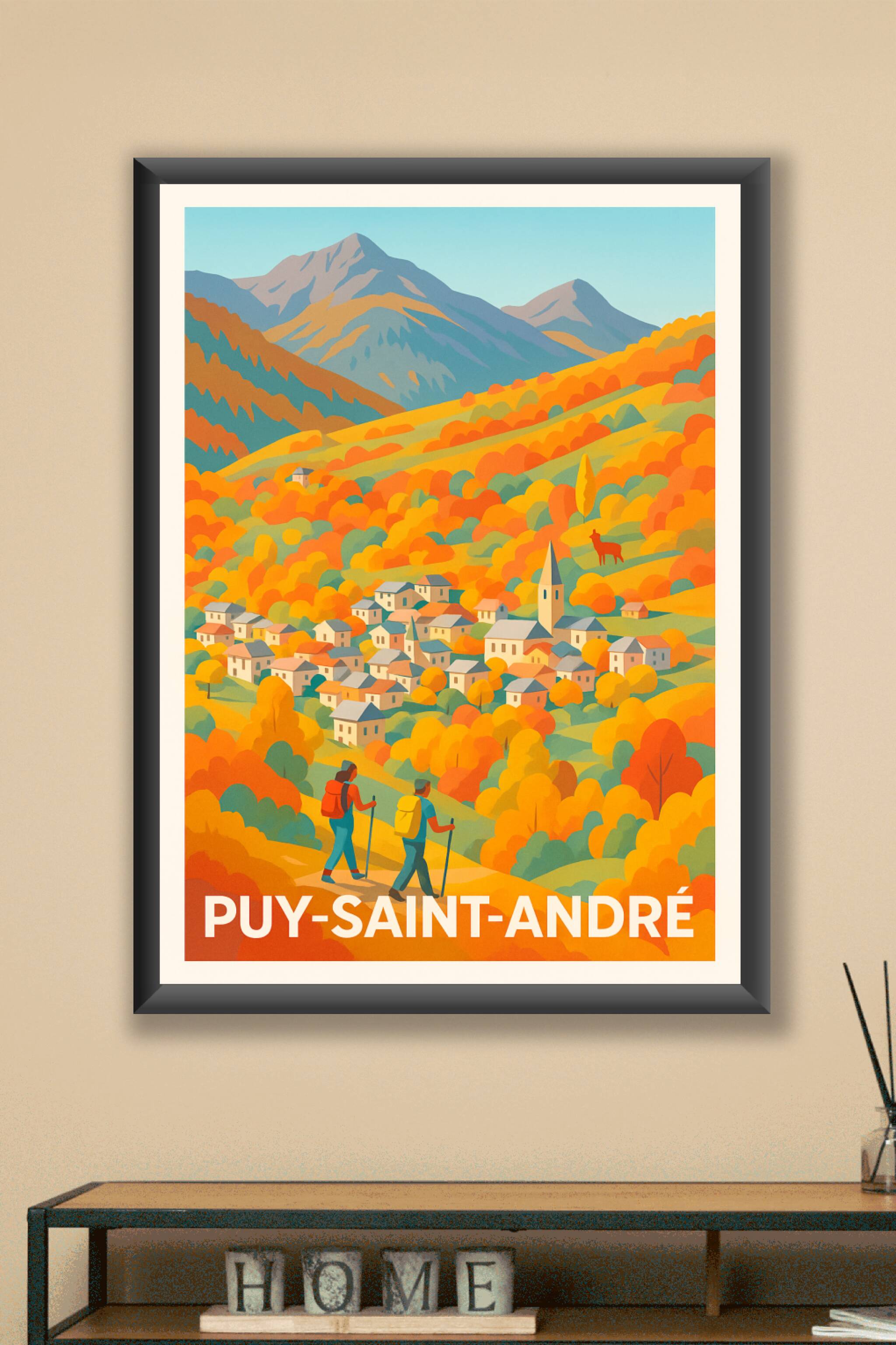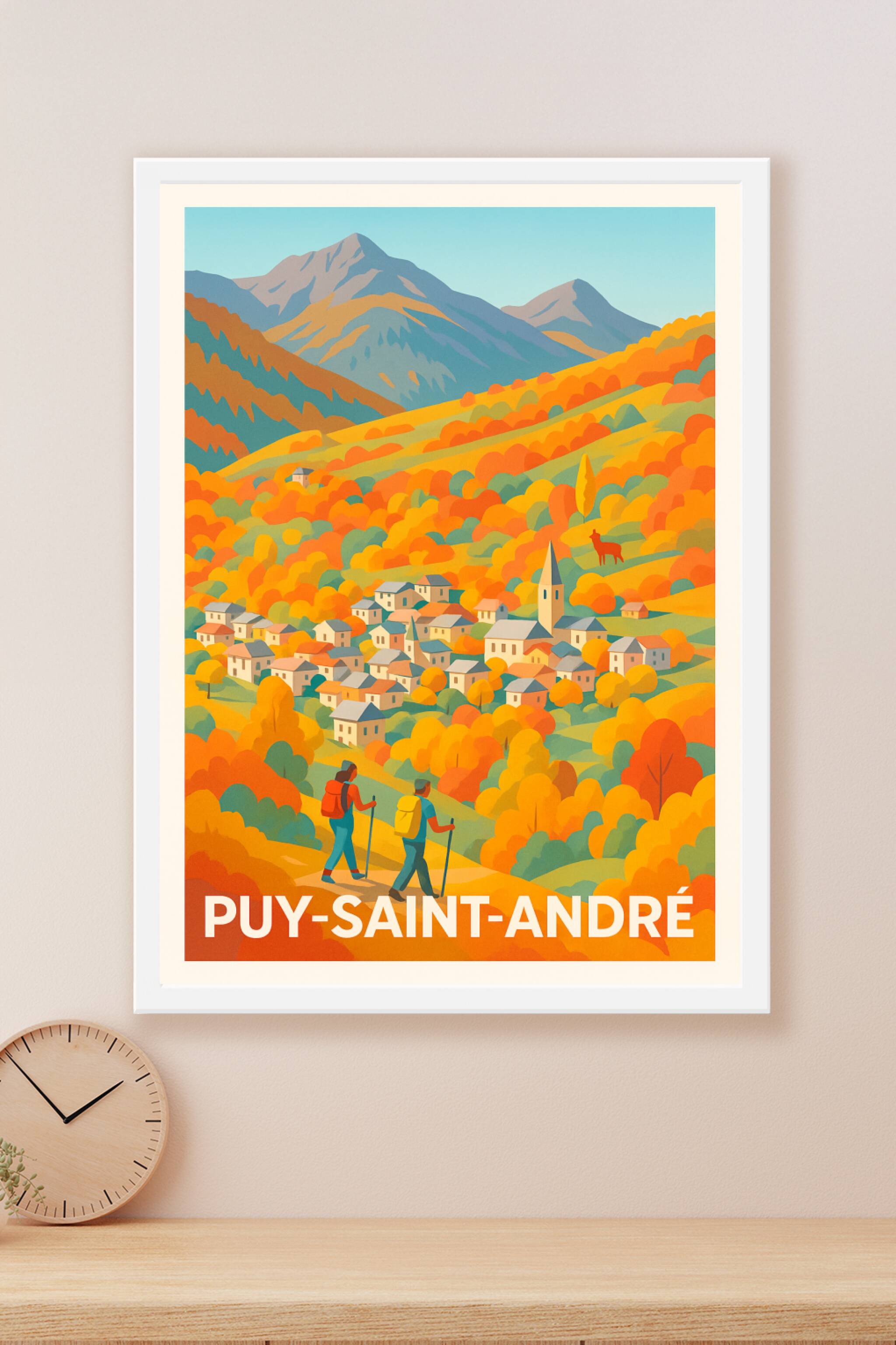 Découvrez le charme authentique de Puy-Saint-André avec cette affiche illustrée qui capture l'essence des montagnes enflammées par les couleurs cha...