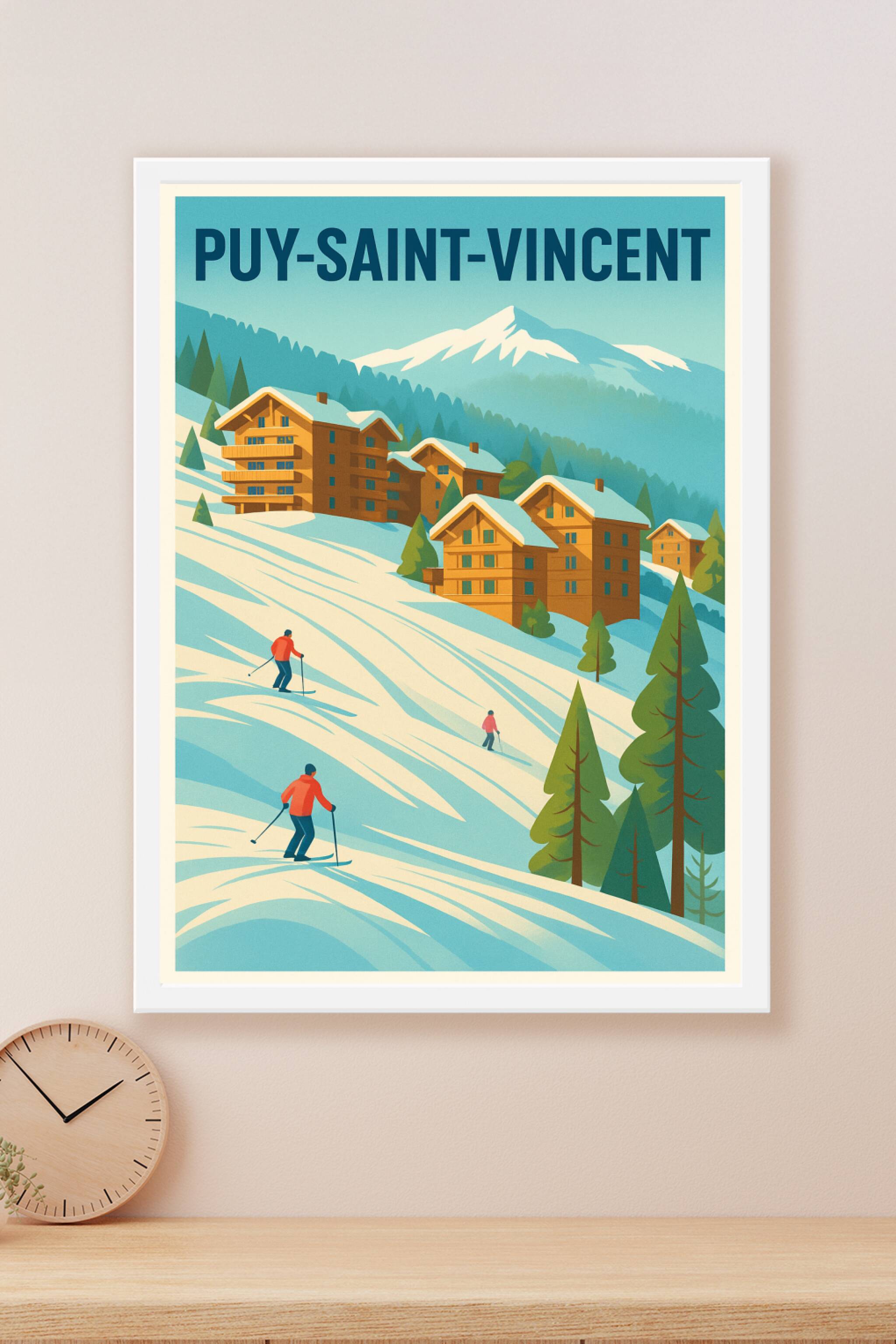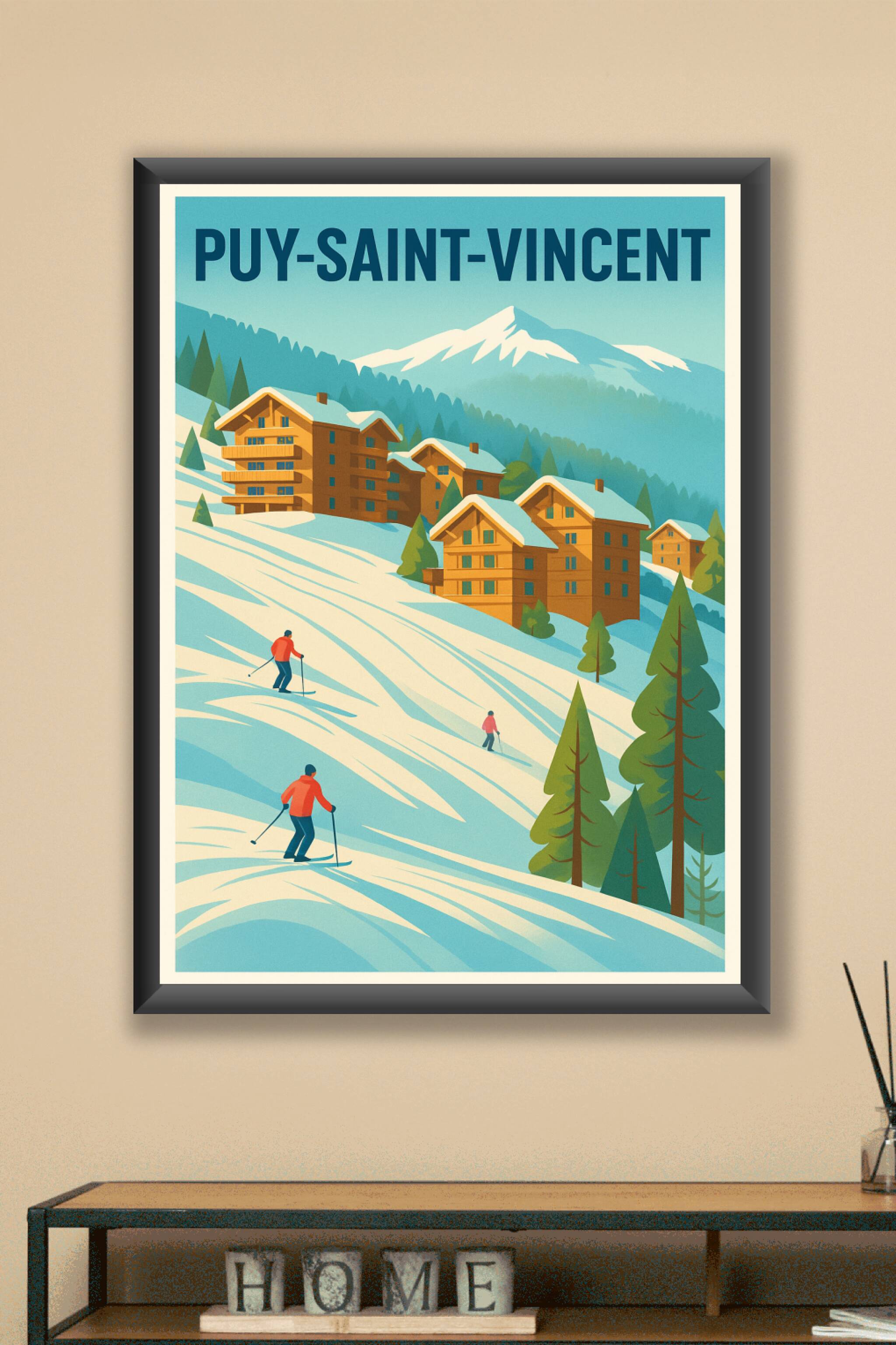 Offrez-vous une escapade hivernale à travers cette affiche retro qui capture l'essence chaleureuse de Puy-Saint-Vincent, station de ski nichée au c...