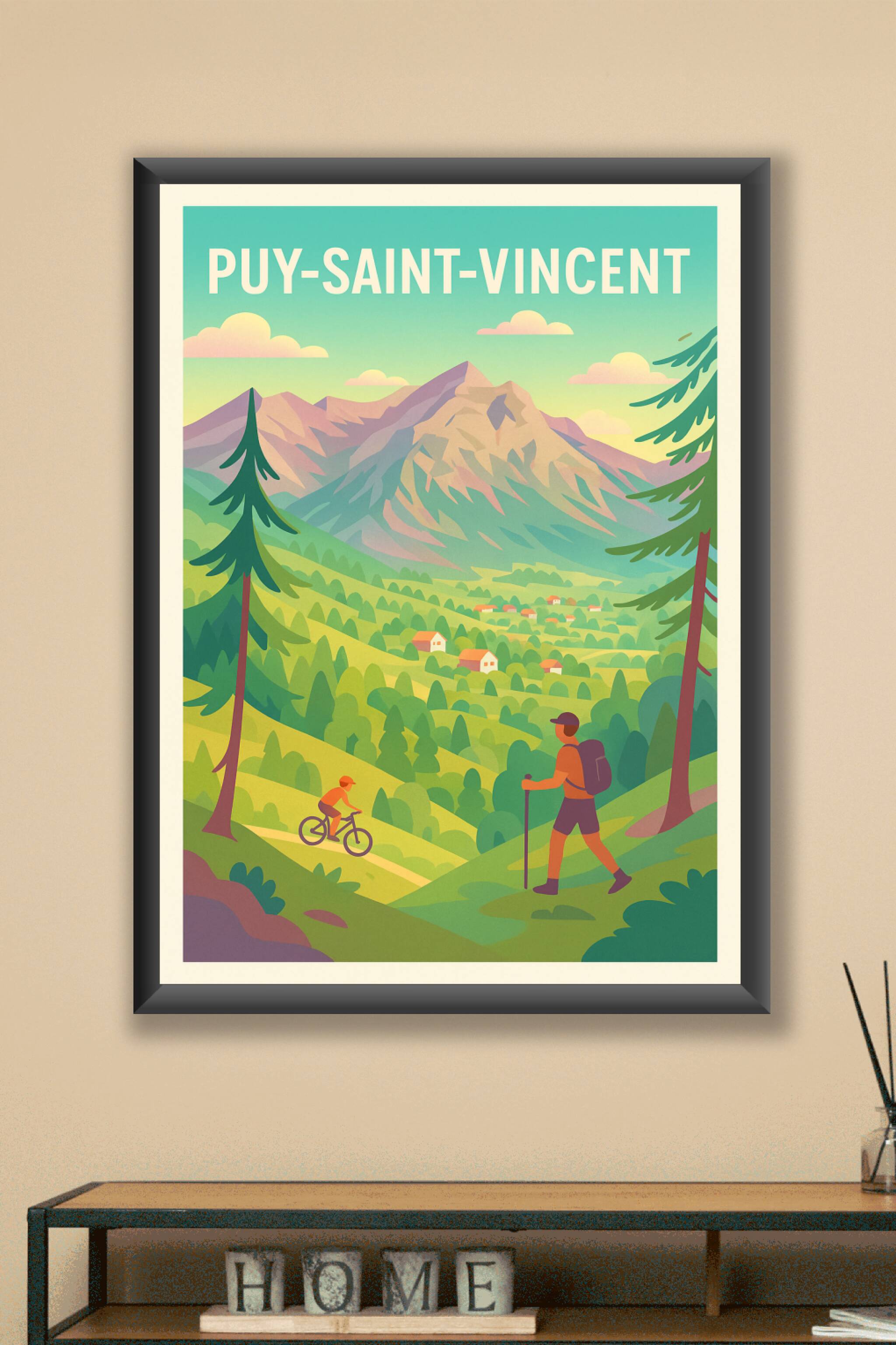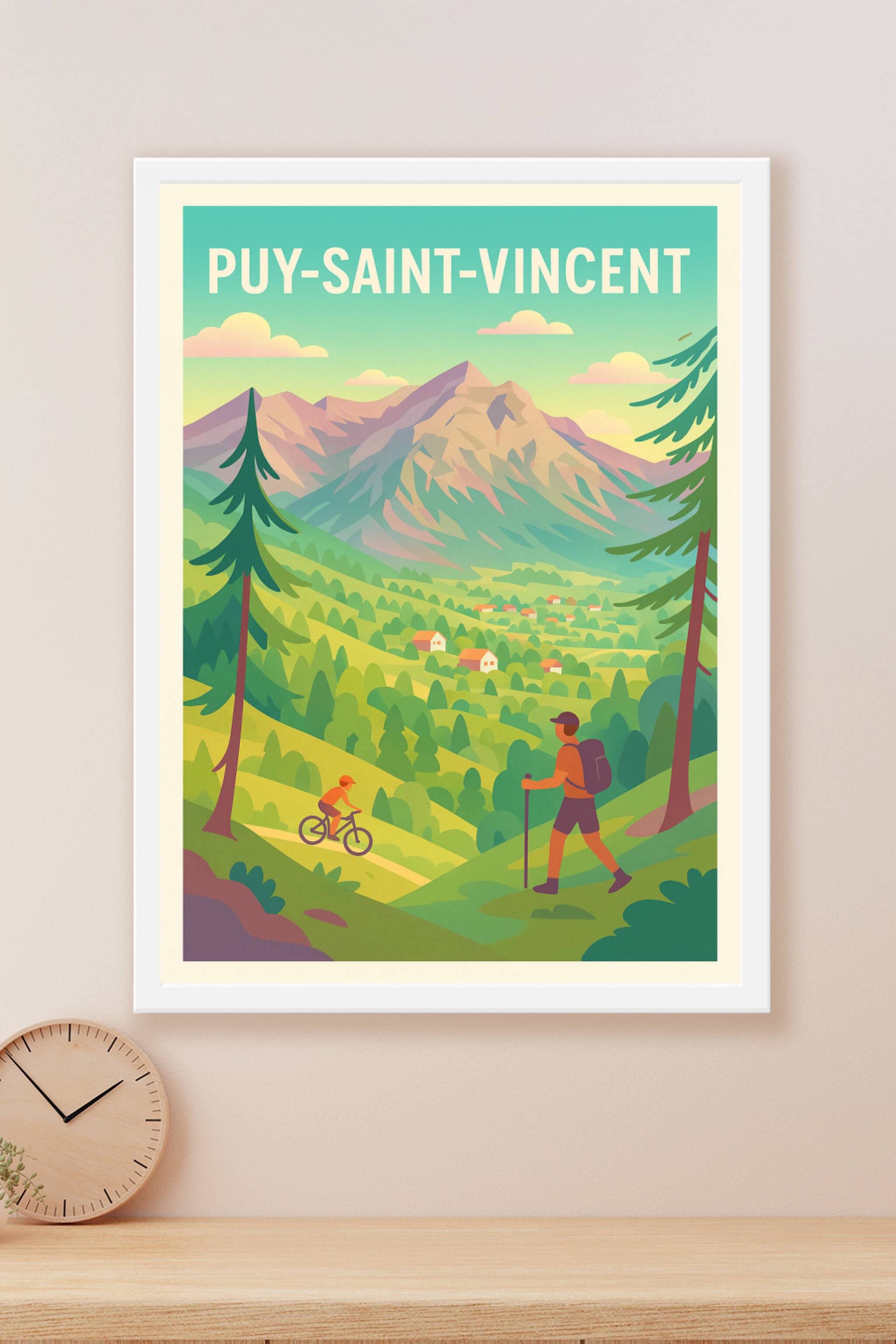 Découvrez la beauté sereine du Puy-Saint-Vincent à travers cette affiche illustrée mettant en scène une randonnée et une balade à vélo au cœur d’un paysage montagnard verdoyant. Ce poster évoque parfaitement l’esprit d’aventure et de détente qu’offre cette destination alpine. Imprimée en tirage "Fine Art" sur papier 305g coton, cette affiche garantit une qualité d’impression exceptionnelle et durable. Elle est disponible en formats A1 à A4, avec ou sans cadre, idéale pour sublimer votre intérieur ou offrir un souvenir élégant aux amoureux de la nature et de la montagne. Offrez-vous une pièce d’art accessible, 100% fabriquée en France.
