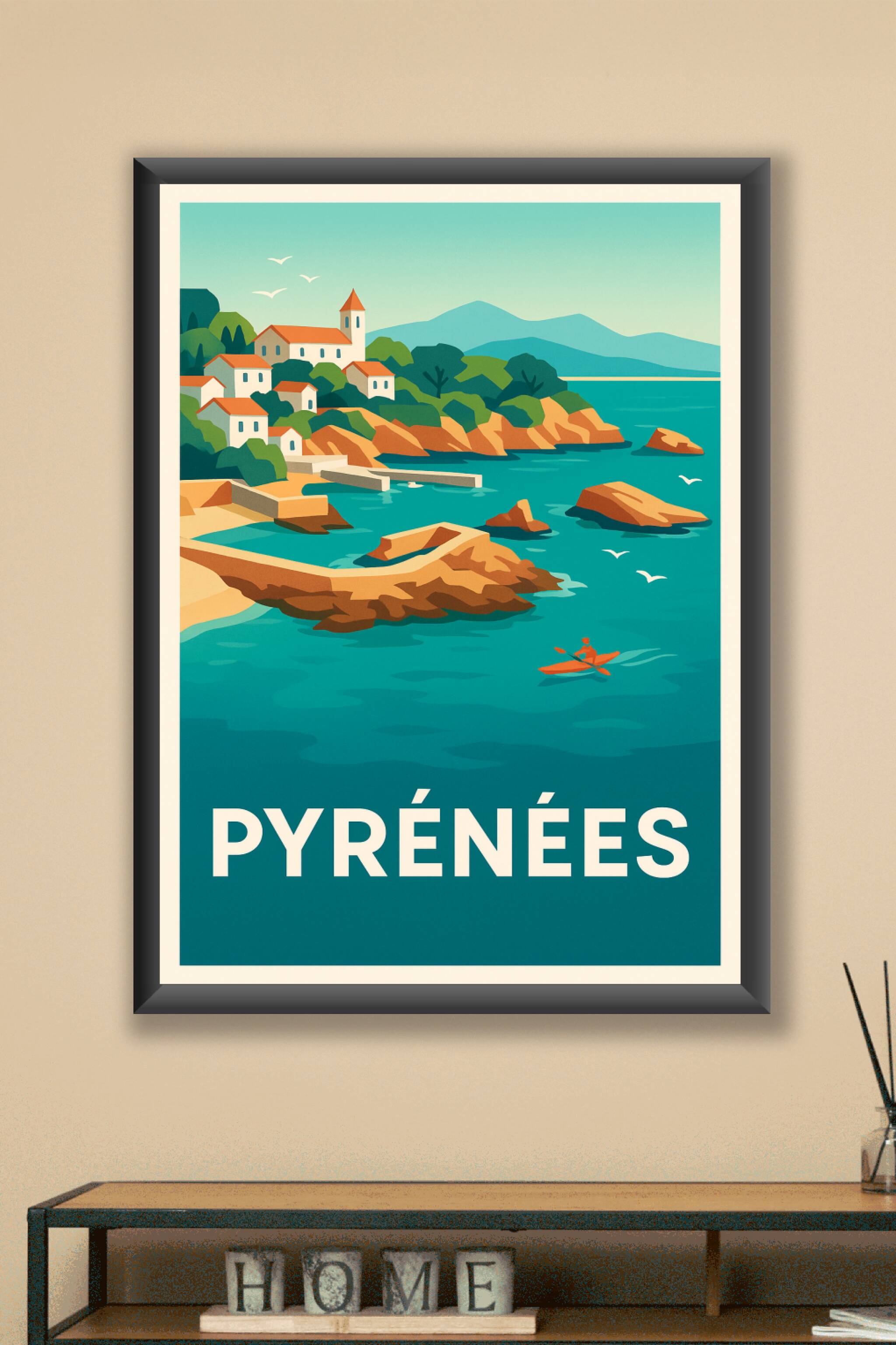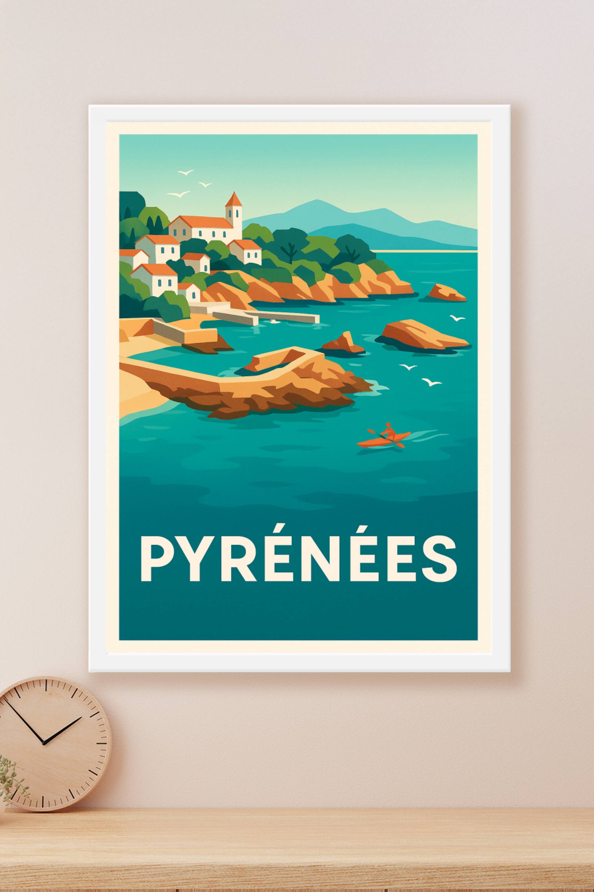 Découvrez la fraîcheur et la sérénité du littoral des Pyrénées avec cette affiche au style vintage et coloré. Cette scène marine, rehaussée de mais...