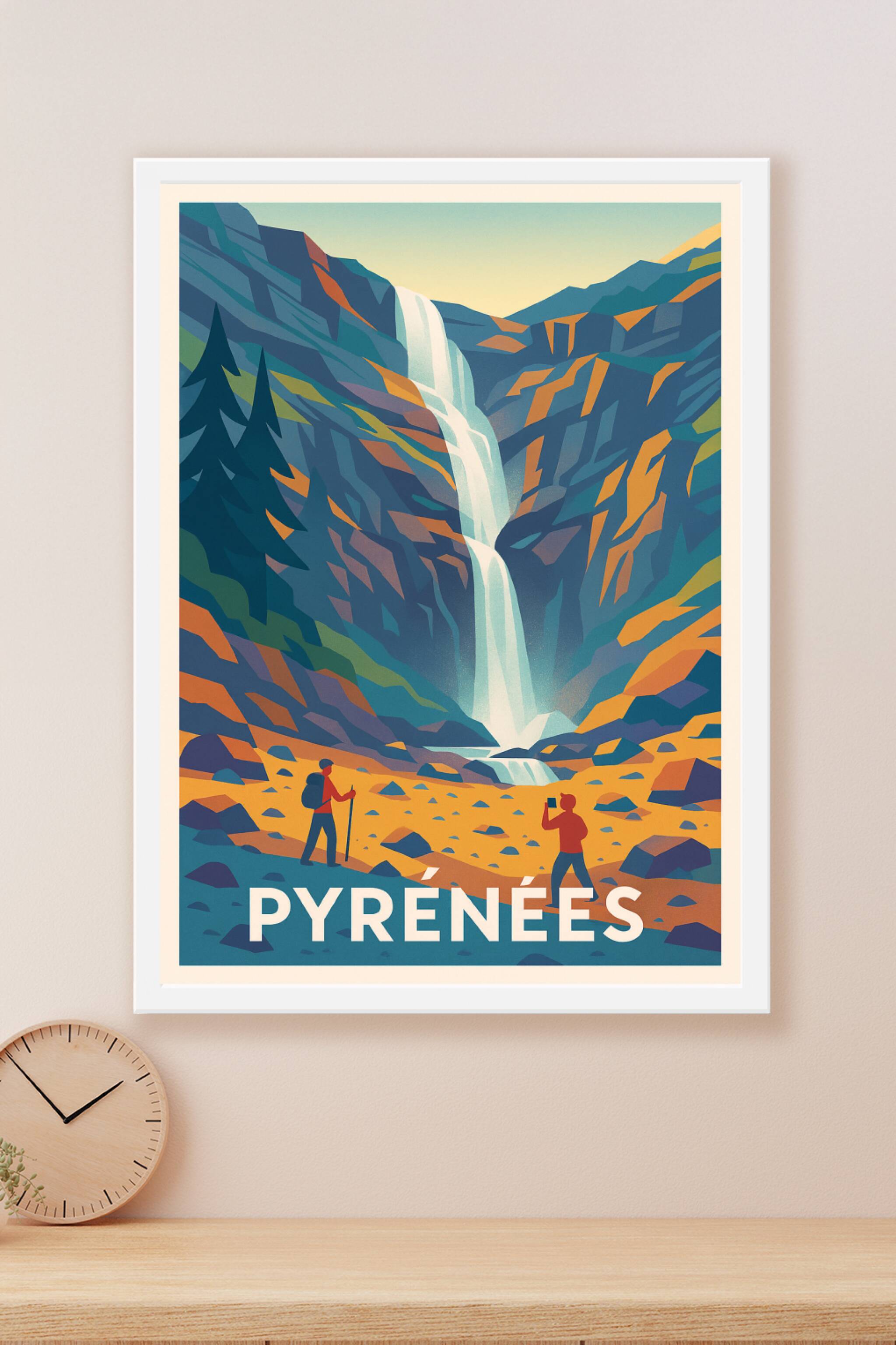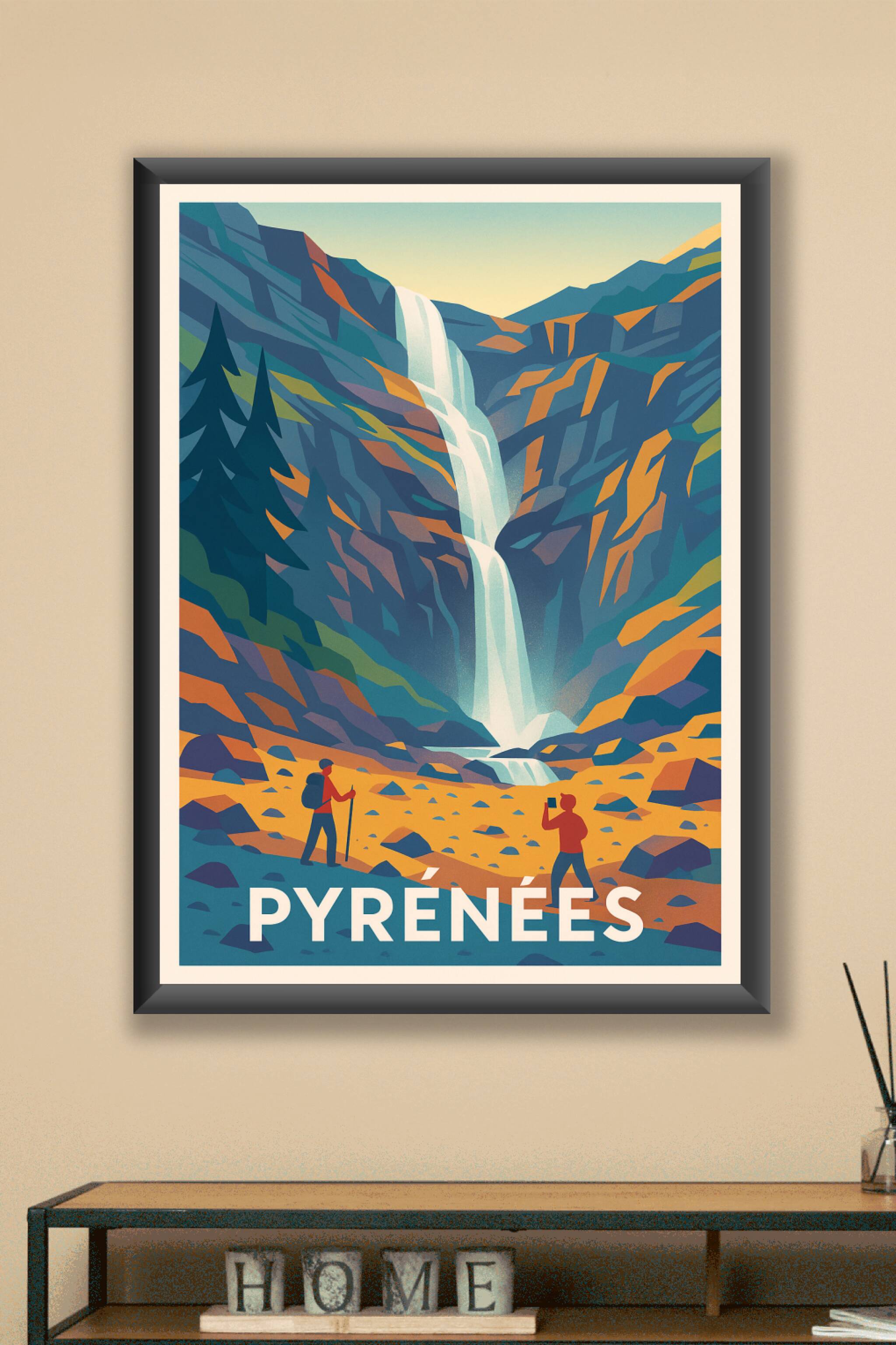 Découvrez la puissance et la beauté sauvage des Pyrénées avec cette affiche illustrée mettant en scène une majestueuse cascade au cœur d'un paysage...