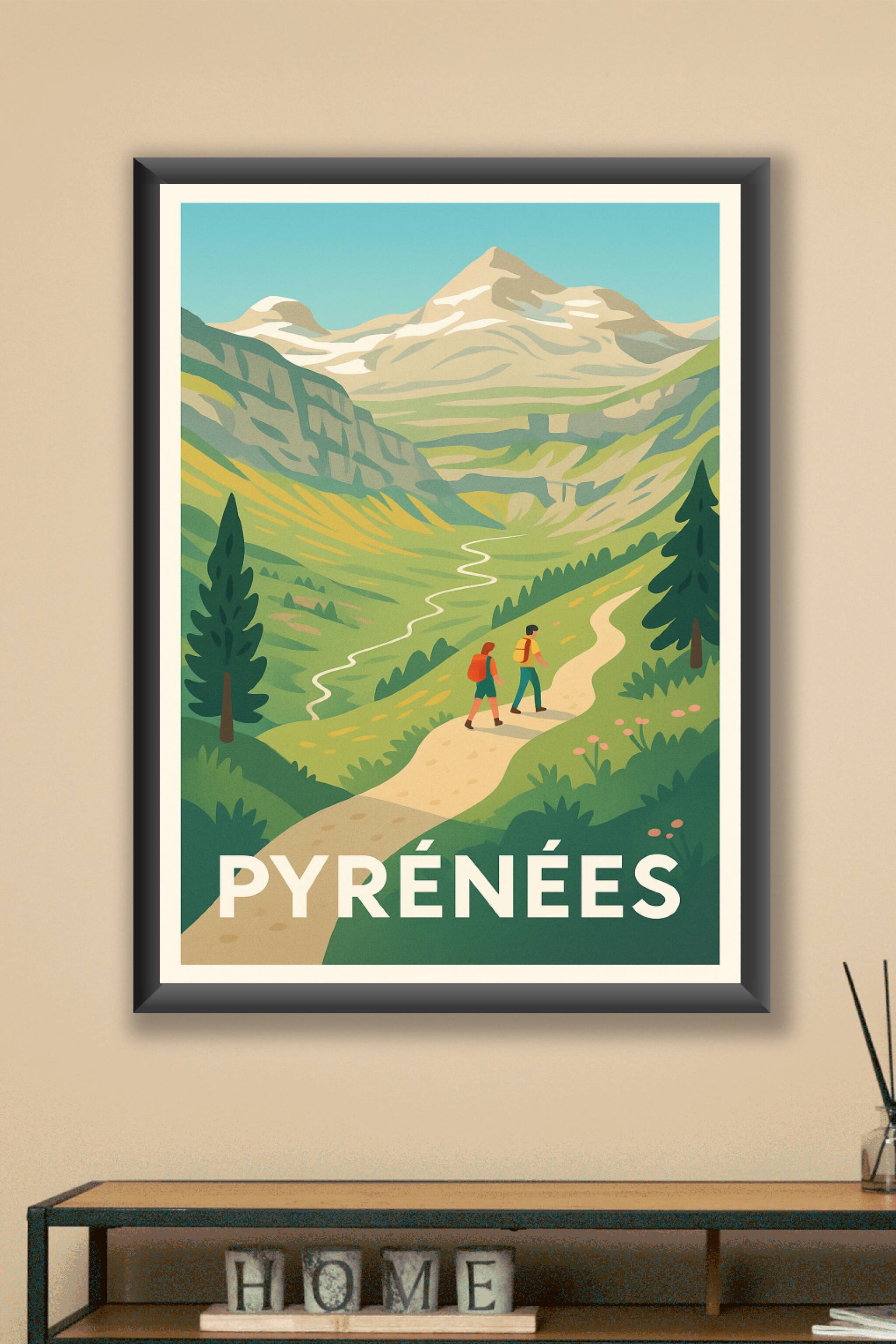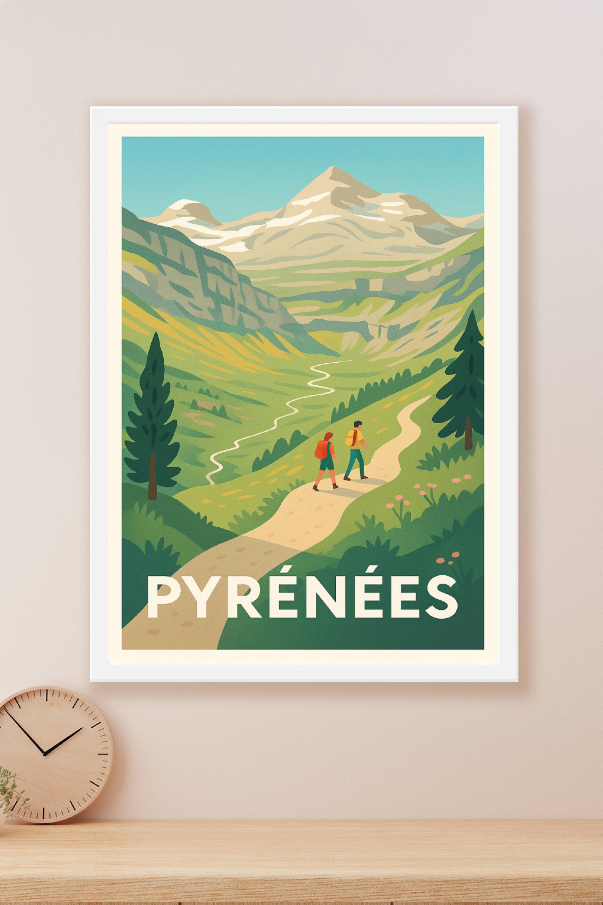 Découvrez la beauté majestueuse des Pyrénées avec cette affiche illustrée qui évoque l'aventure et la sérénité des sentiers de montagne. Ce poster ...