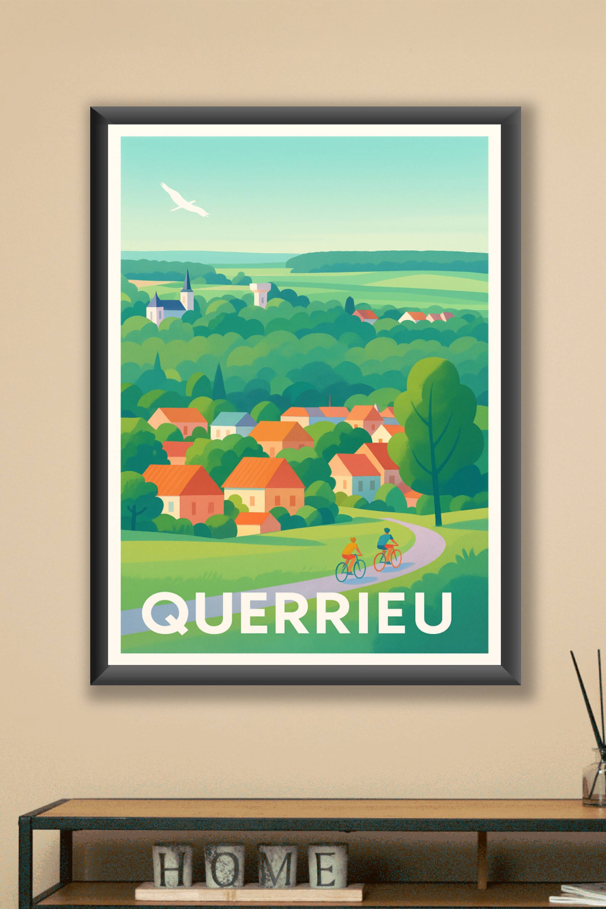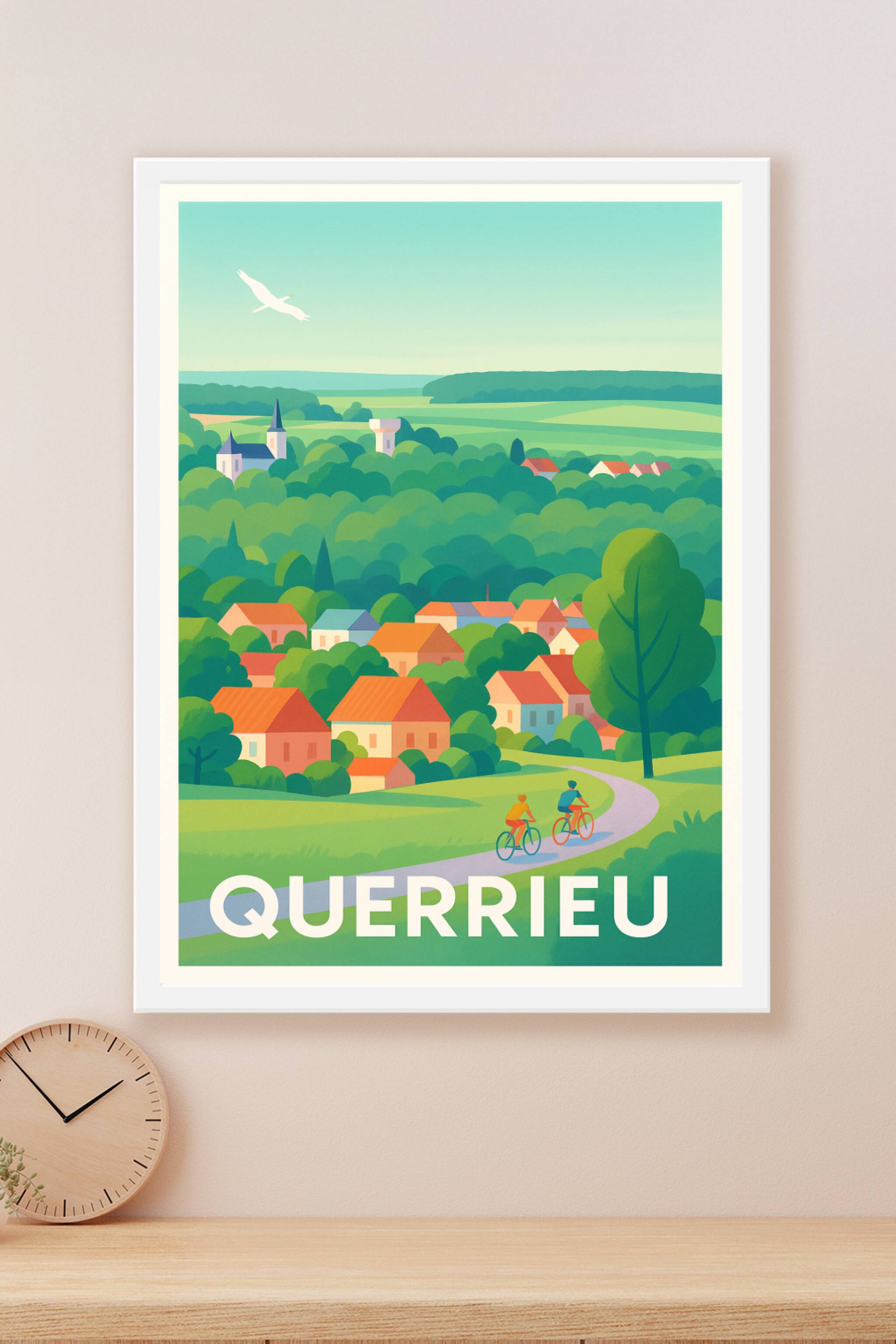 Découvrez le charme paisible de Querrieu avec cette affiche illustrée représentant un village entouré de verdure, où deux cyclistes profitent d'une...