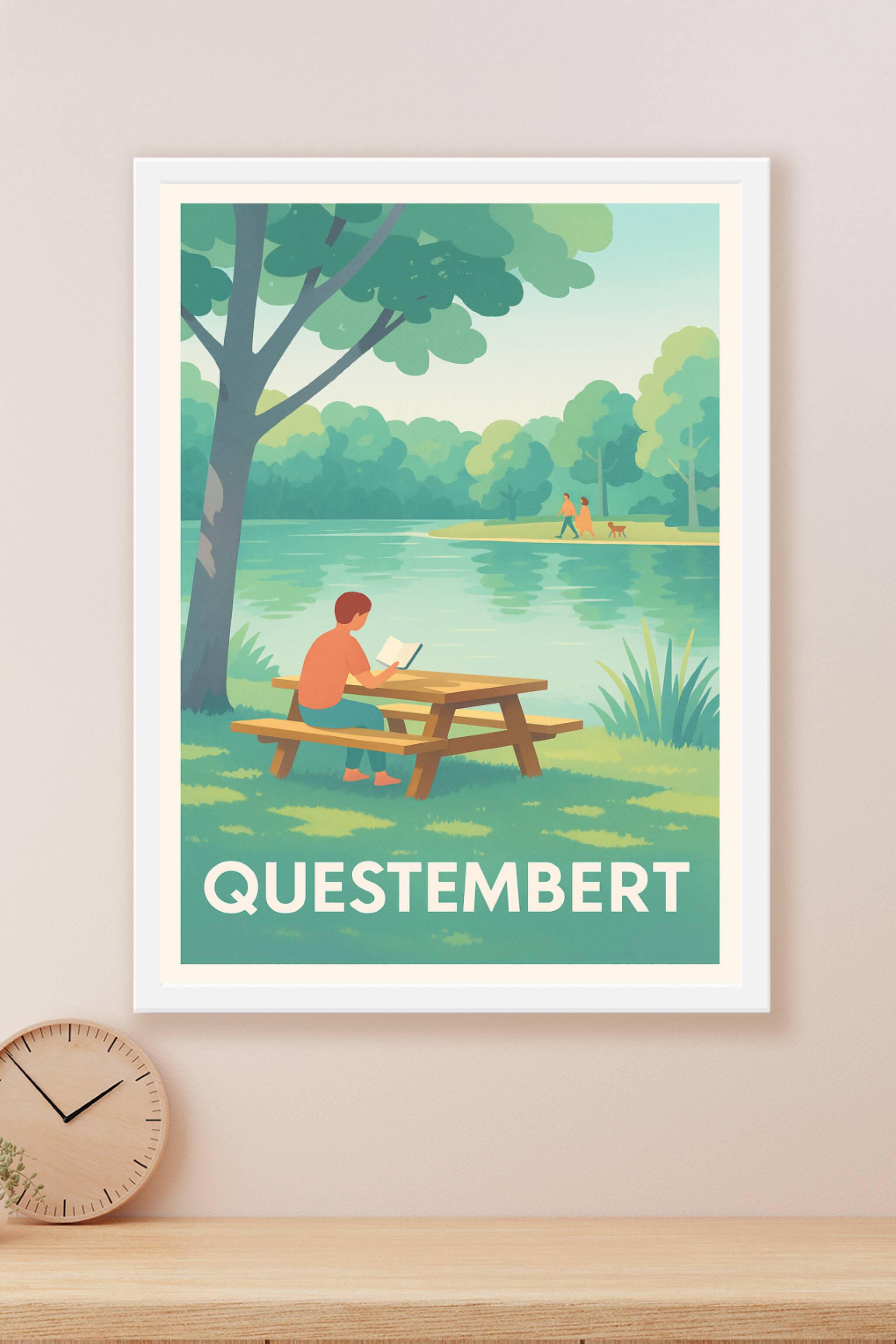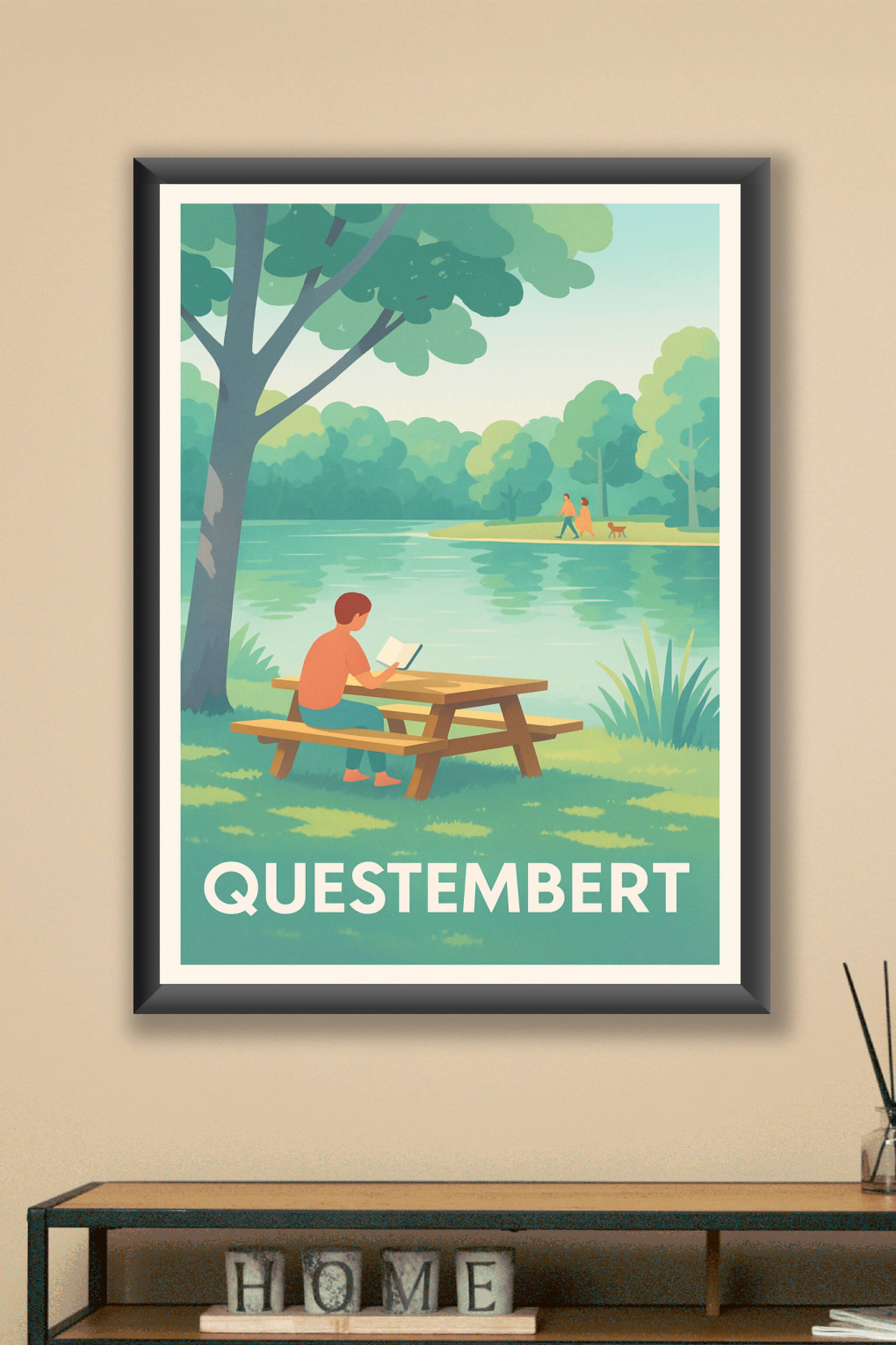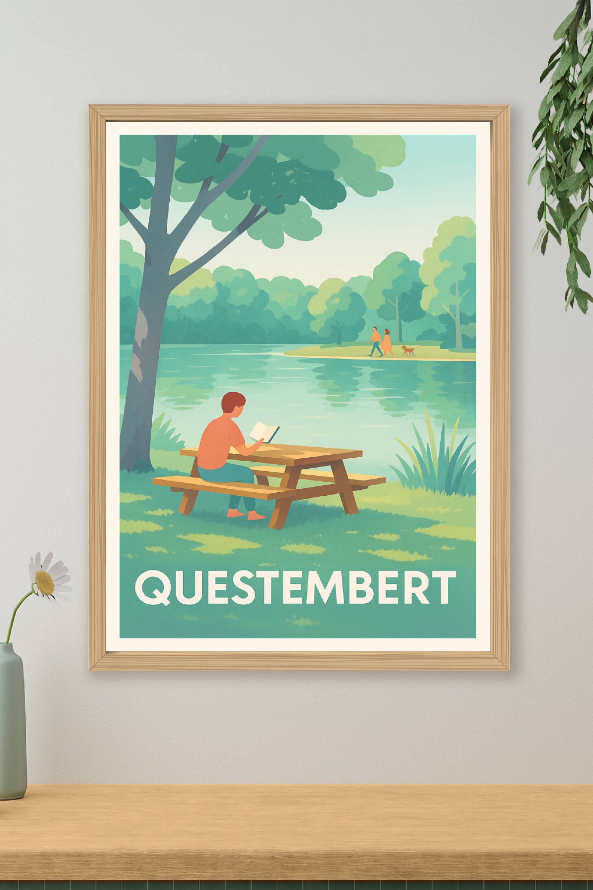Découvrez la douce quiétude de Questembert avec cette affiche illustrée mettant en scène un moment paisible au bord d’un plan d’eau. Le graphisme é...