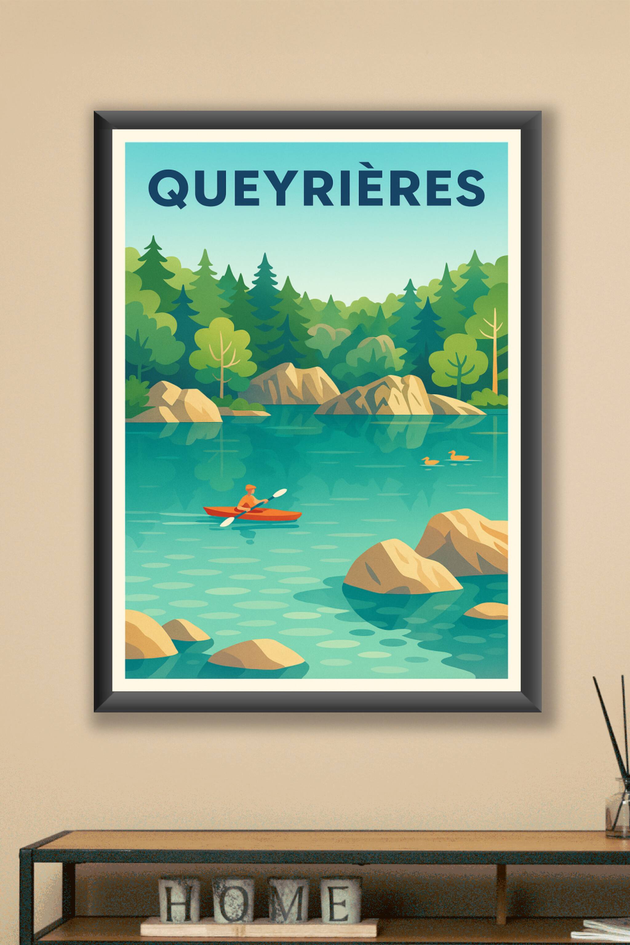 Découvrez la sérénité de Queyrières avec cette affiche illustrée qui invite à la détente au cœur d'un paysage naturel paisible. Représentant un kay...