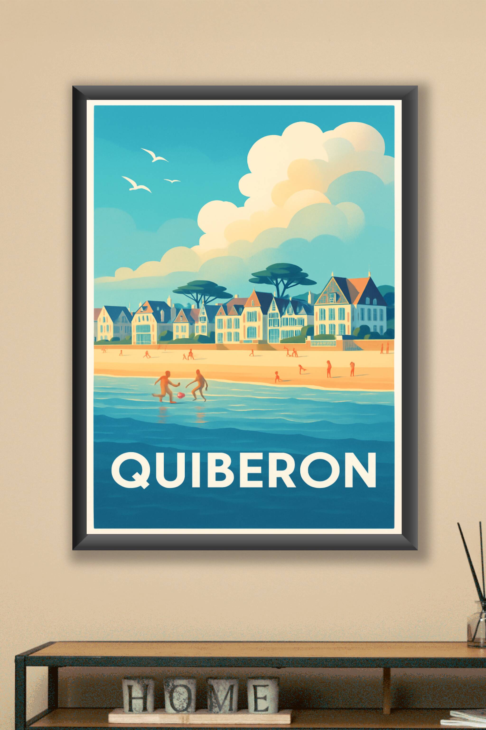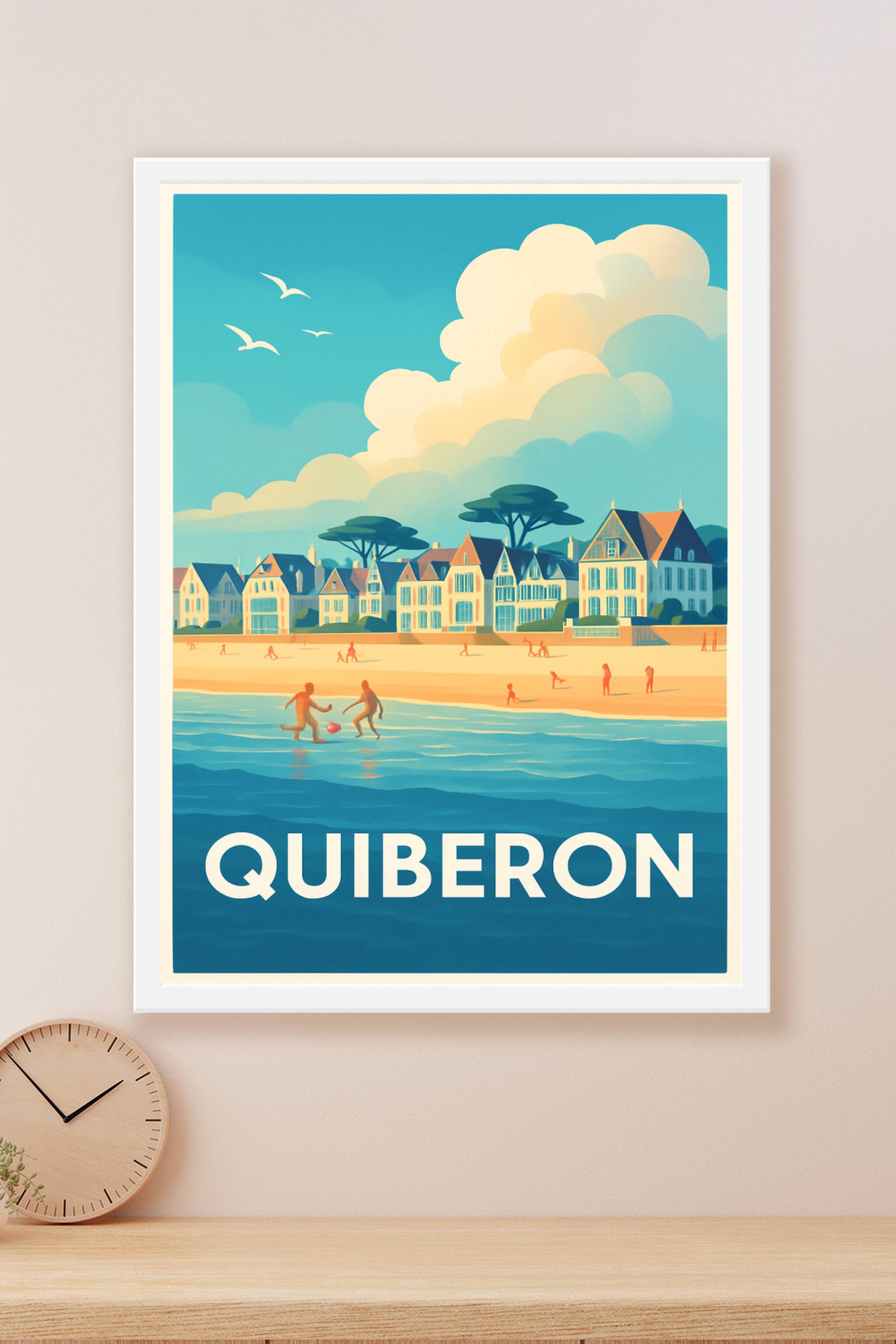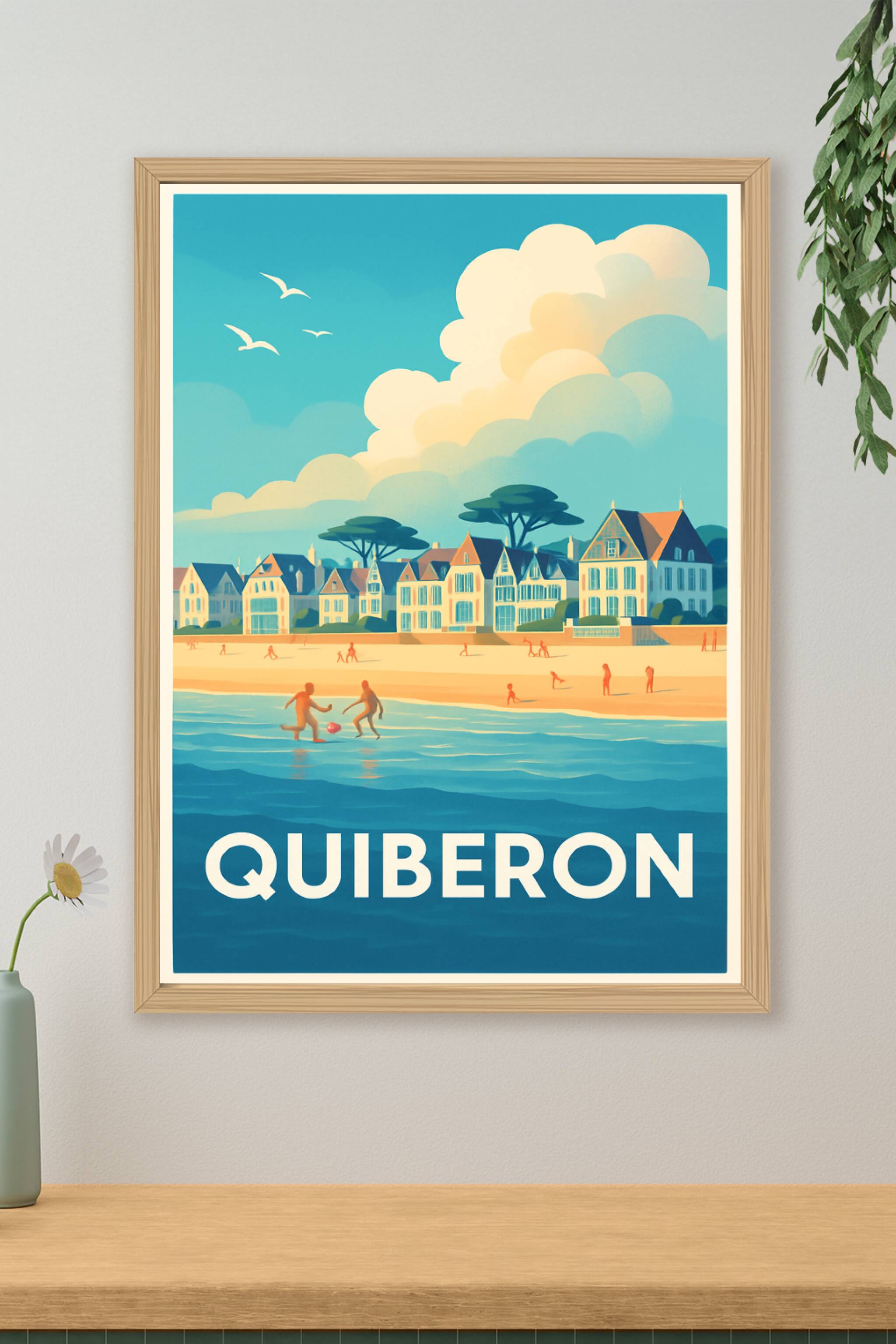 Offrez-vous une escapade visuelle à Quiberon avec cette magnifique affiche vintage illustrant la plage animée et les élégantes maisons côtières sou...