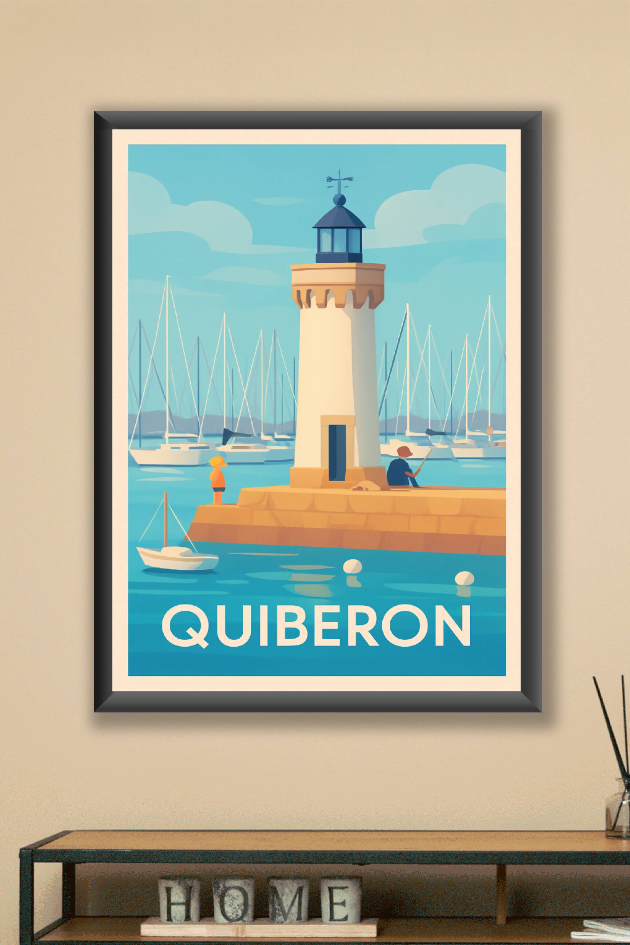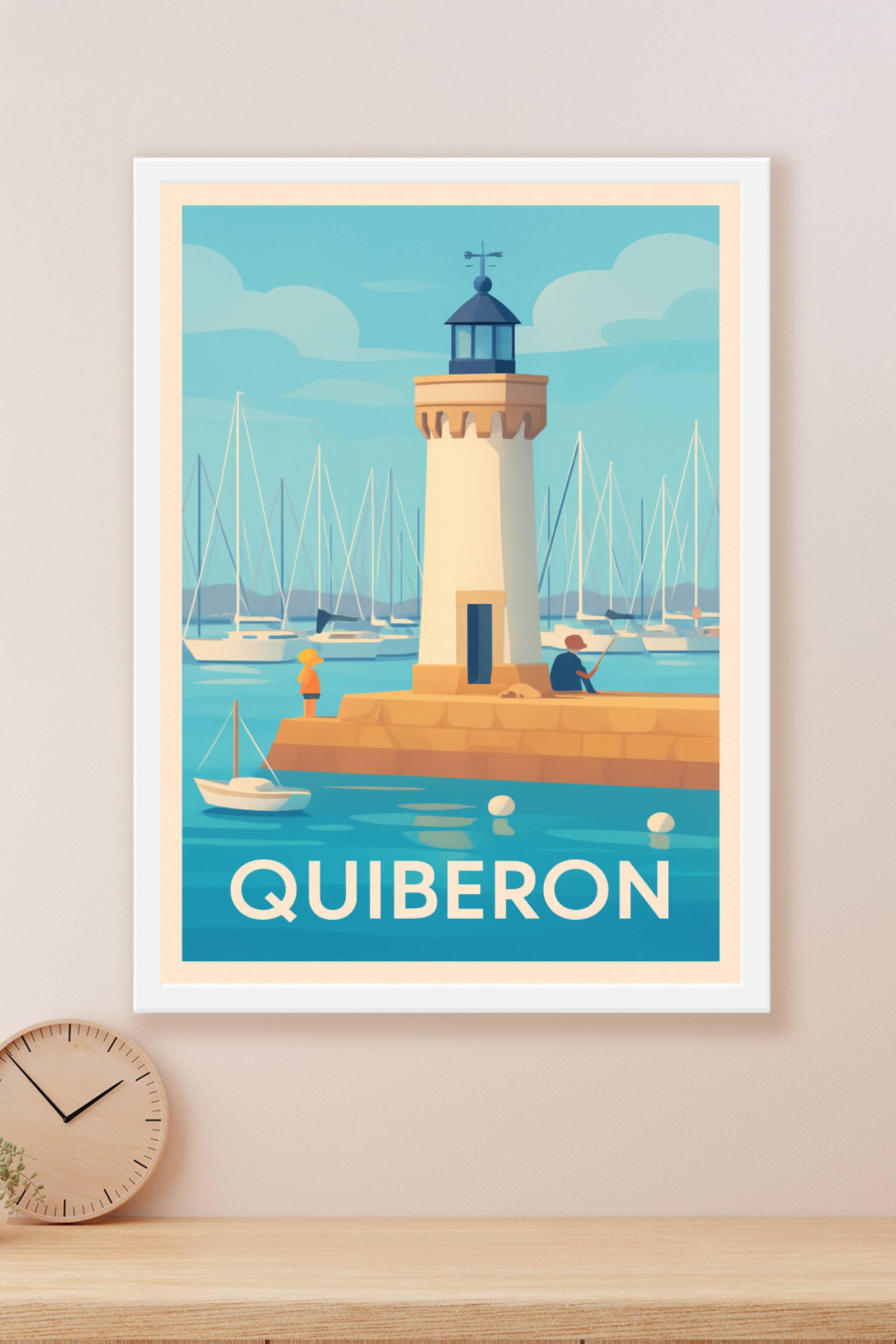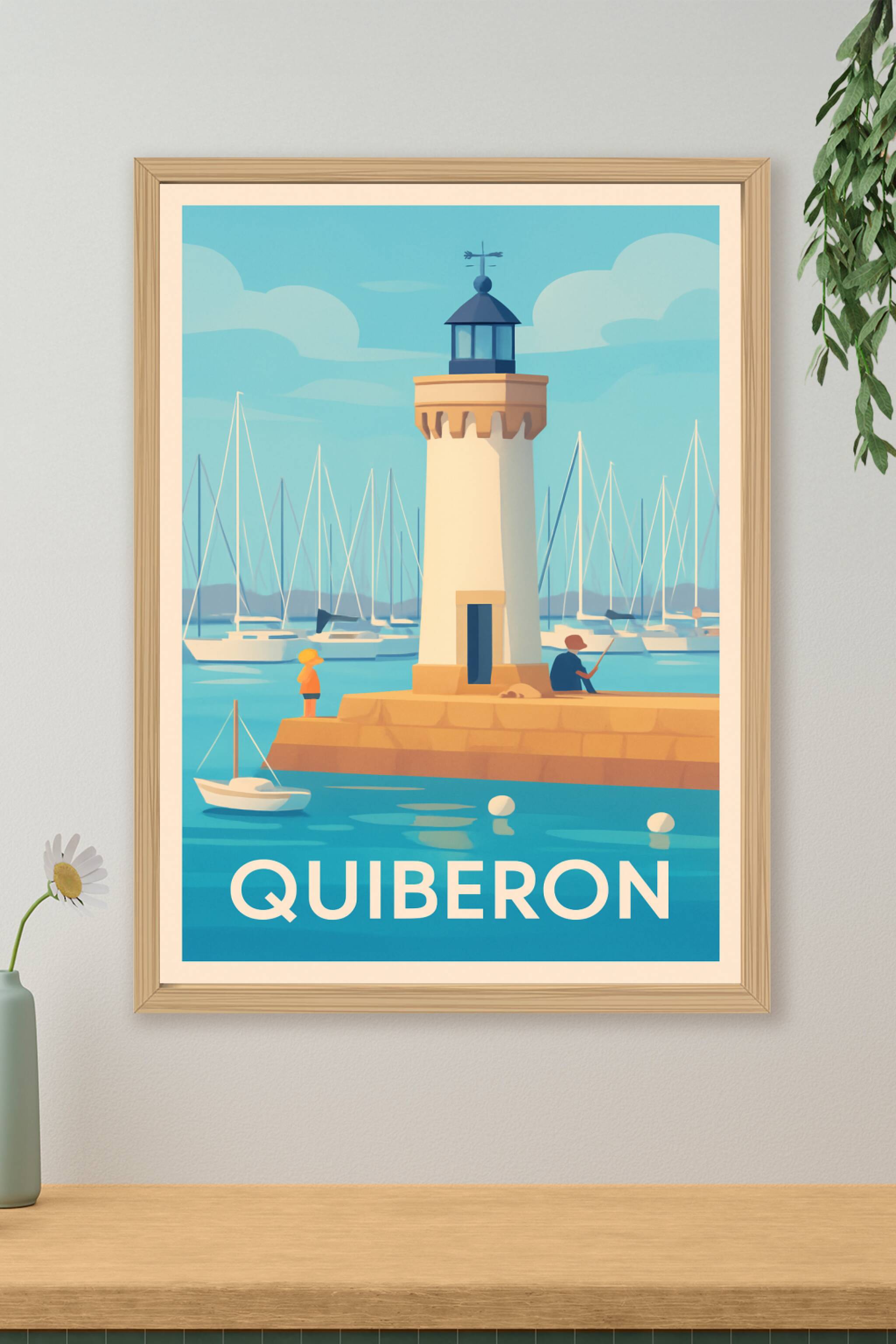 Découvrez l'atmosphère sereine du port de Quiberon avec cette affiche illustrée mettant en avant un phare emblématique et les voiliers en arrière-p...