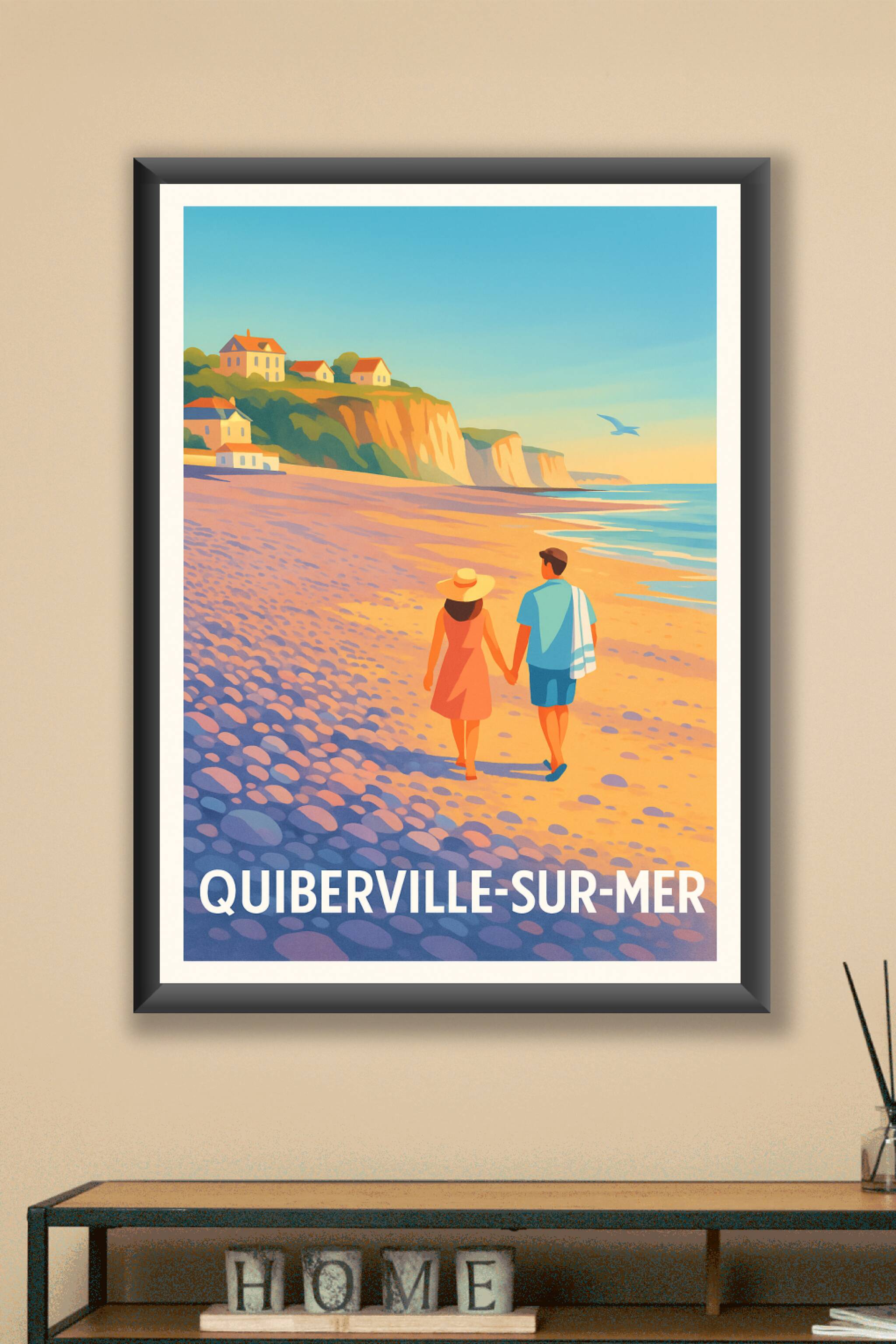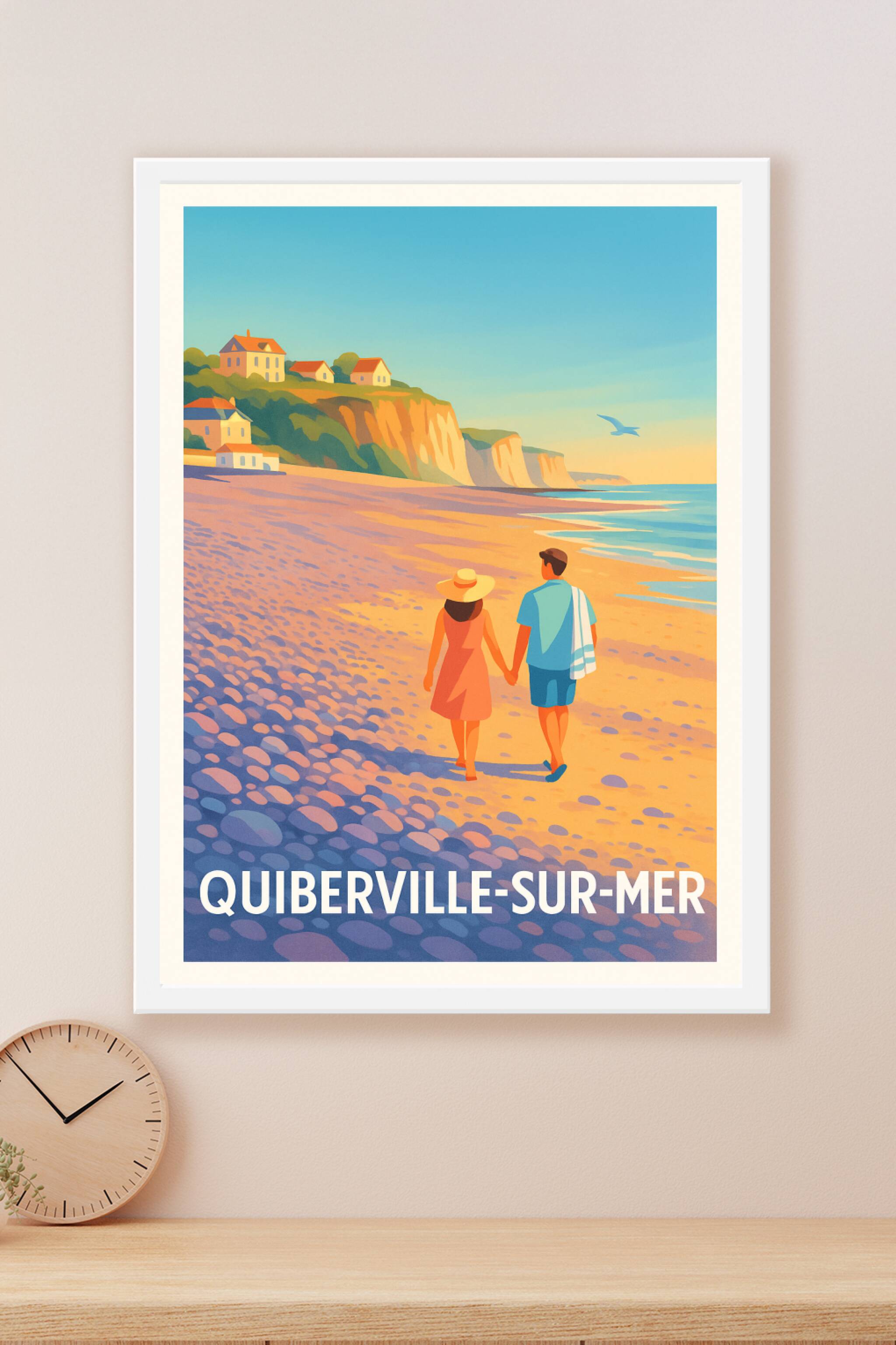 Découvrez la douceur de vivre de Quiberville-sur-Mer avec cette affiche illustrée représentant un couple se promenant main dans la main sur la plag...