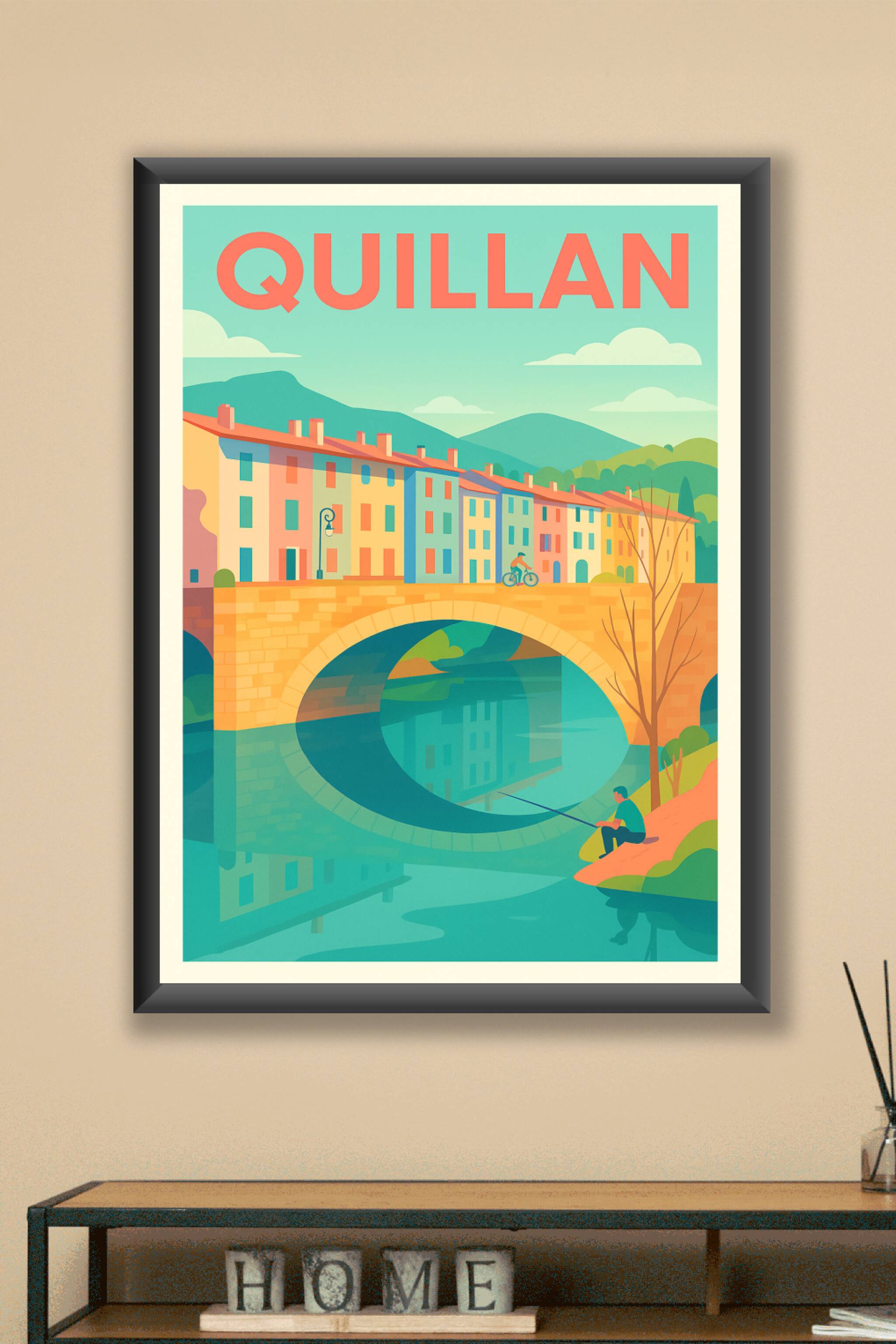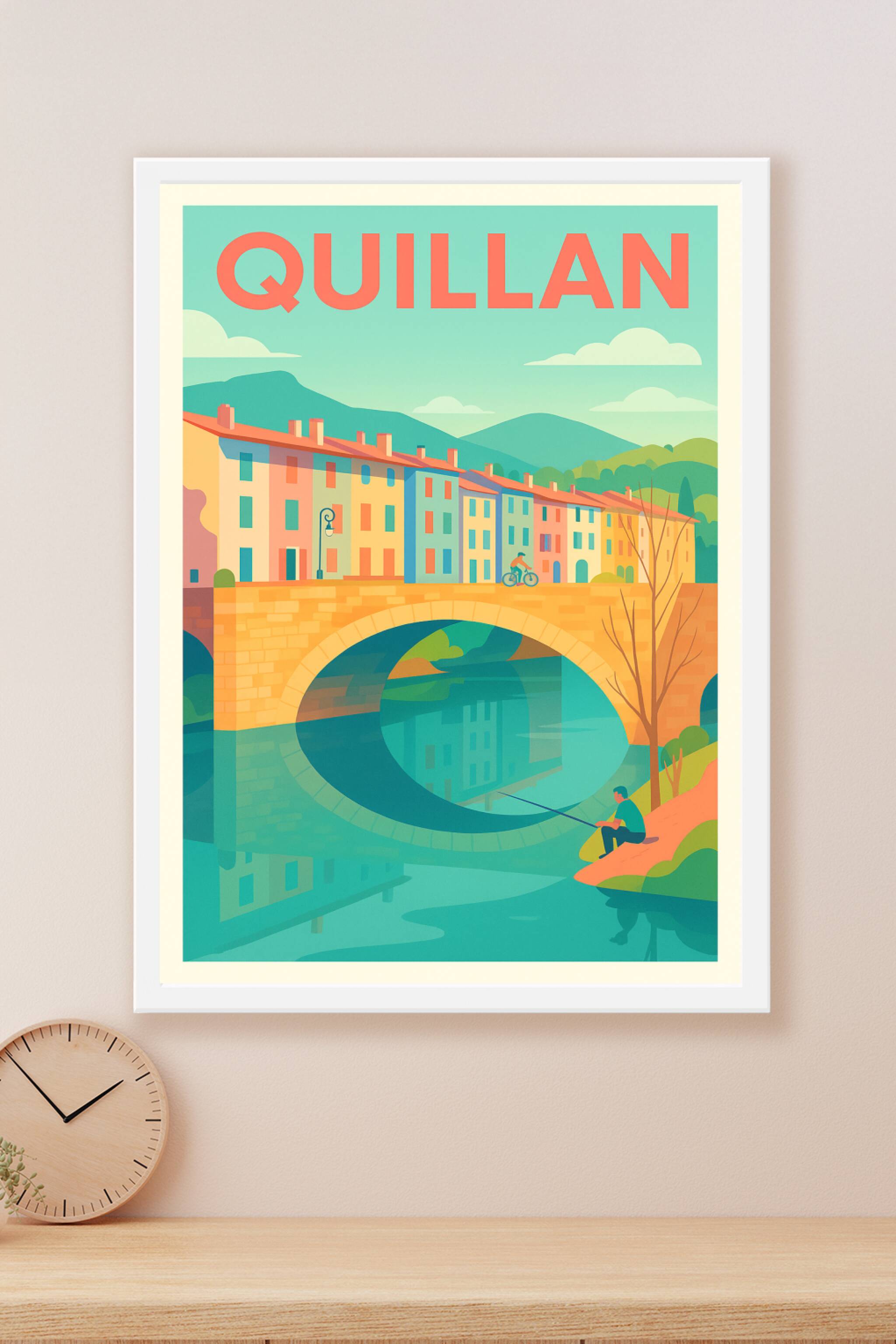 Découvrez la douceur de vivre à Quillan avec cette affiche illustrée représentant le charmant pont de pierre qui enjambe l'Aude, entouré de ses mai...