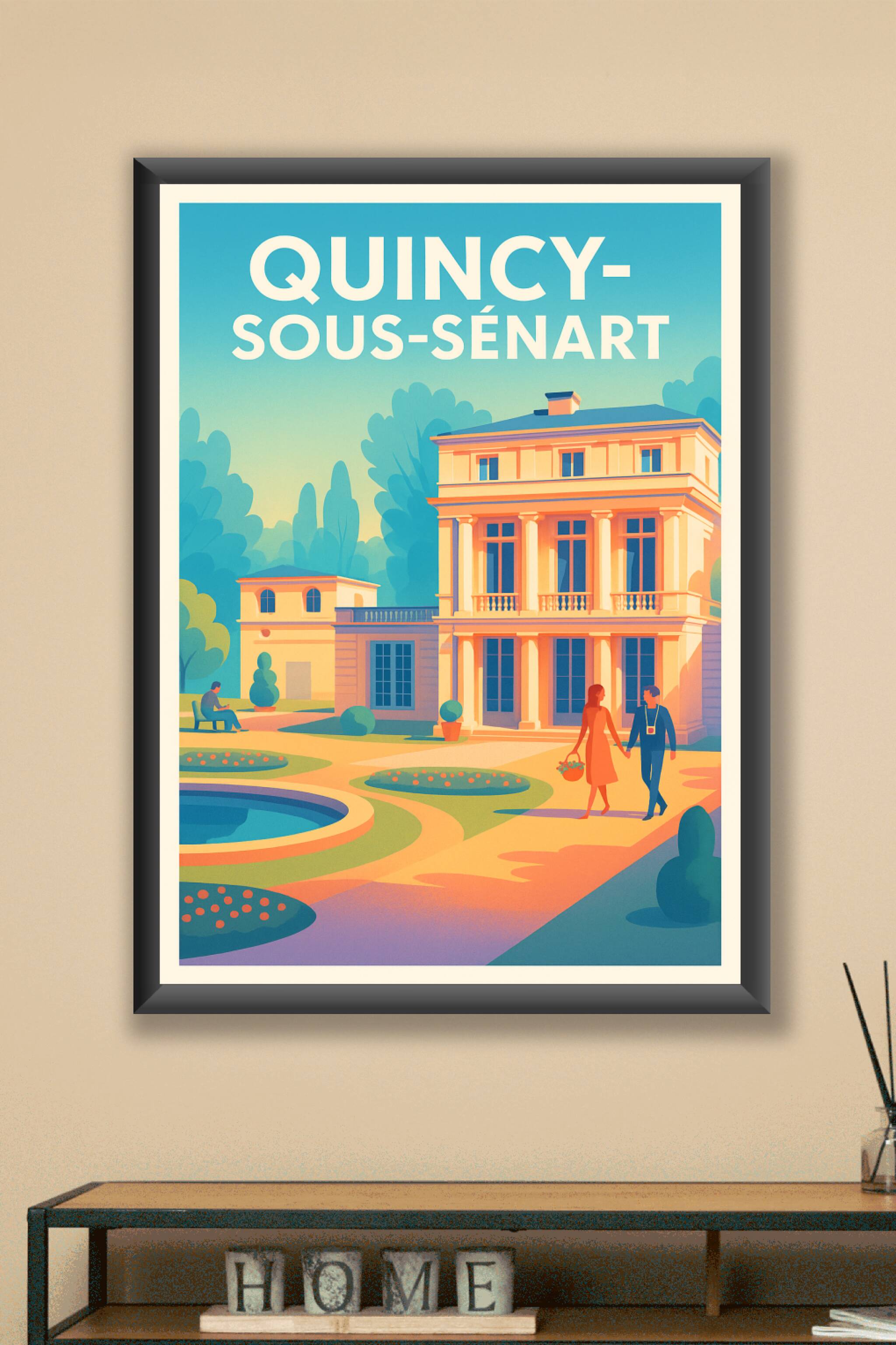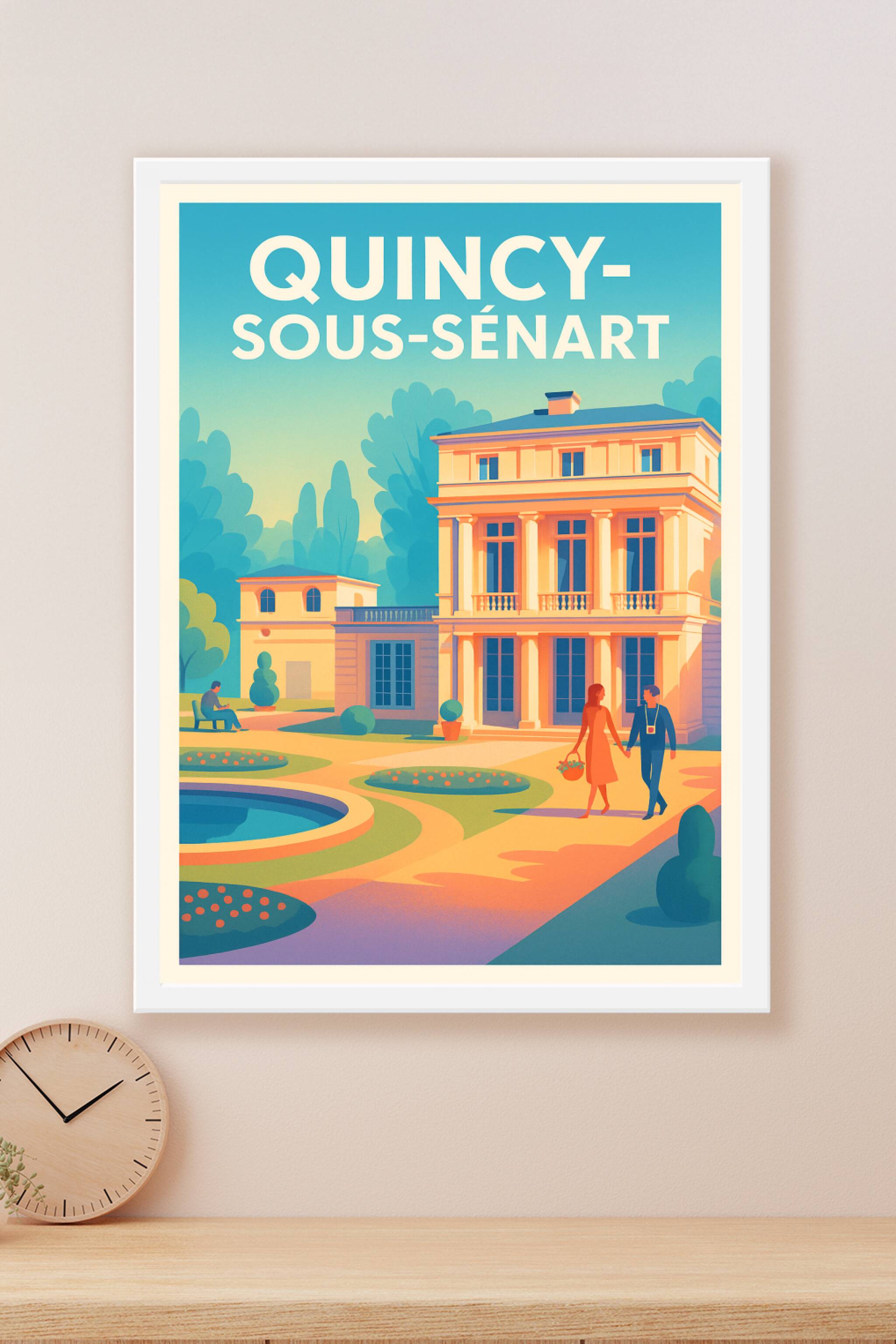 Découvrez l'ambiance paisible et raffinée de Quincy-sous-Sénart à travers cette affiche illustrée mettant en scène une élégante demeure entourée de...