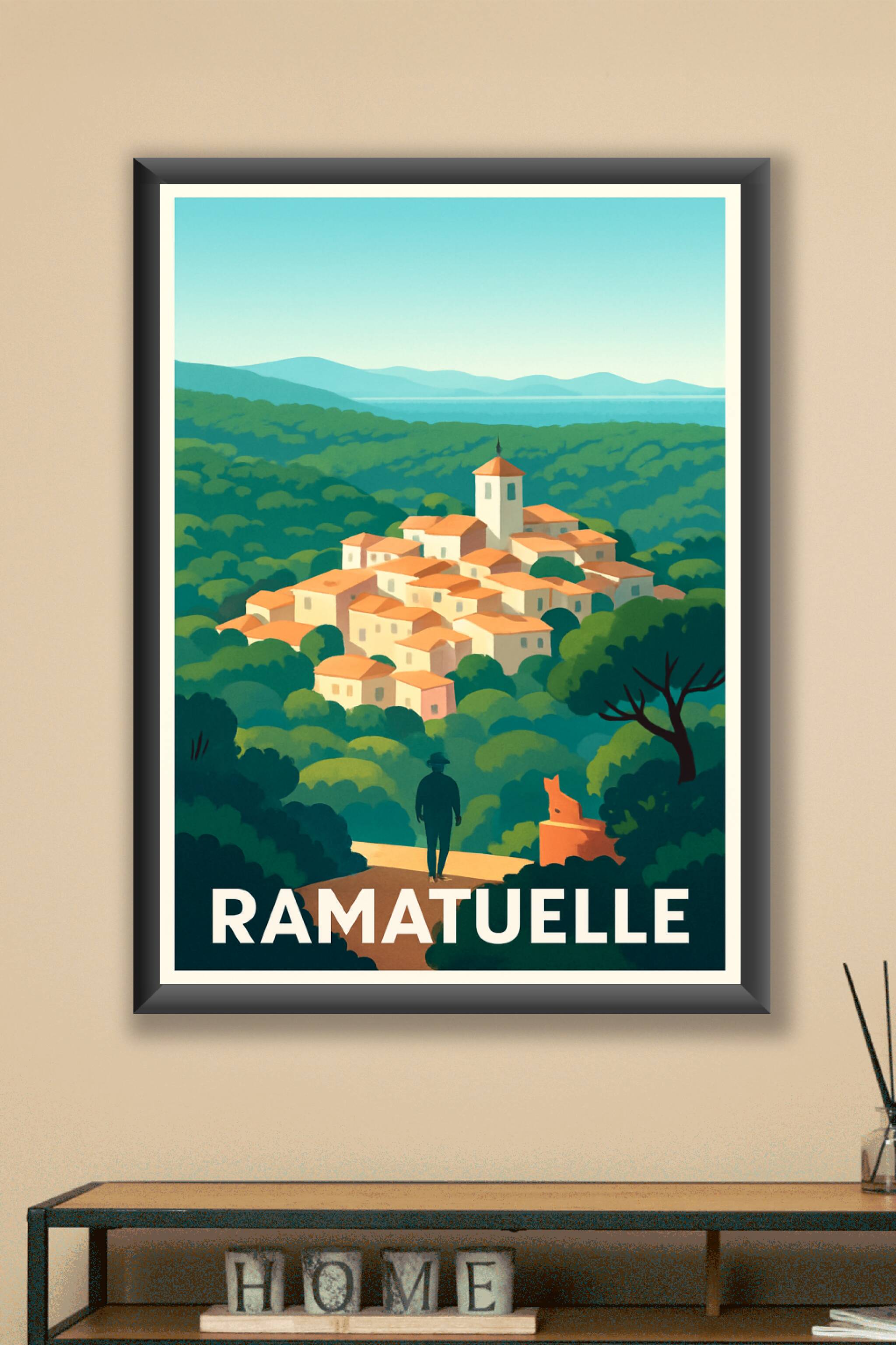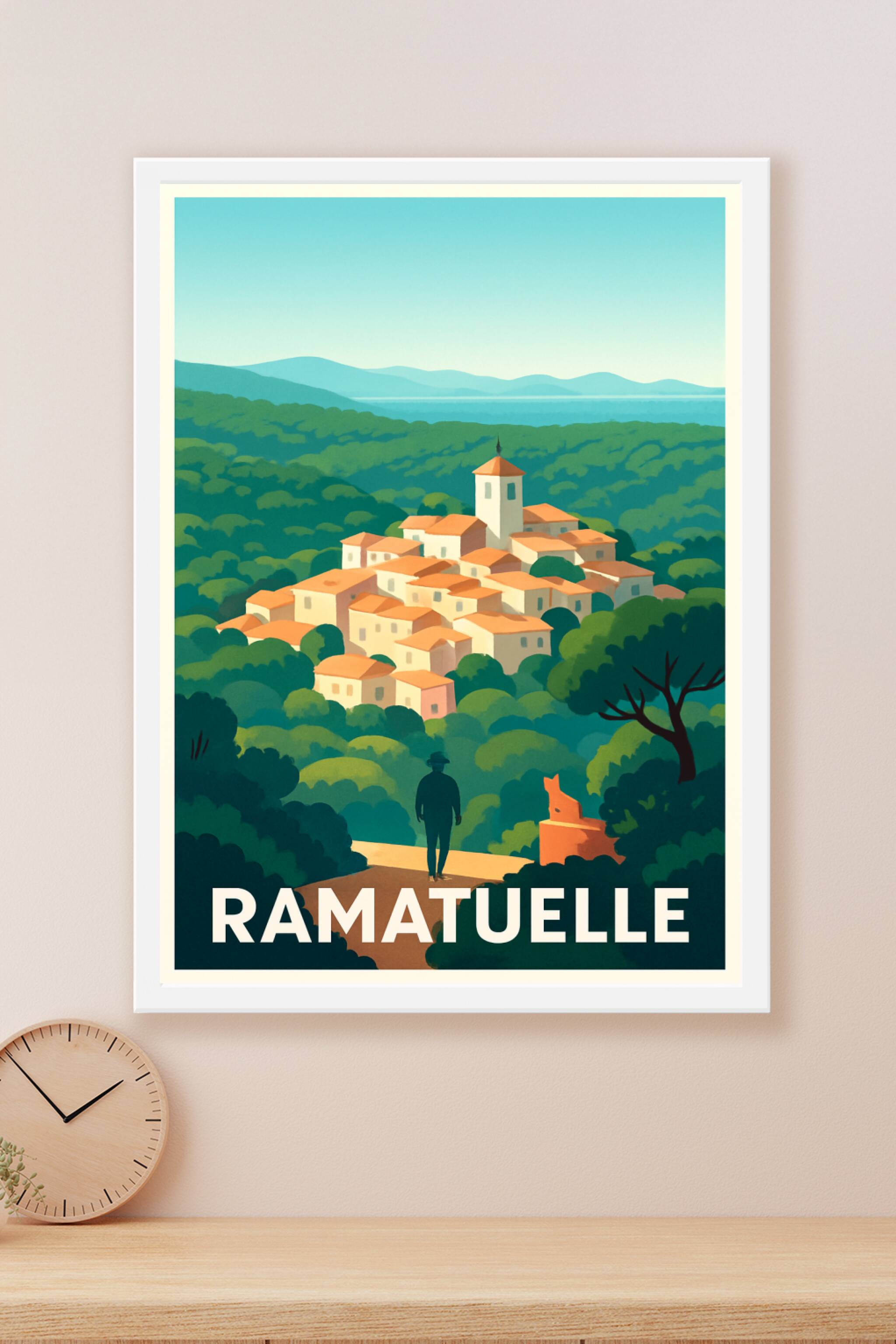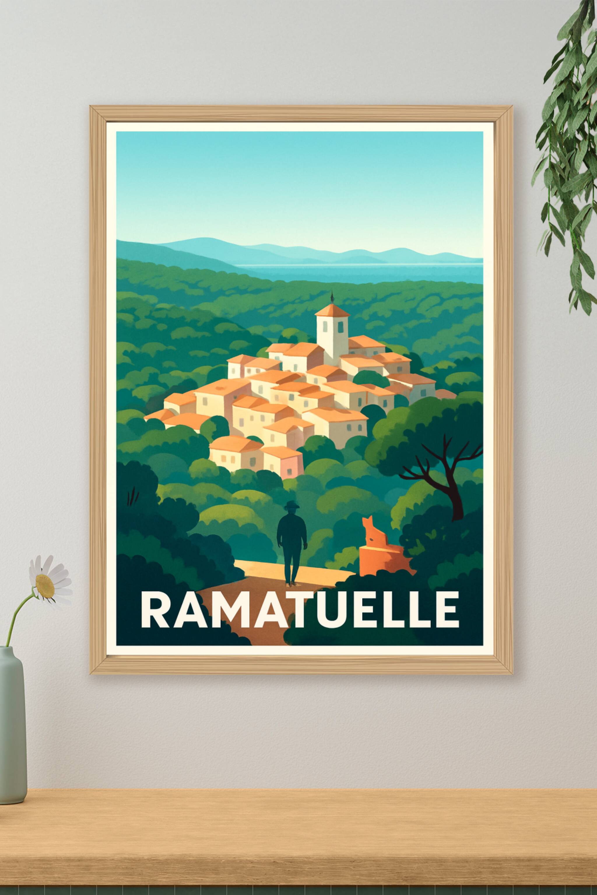 Découvrez l'élégance intemporelle de Ramatuelle à travers cette affiche illustrée, capturant le village perché avec ses toits en terre cuite et son...