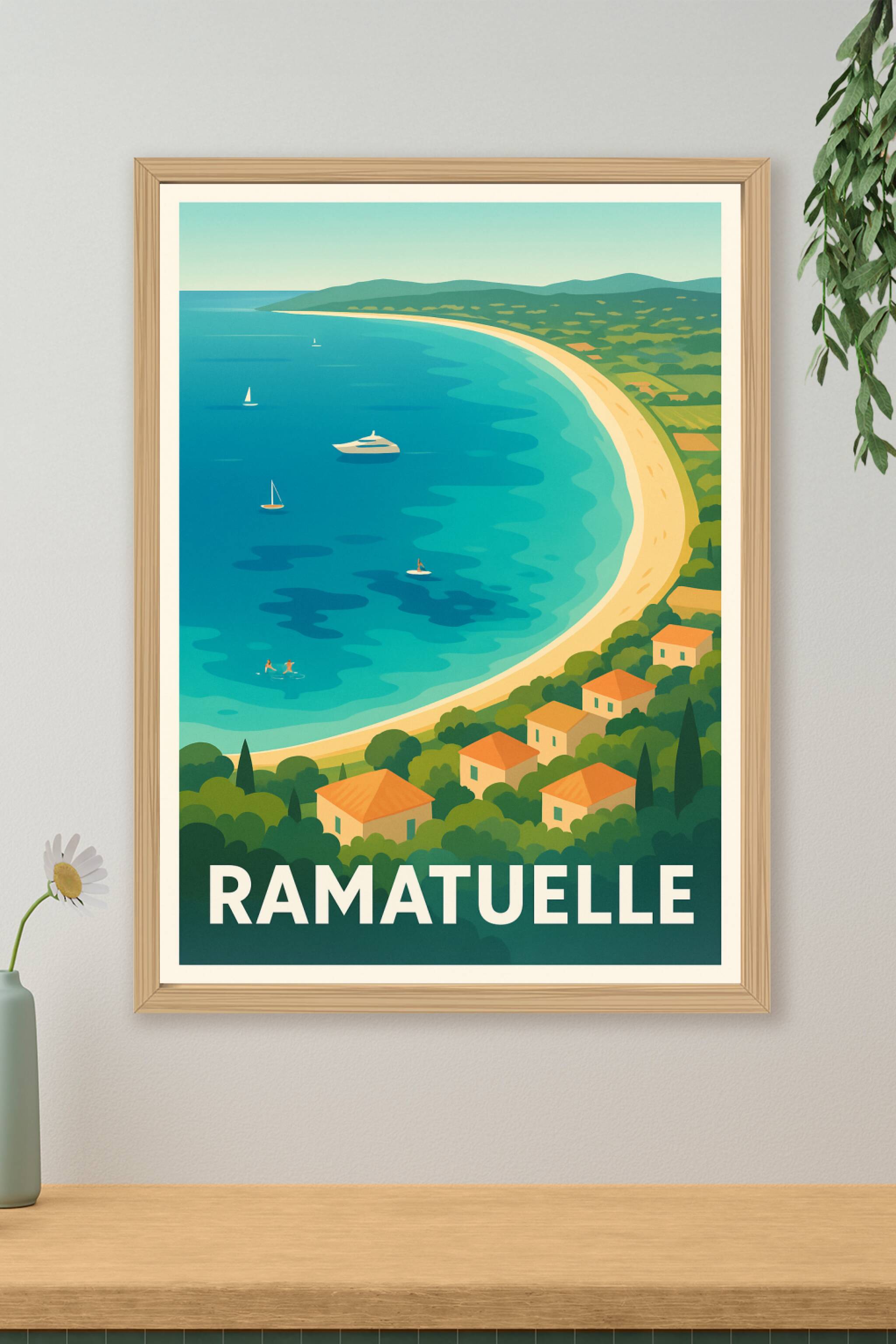 Découvrez la douceur de vivre méditerranéenne avec cette affiche illustrant la magnifique baie de Ramatuelle, ses eaux turquoises et ses charmantes...