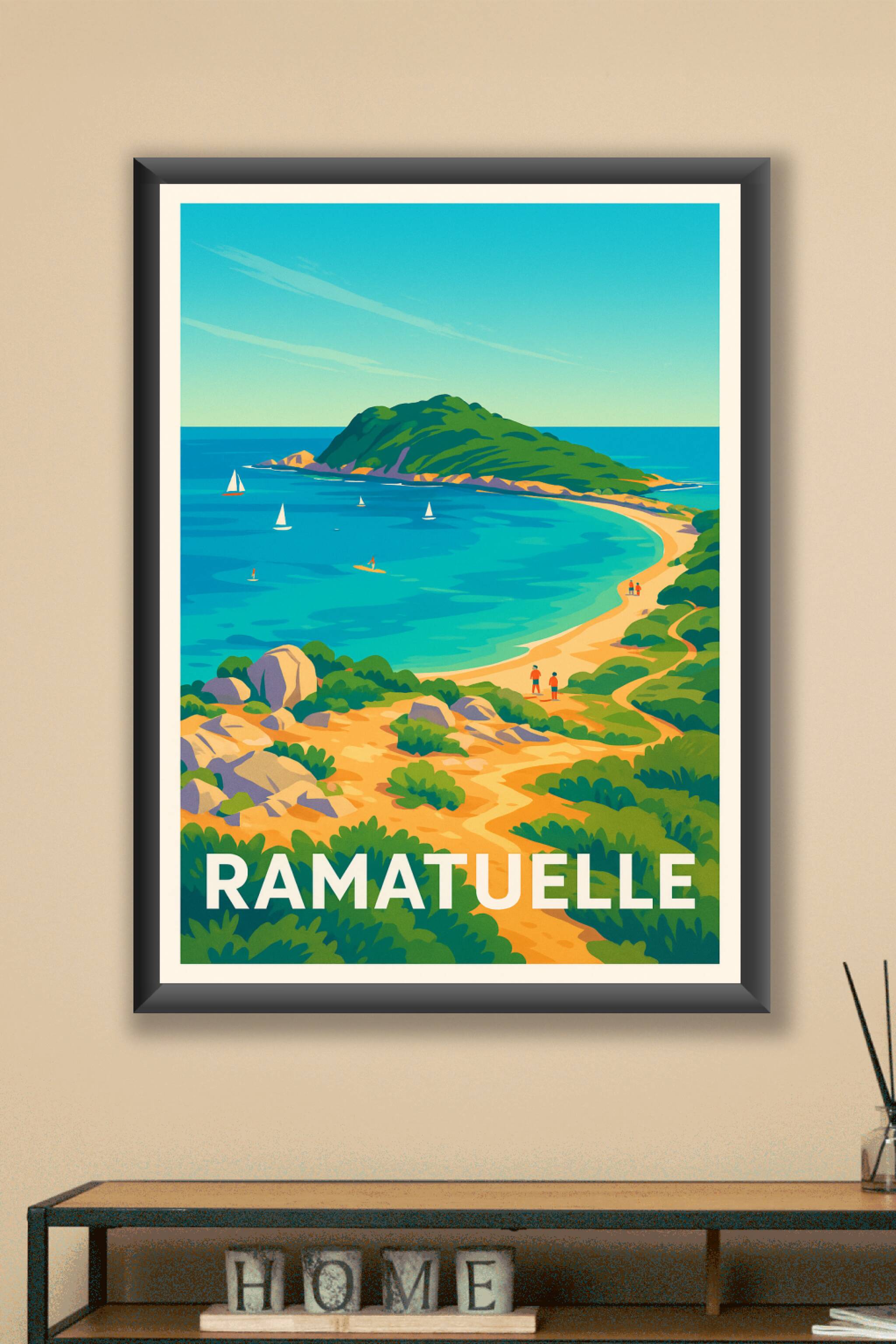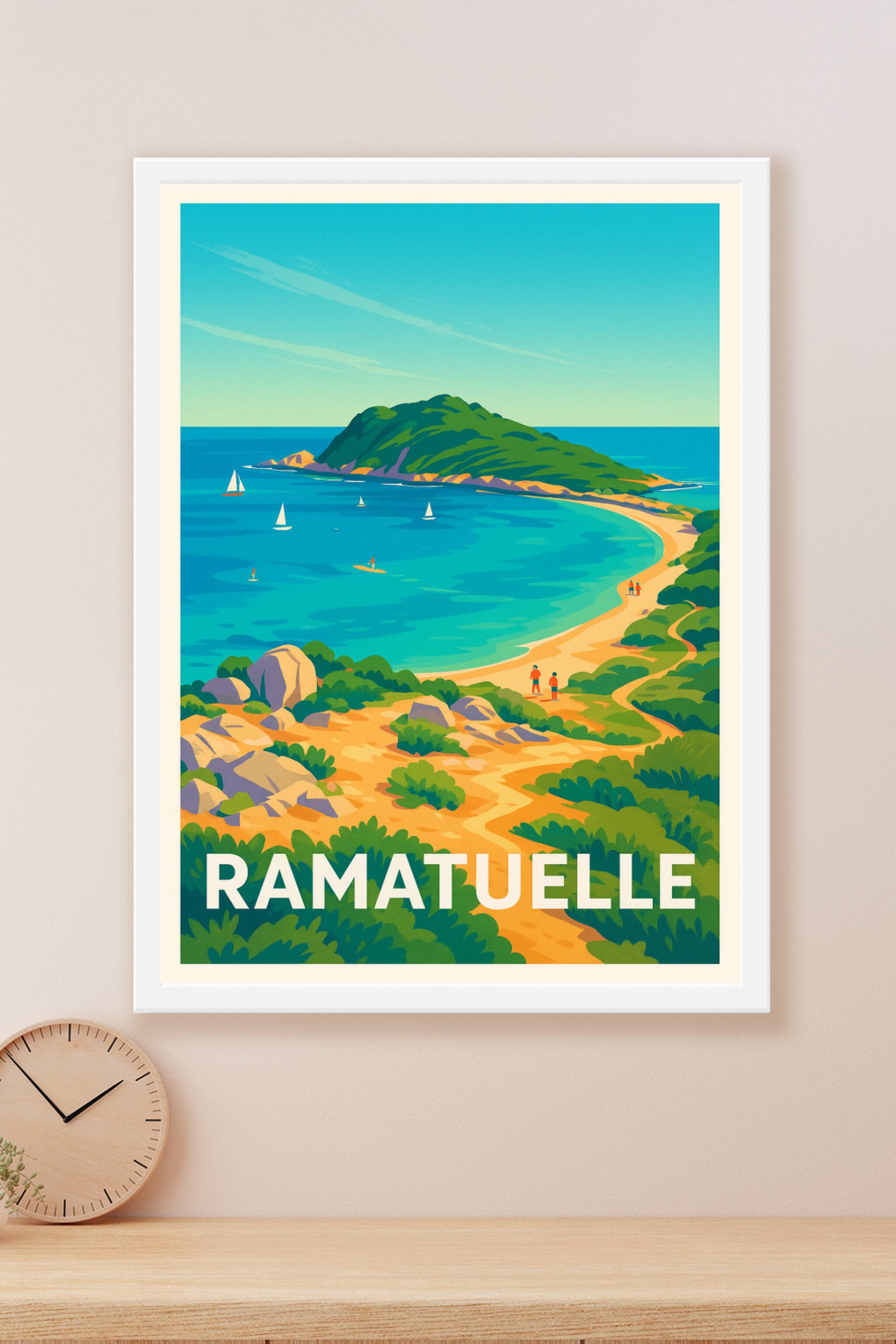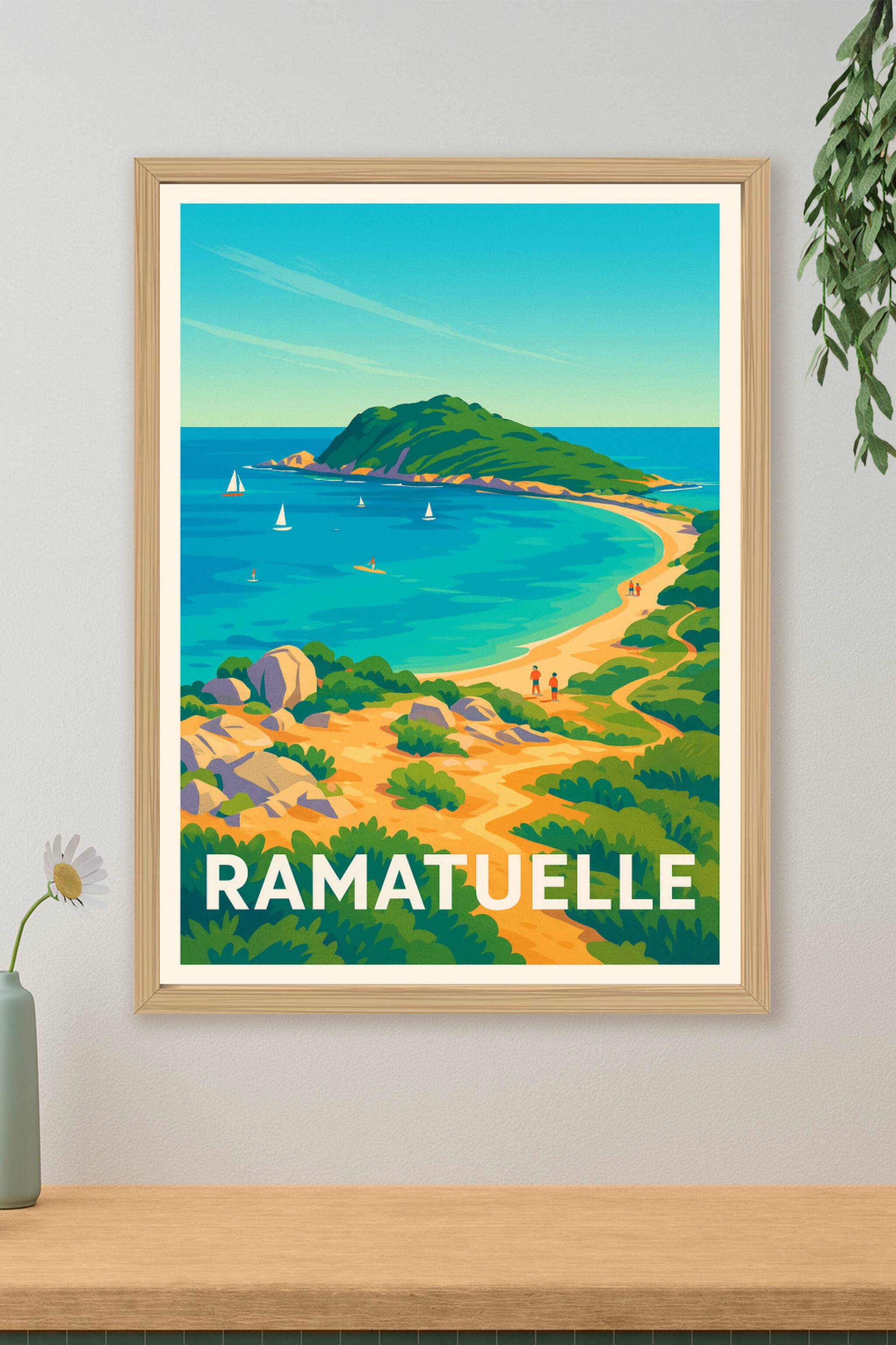 Découvrez la beauté sauvage et lumineuse de Ramatuelle avec cette affiche au style vintage qui illustre une baie paisible bordée de sable doré et d...