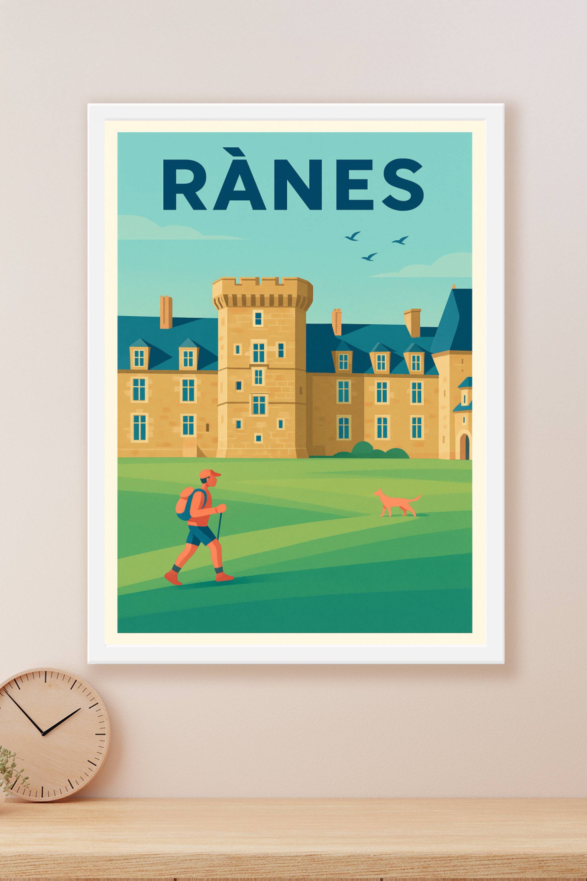 Découvrez l'élégance et la sérénité de Rânes avec cette affiche illustrée aux couleurs douces et harmonieuses. Le poster met en scène une promenade...