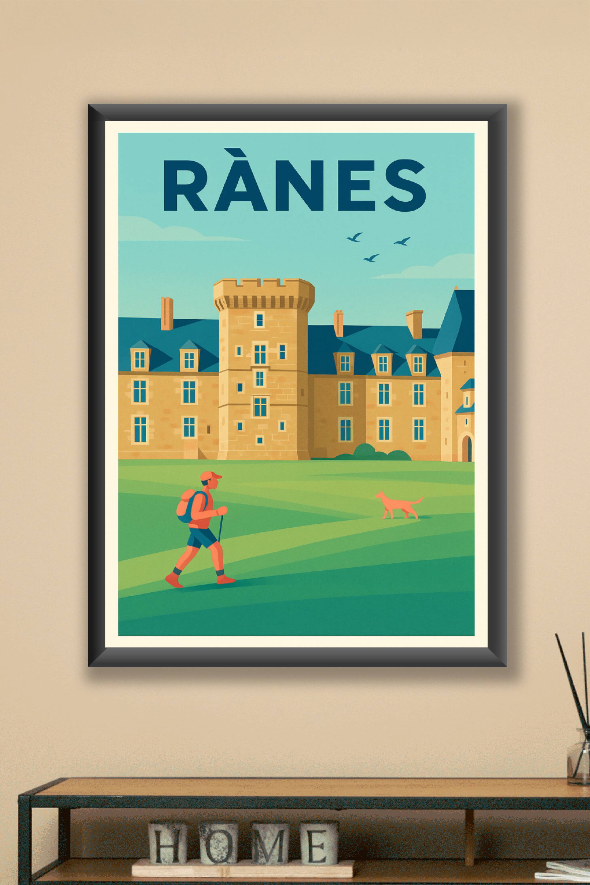 Découvrez l'élégance et la sérénité de Rânes avec cette affiche illustrée aux couleurs douces et harmonieuses. Le poster met en scène une promenade au pied d'un magnifique château, entouré de vastes espaces verts où un marcheur et son chien profitent d'un instant de calme.Ce visuel est imprimé en tirage "Fine Art" sur un papier 305g coton d'une qualité d'exception, garantissant des couleurs vibrantes et une durabilité optimisée. Disponible en formats A1 à A4, avec ou sans cadre, cette affiche ajoutera une touche raffinée à votre décoration intérieure ou fera un cadeau parfait pour les amoureux des beaux paysages et du patrimoine français.Bénéficiez d'une impression premium 100% fabriquée en France pour sublimer votre intérieur avec ce poster unique.