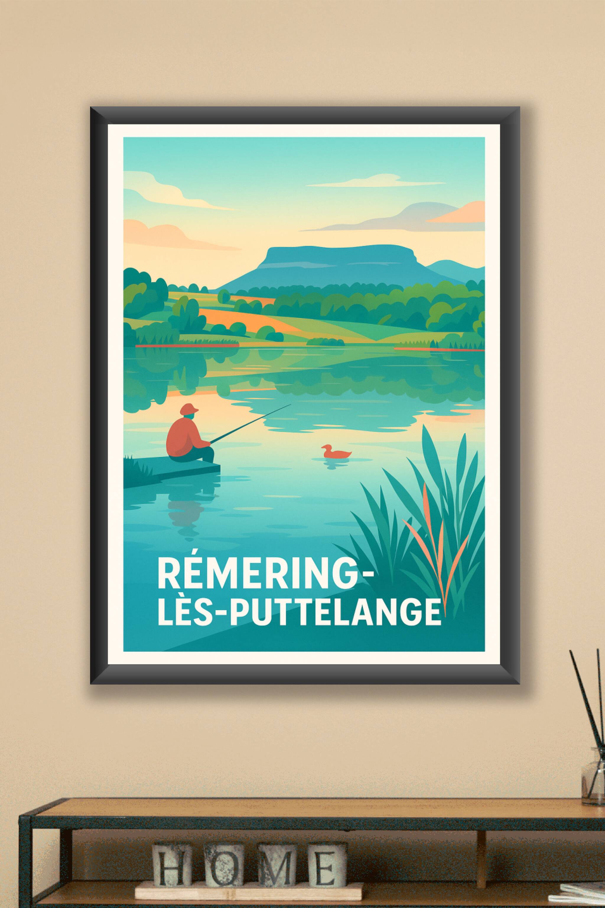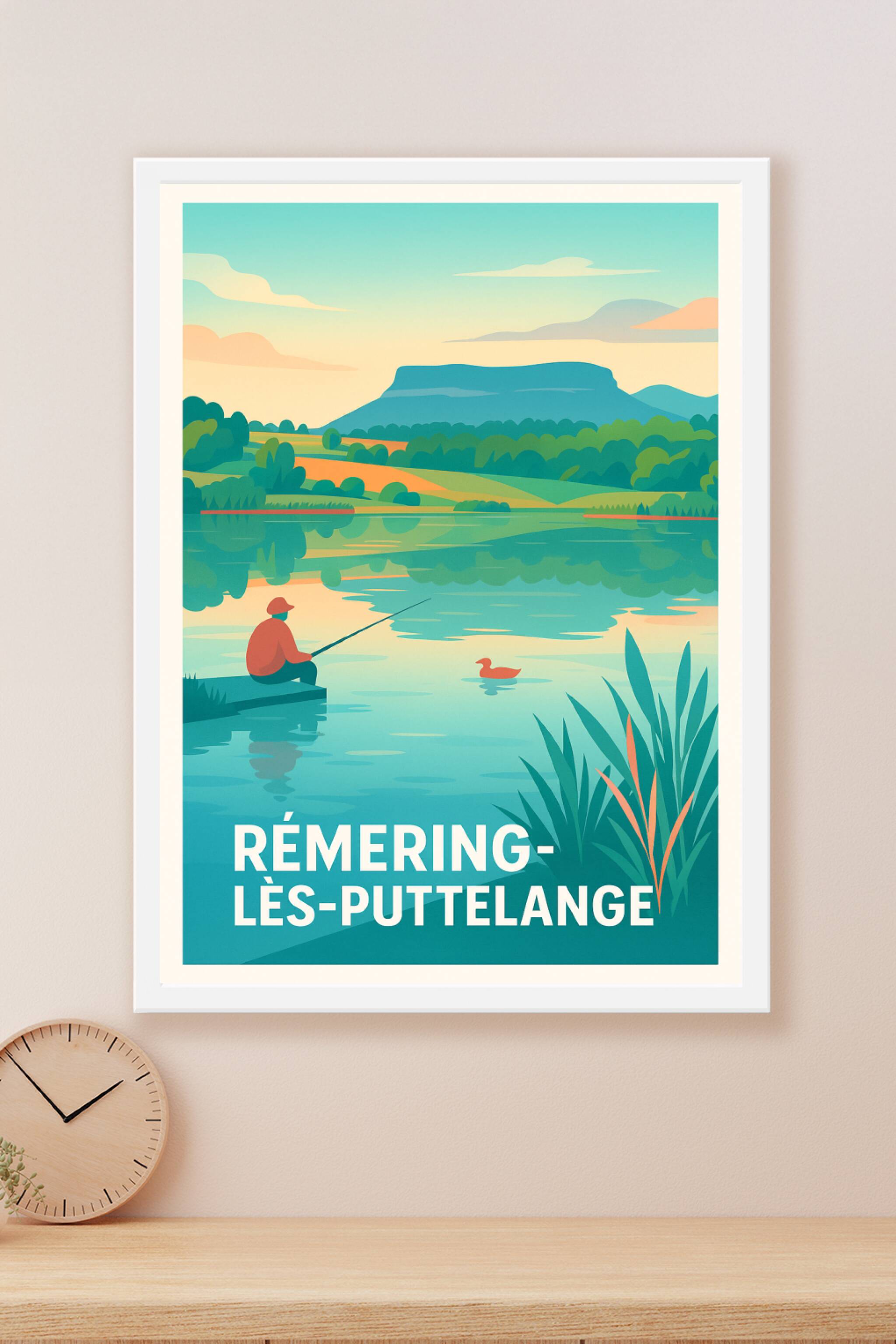 Découvrez la quiétude de Rémering-lès-Puttelange à travers cette affiche illustrant un pêcheur paisible au bord d'un lac, entouré d'une nature luxu...