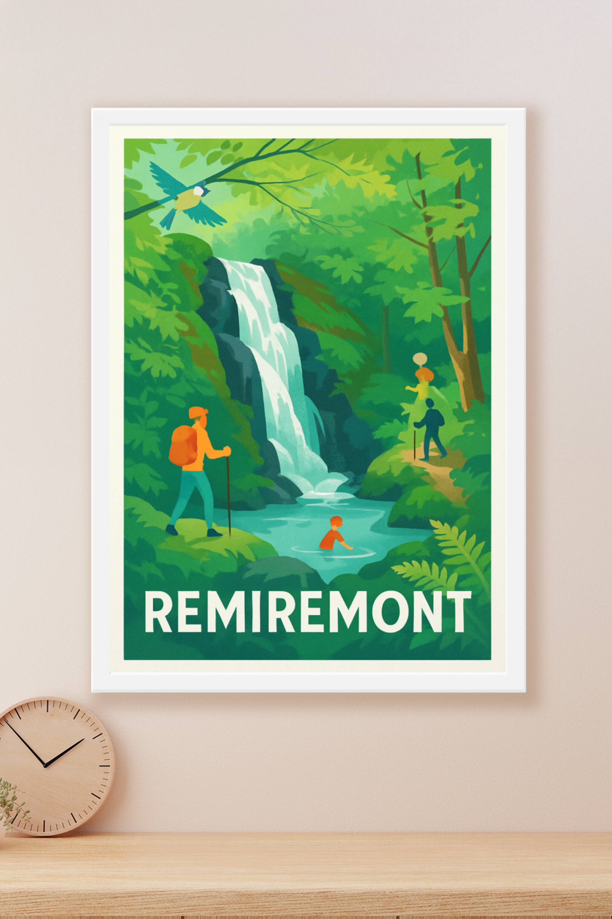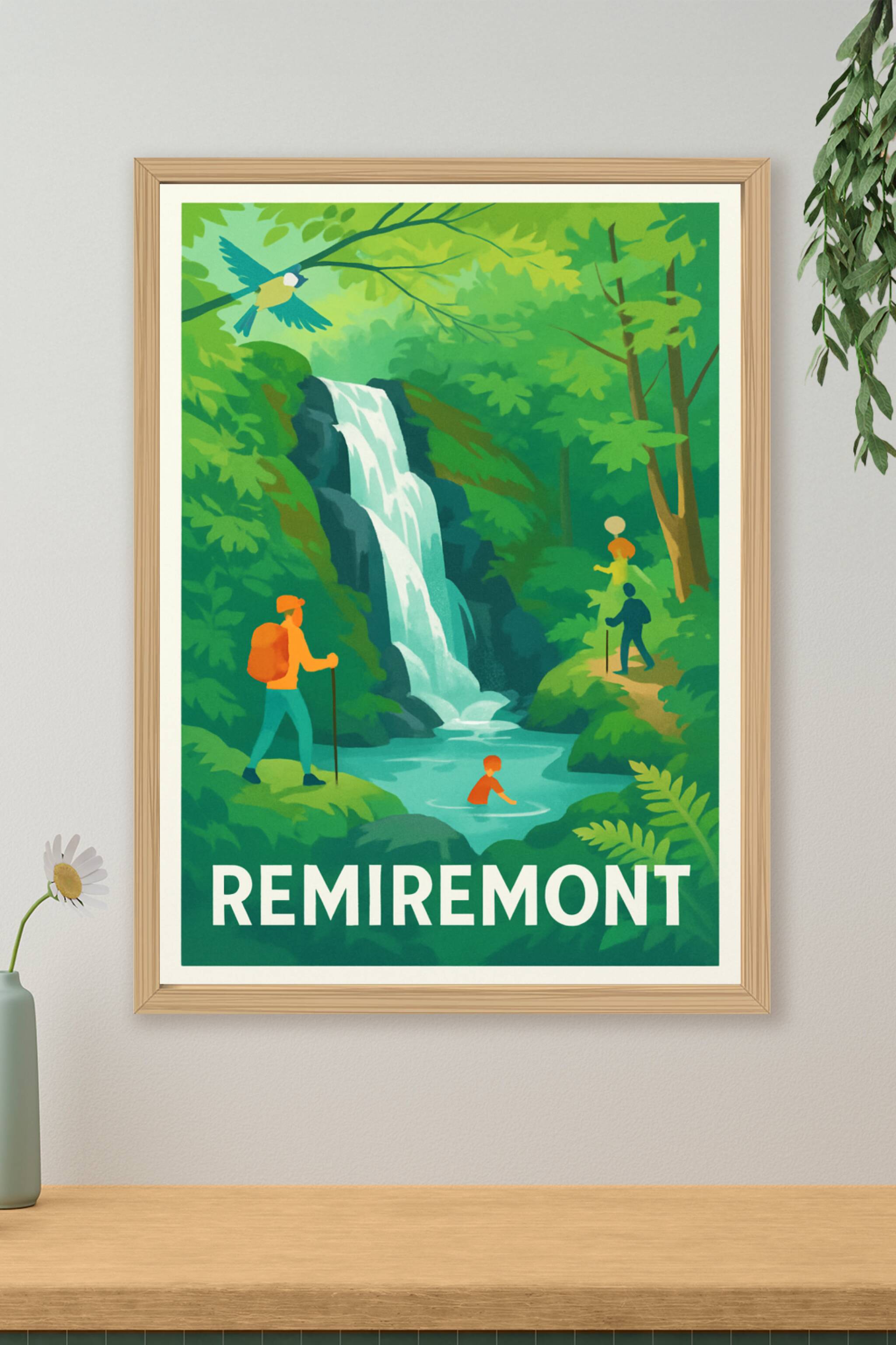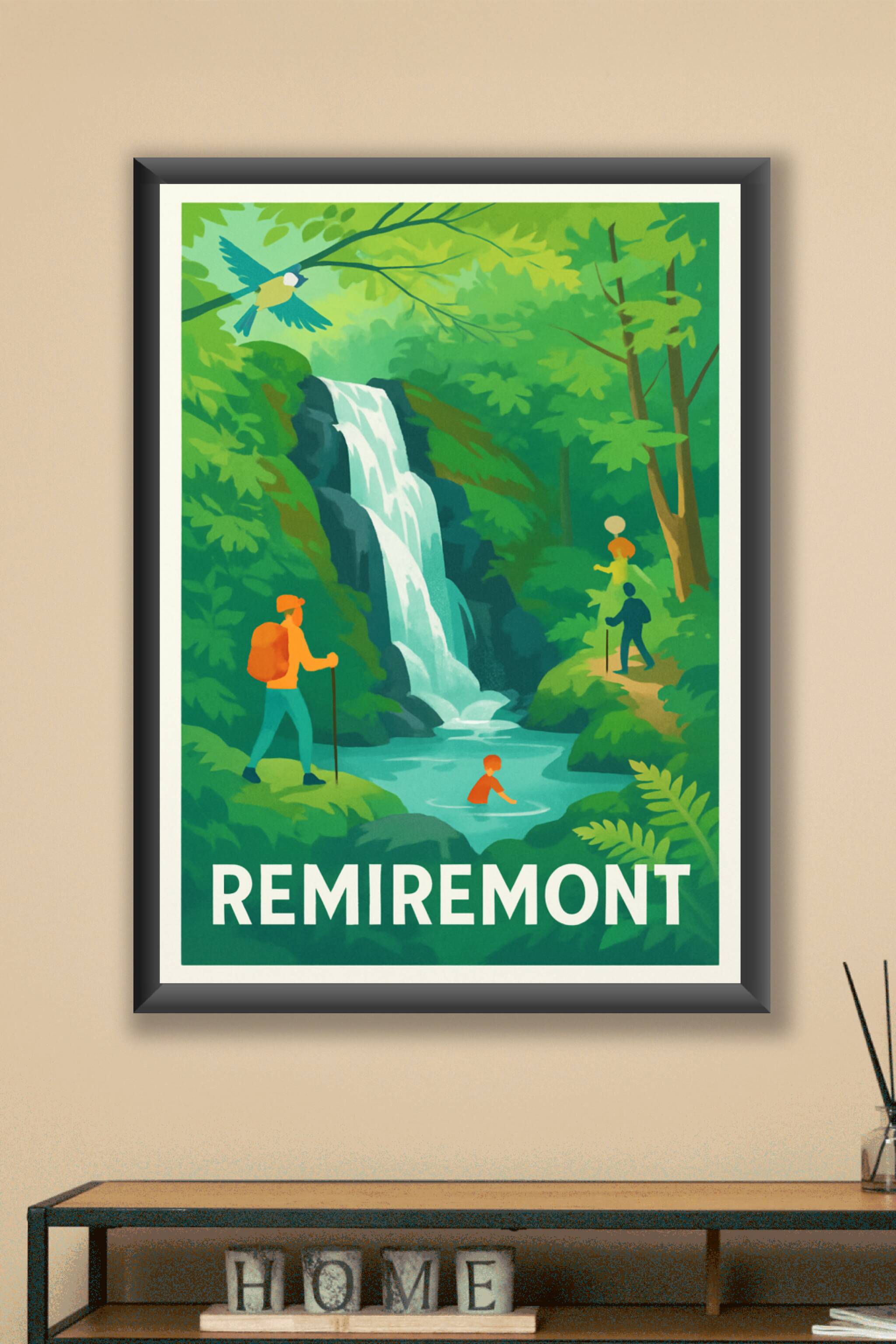 Découvrez la beauté naturelle de Remiremont avec cette affiche illustrée représentant une cascade paisible entourée d'une forêt verdoyante. Le post...