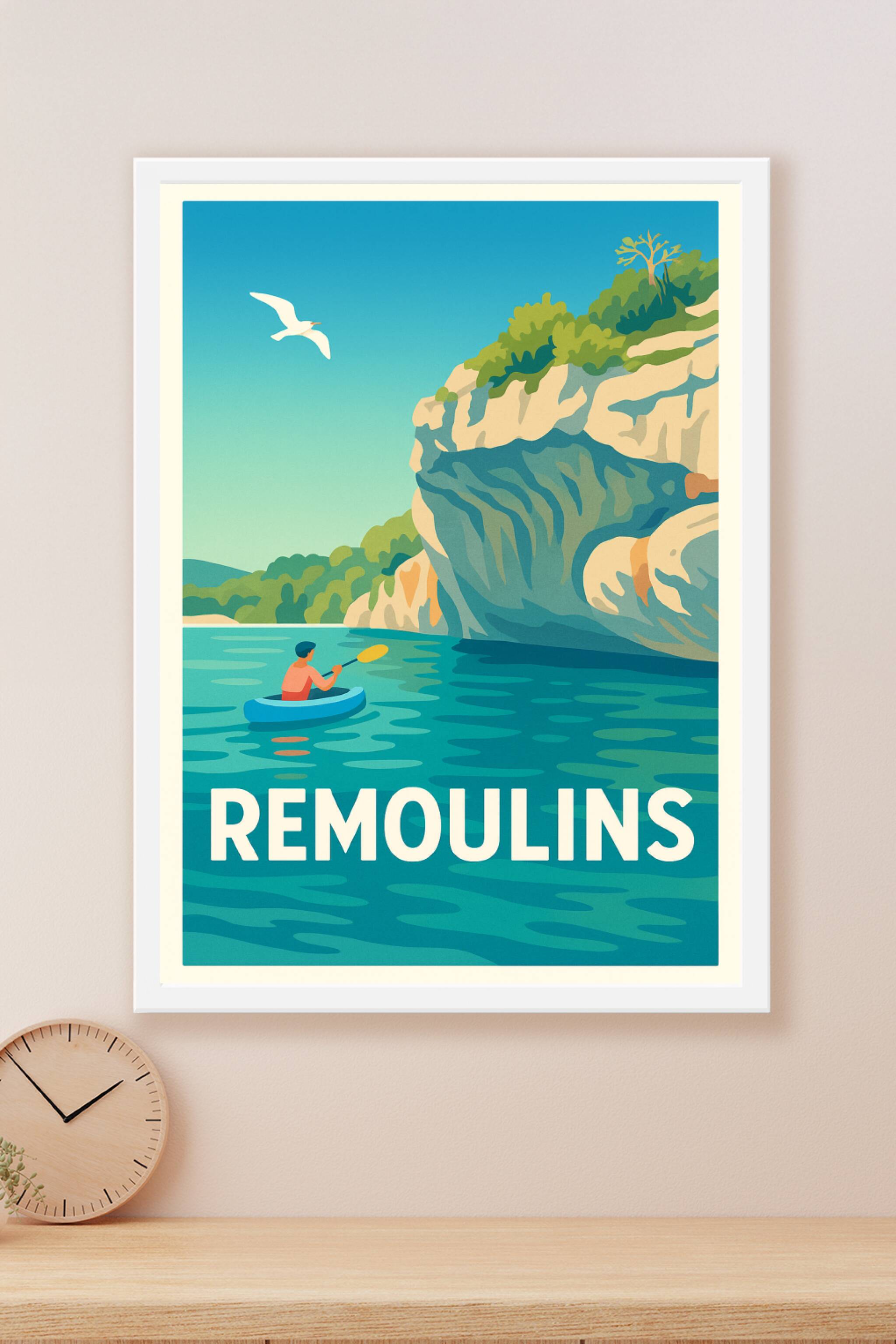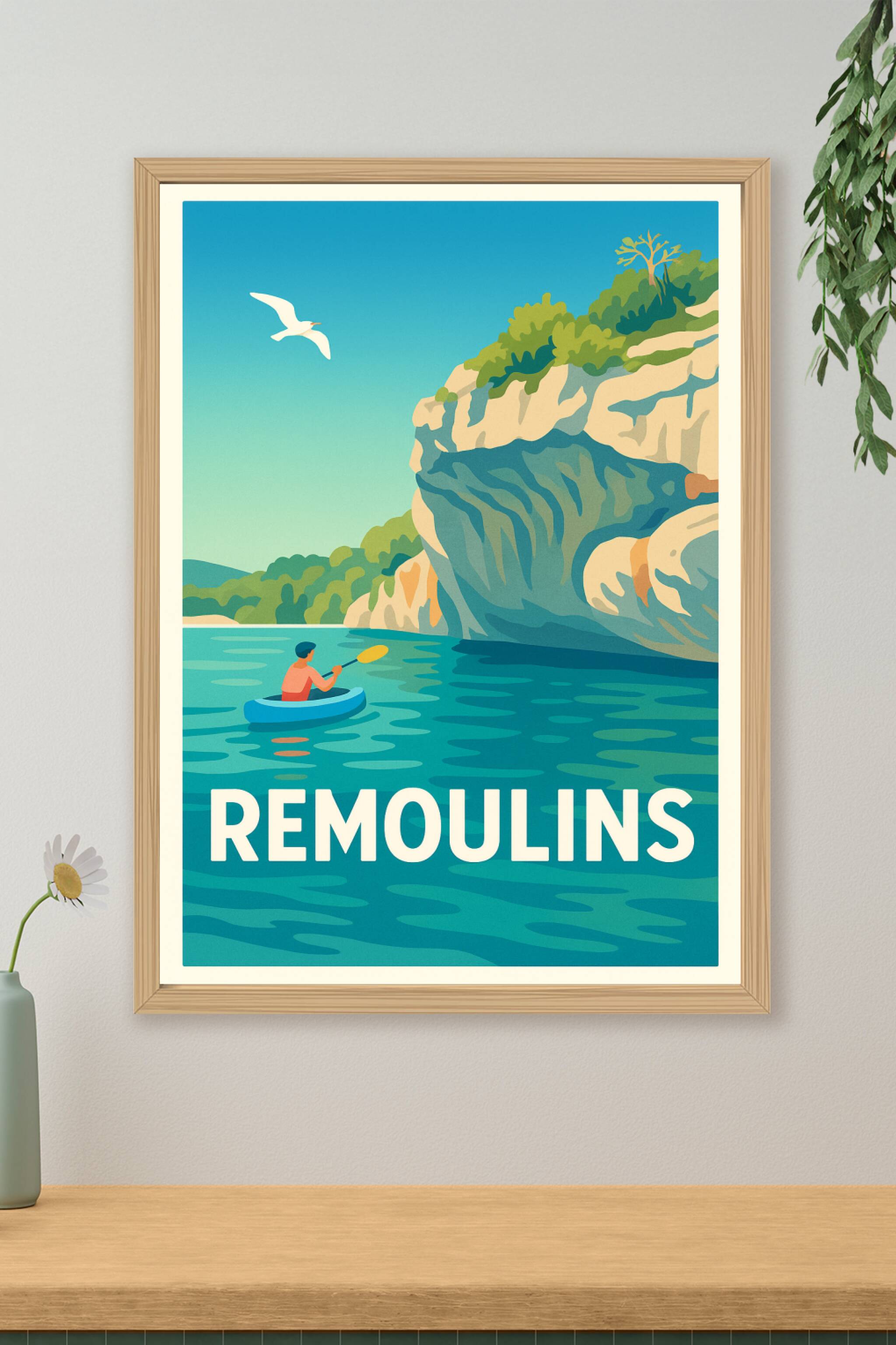 Découvrez l'ambiance sereine et sauvage de Remoulins avec cette affiche illustrée au style vintage, mettant en scène un canoéiste naviguant sur une...