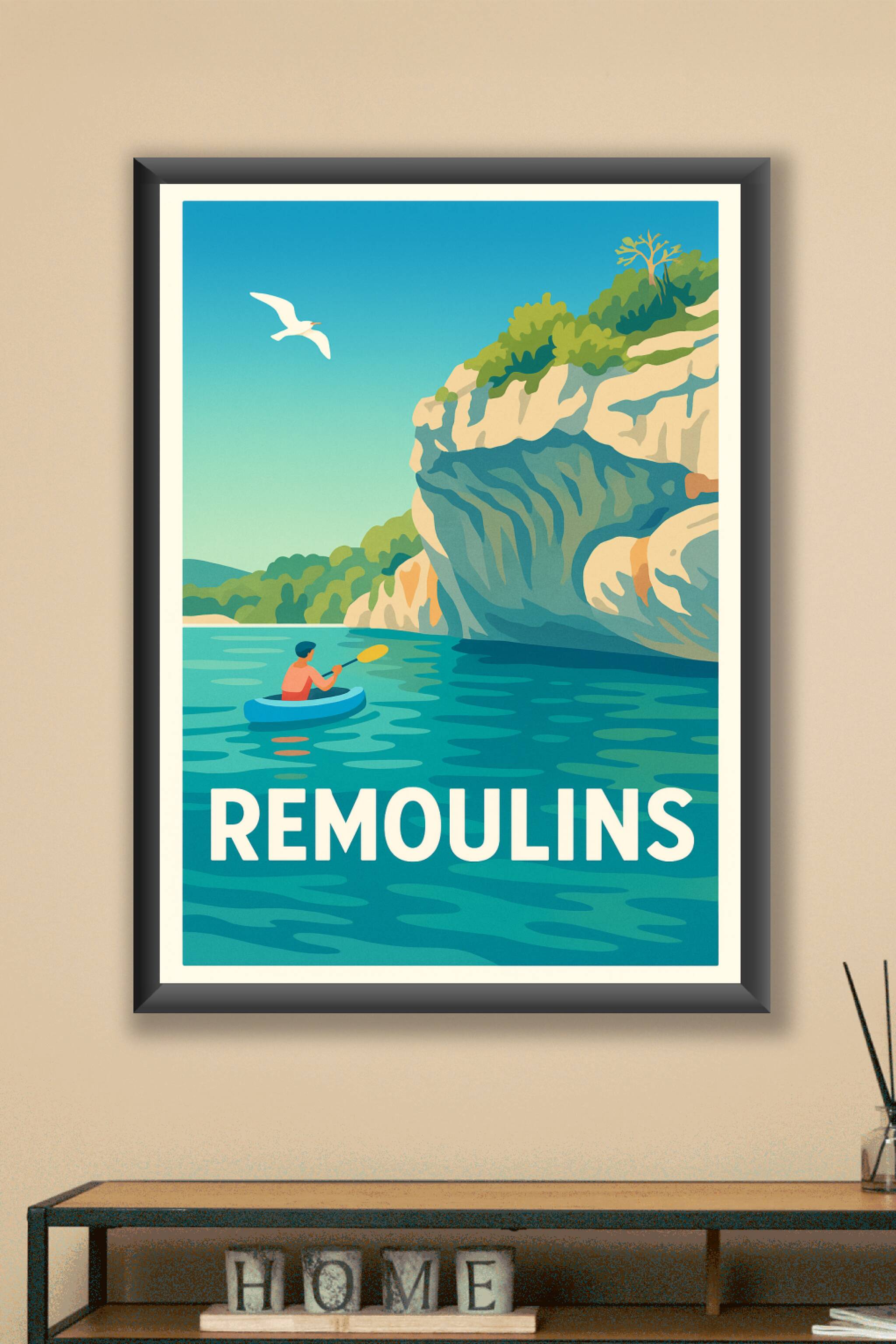 Découvrez l'ambiance sereine et sauvage de Remoulins avec cette affiche illustrée au style vintage, mettant en scène un canoéiste naviguant sur une eau turquoise entre les falaises impressionnantes. Cette scène invite à l'aventure et à la découverte des paysages naturels exceptionnels de la région. Ce poster est imprimé en tirage "Fine Art" sur papier coton 305g, garantissant une qualité d'impression exceptionnelle et des couleurs éclatantes qui sublimeront votre décoration intérieure. Disponible en formats A1 à A4, avec ou sans cadre, cette affiche s'adapte à tous vos espaces, qu'ils soient grands ou petits. Apportez une touche d'authenticité et de fraîcheur à votre intérieur ou offrez un souvenir unique aux passionnés de nature et d'aventure, grâce à une finition premium 100% fabriquée en France.