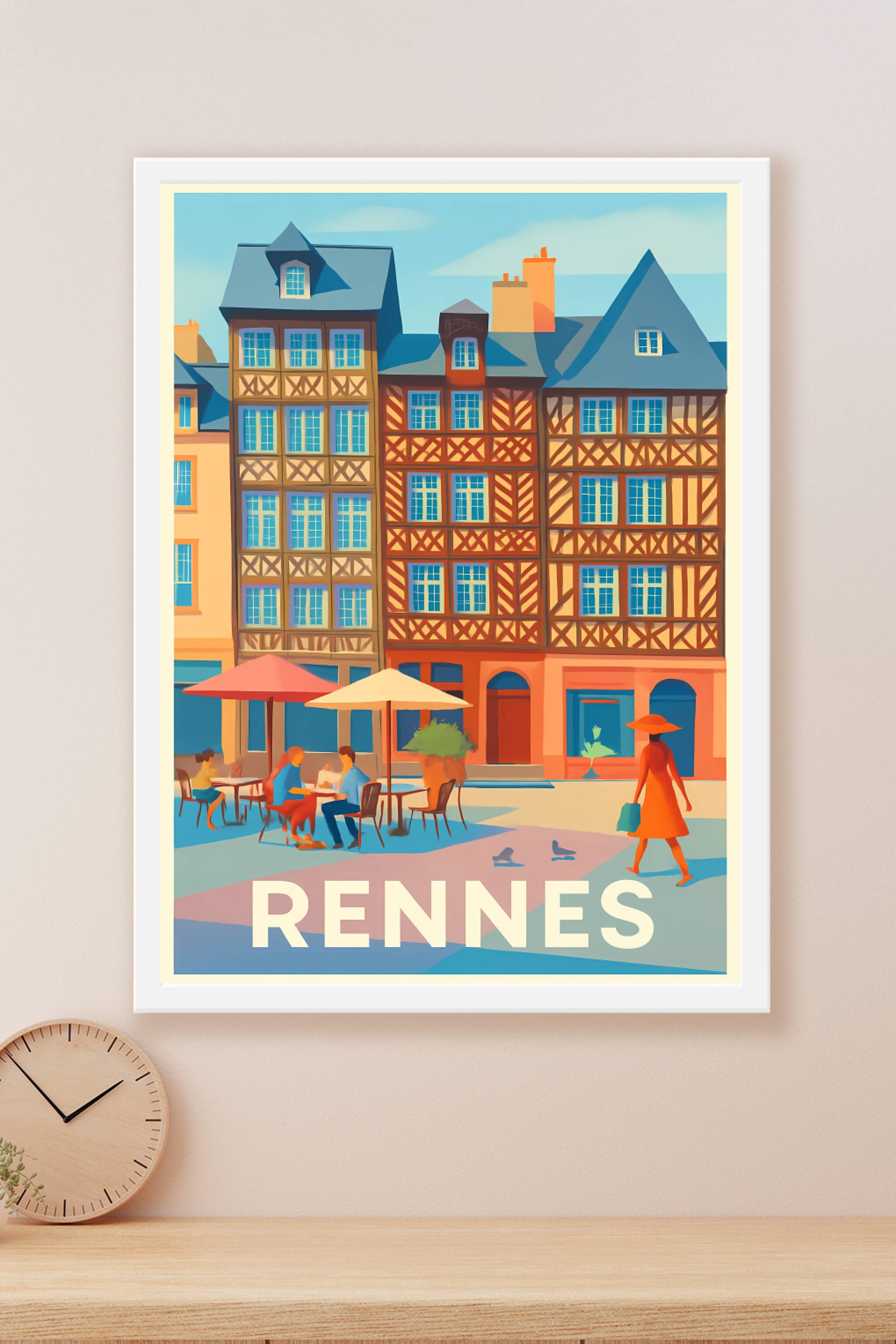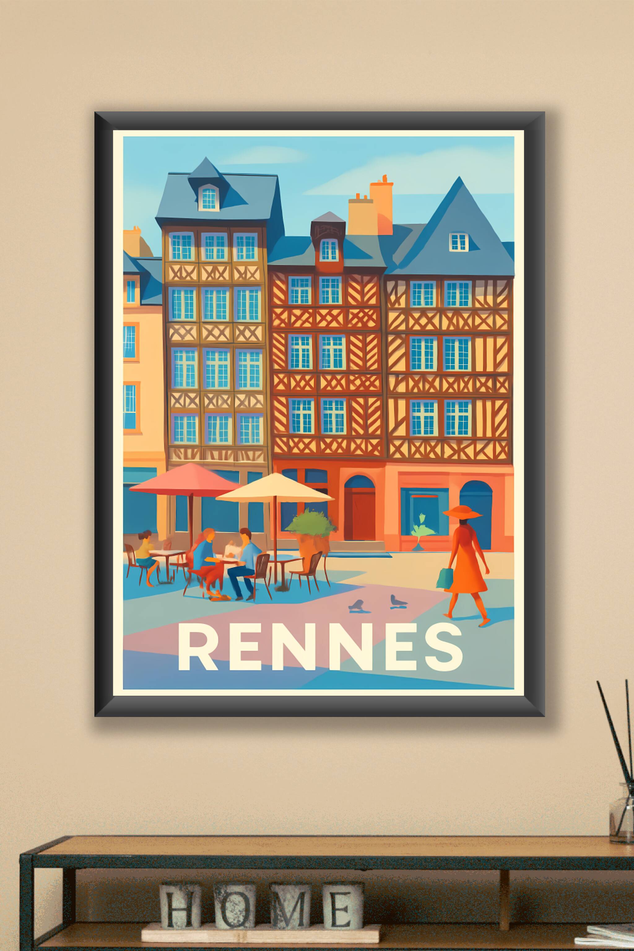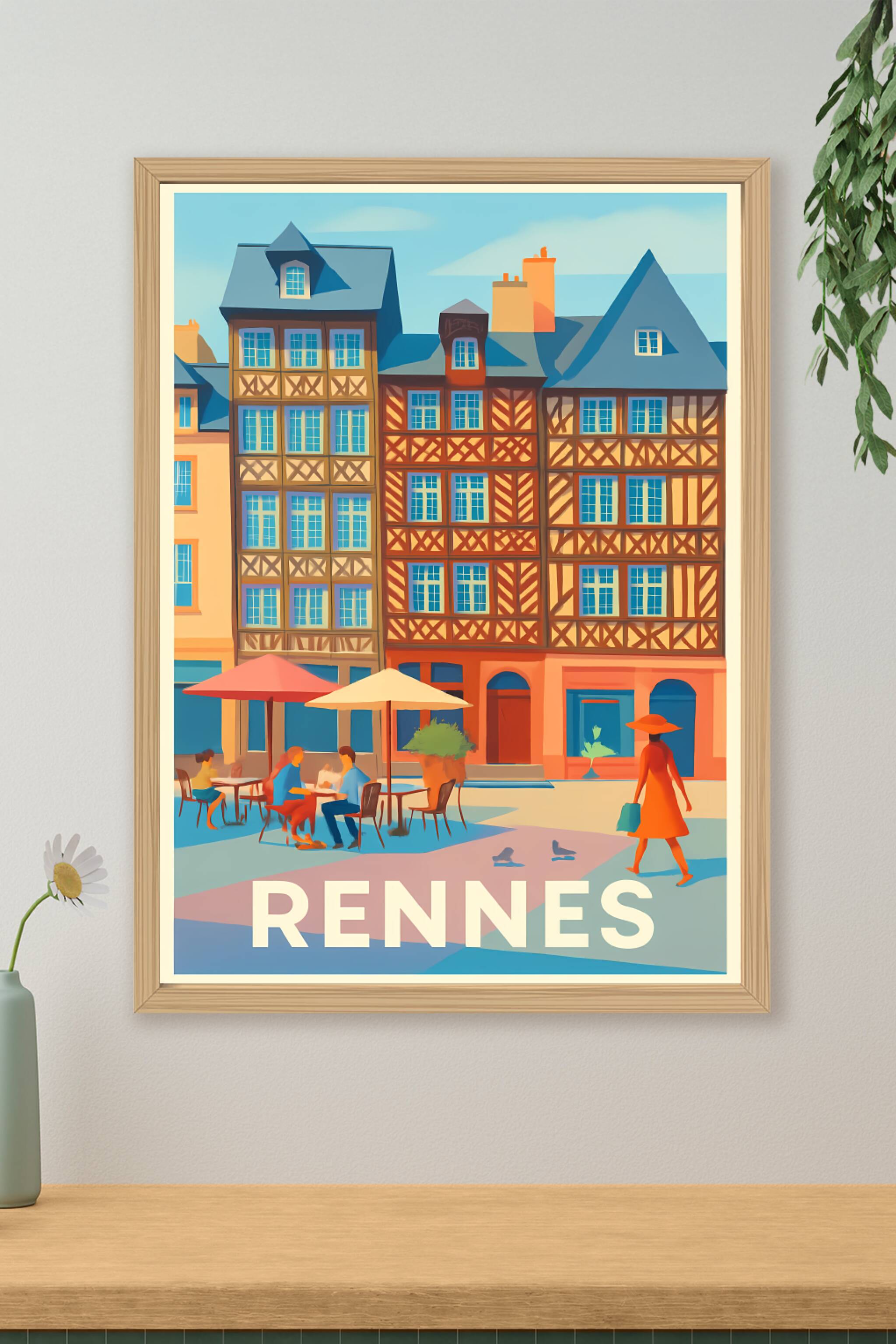 Découvrez l'ambiance chaleureuse et pittoresque de Rennes à travers cette affiche illustrée mettant en scène les célèbres maisons à colombages et u...