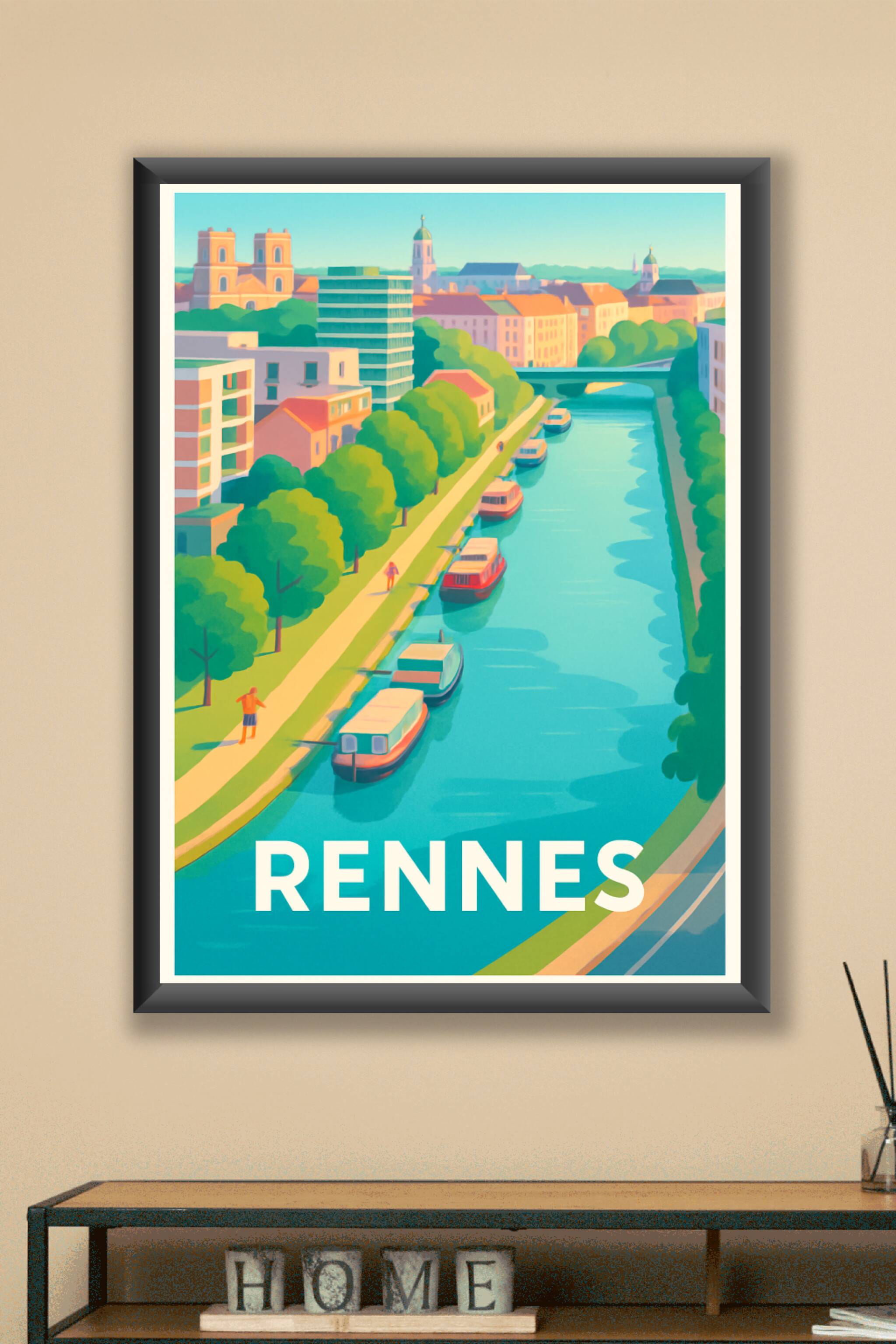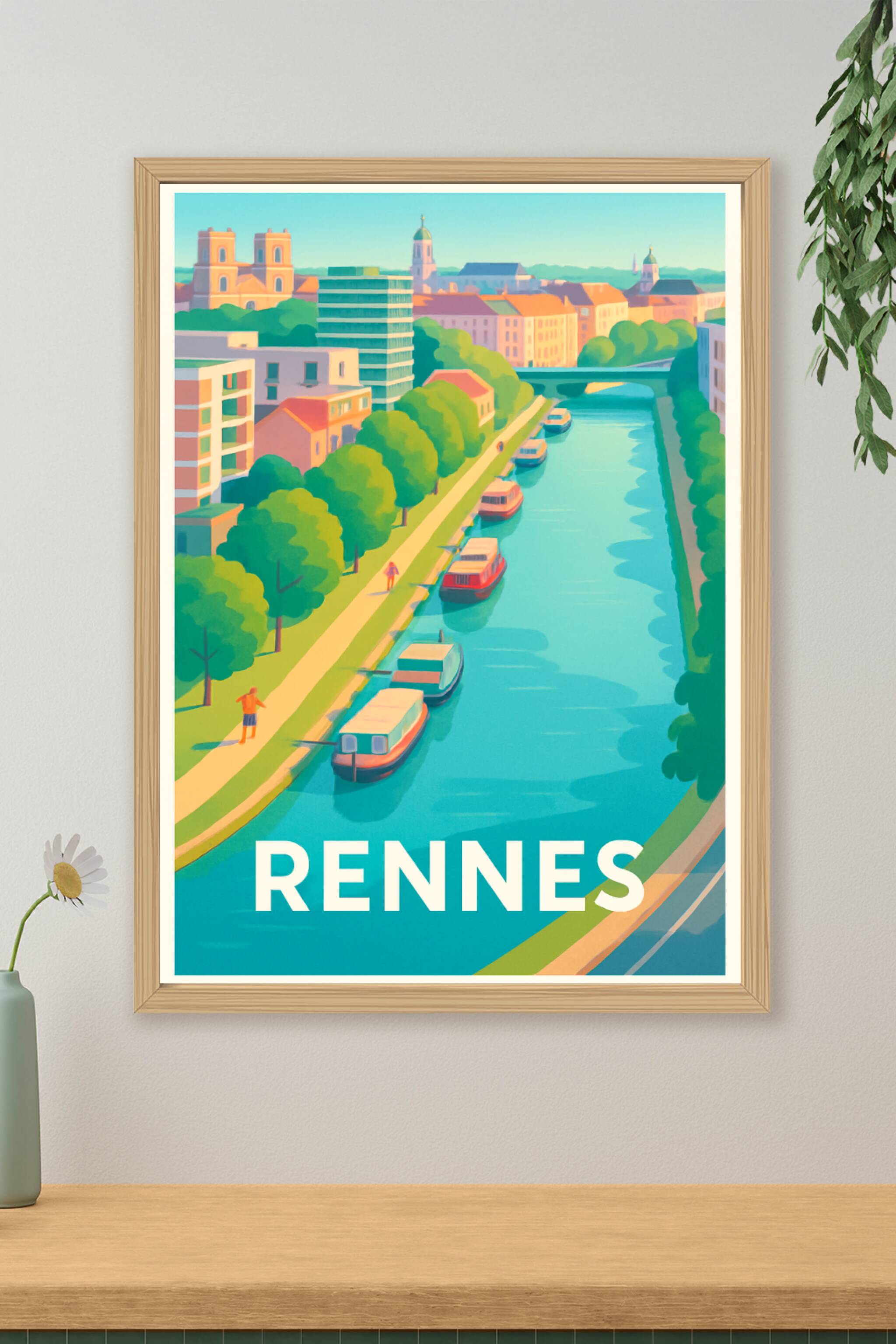 Découvrez l'élégance paisible de Rennes avec cette affiche illustrée mettant en valeur la Vilaine, rivière emblématique bordée d'arbres et de pénic...
