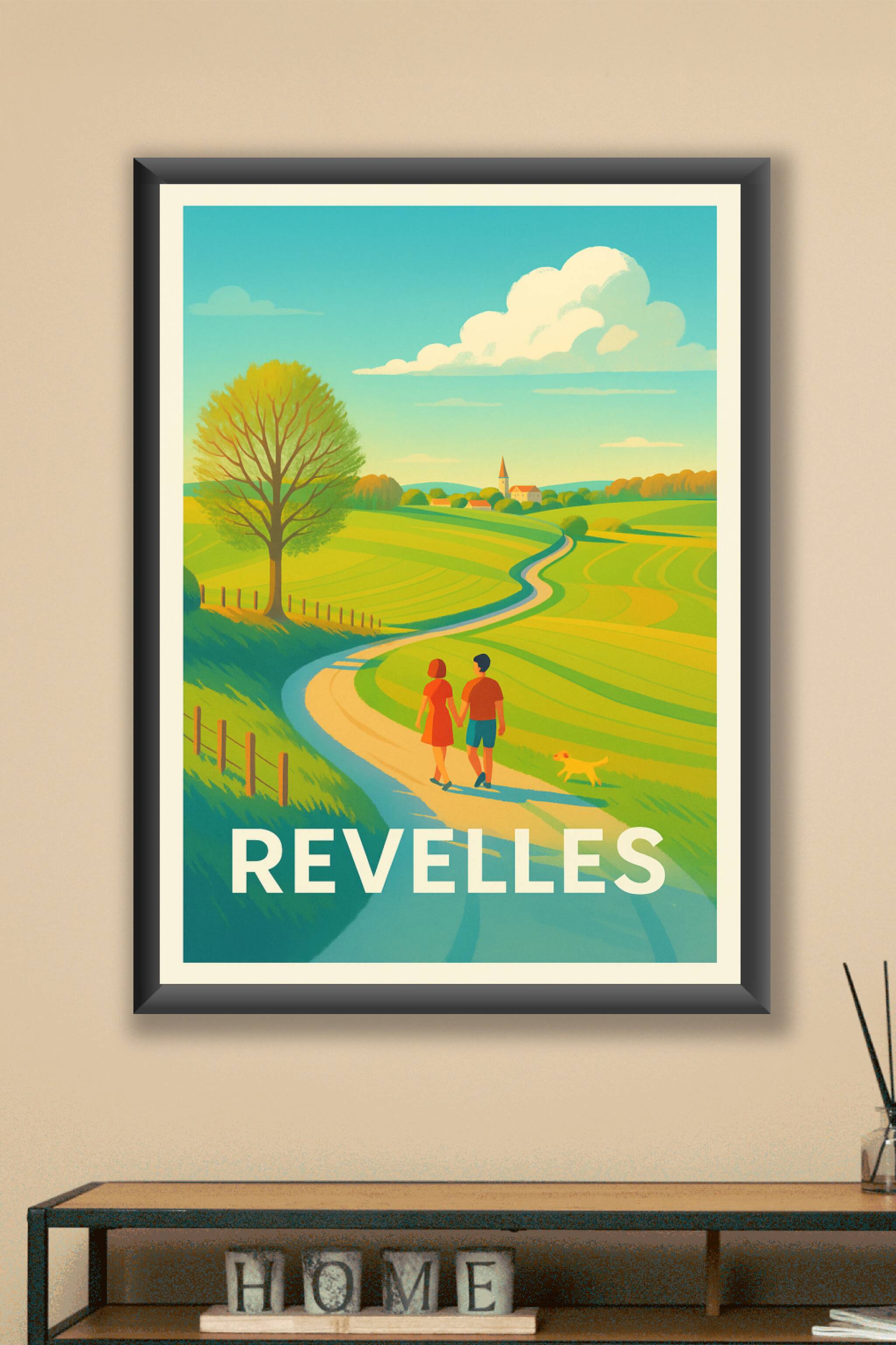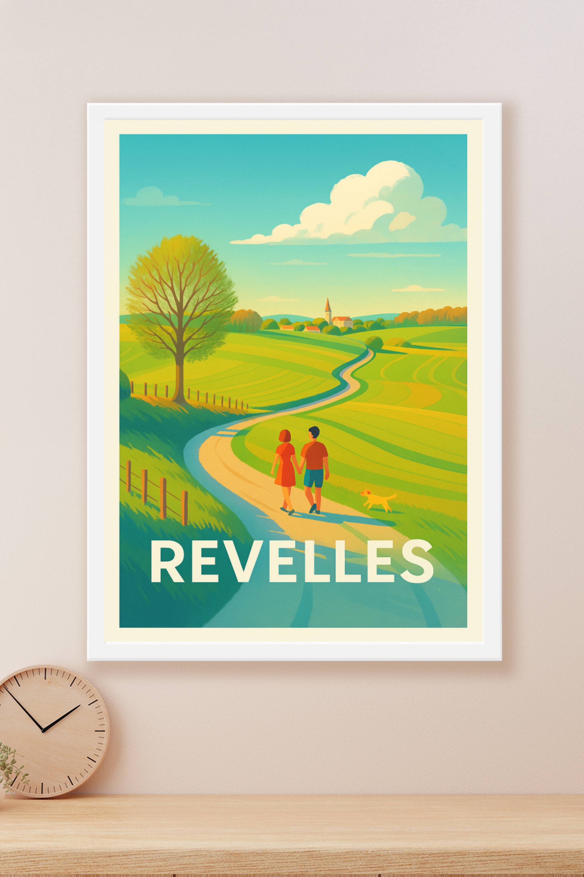 Découvrez l'affiche Revelles qui capture la douce ambiance champêtre d'un sentier bordé de champs verdoyants et d'un couple se promenant main dans ...