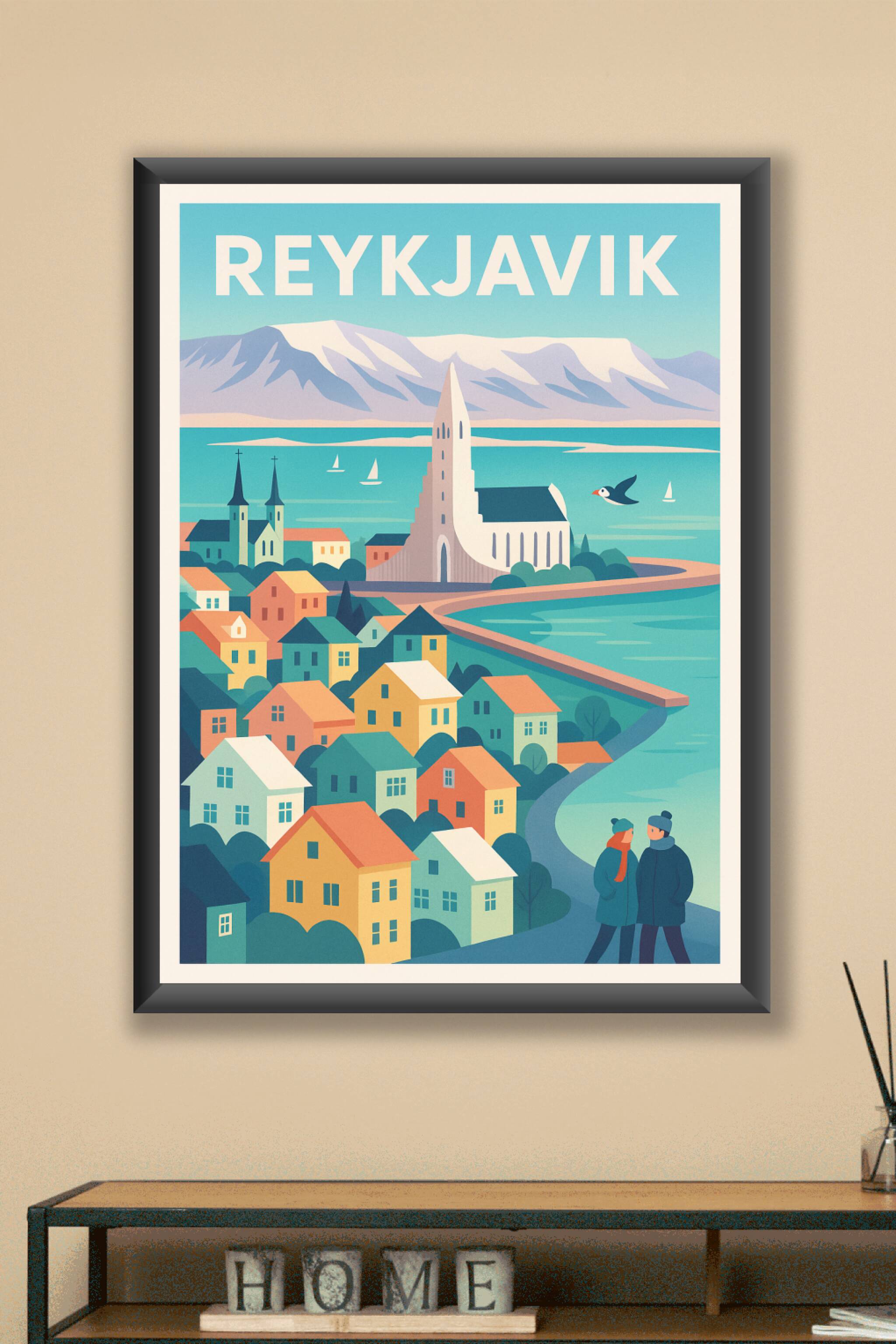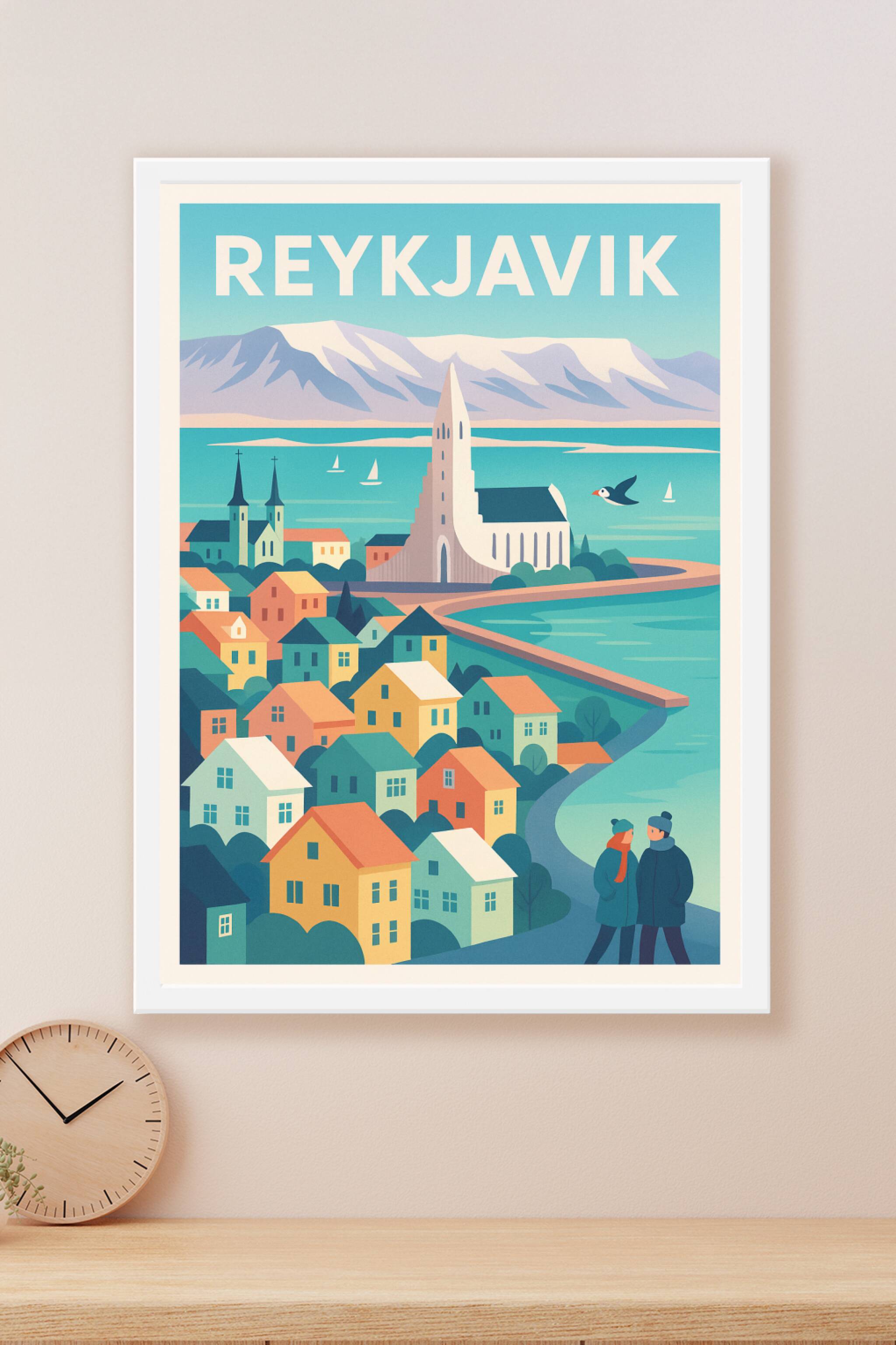 Découvrez l'atmosphère paisible de Reykjavik à travers cette affiche poétique mettant en avant ses maisons colorées et l'emblématique église Hallgr...
