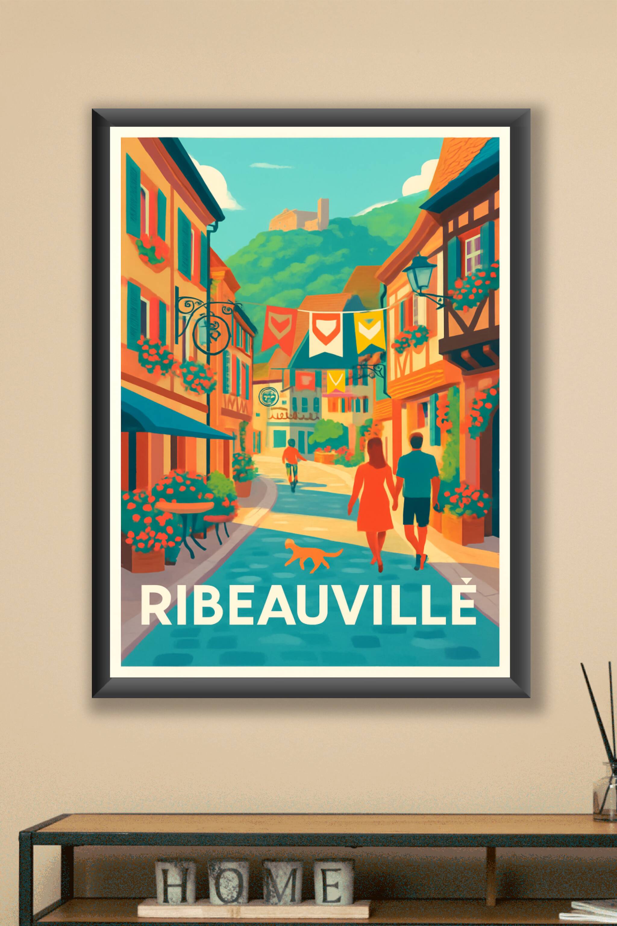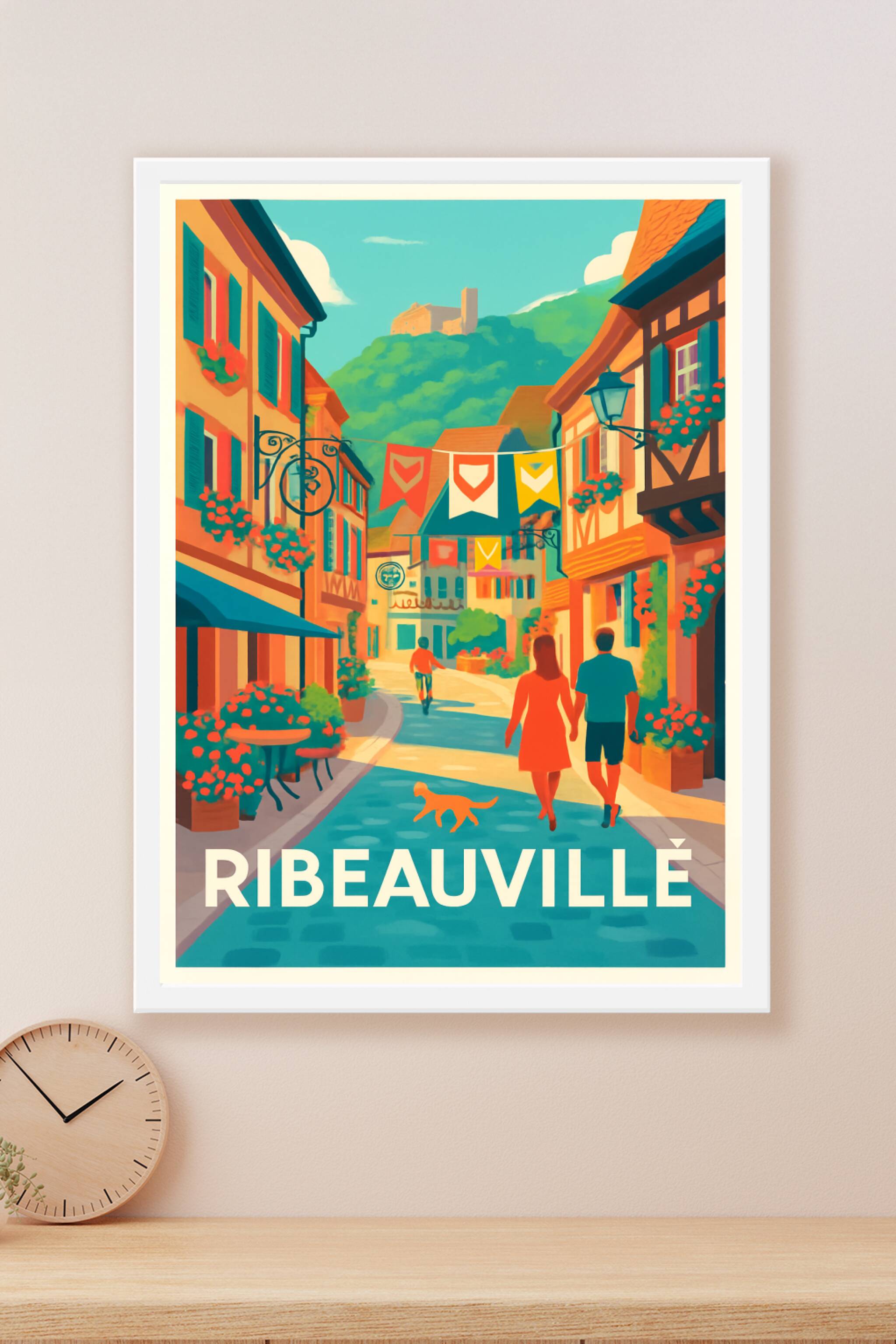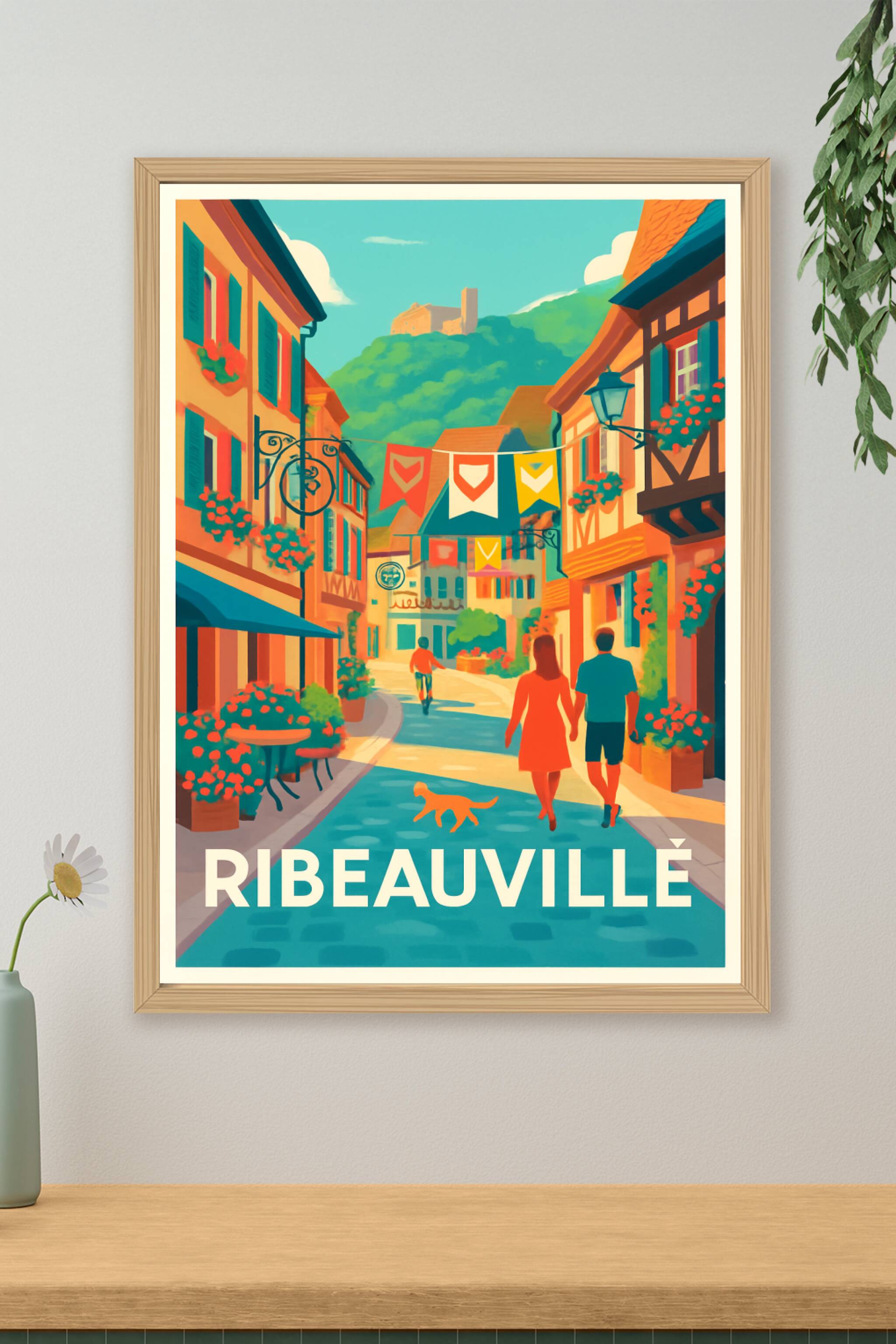 Découvrez l'atmosphère chaleureuse et pittoresque de Ribeauvillé à travers cette affiche illustrée aux couleurs vives et harmonieuses. Avec ses rue...