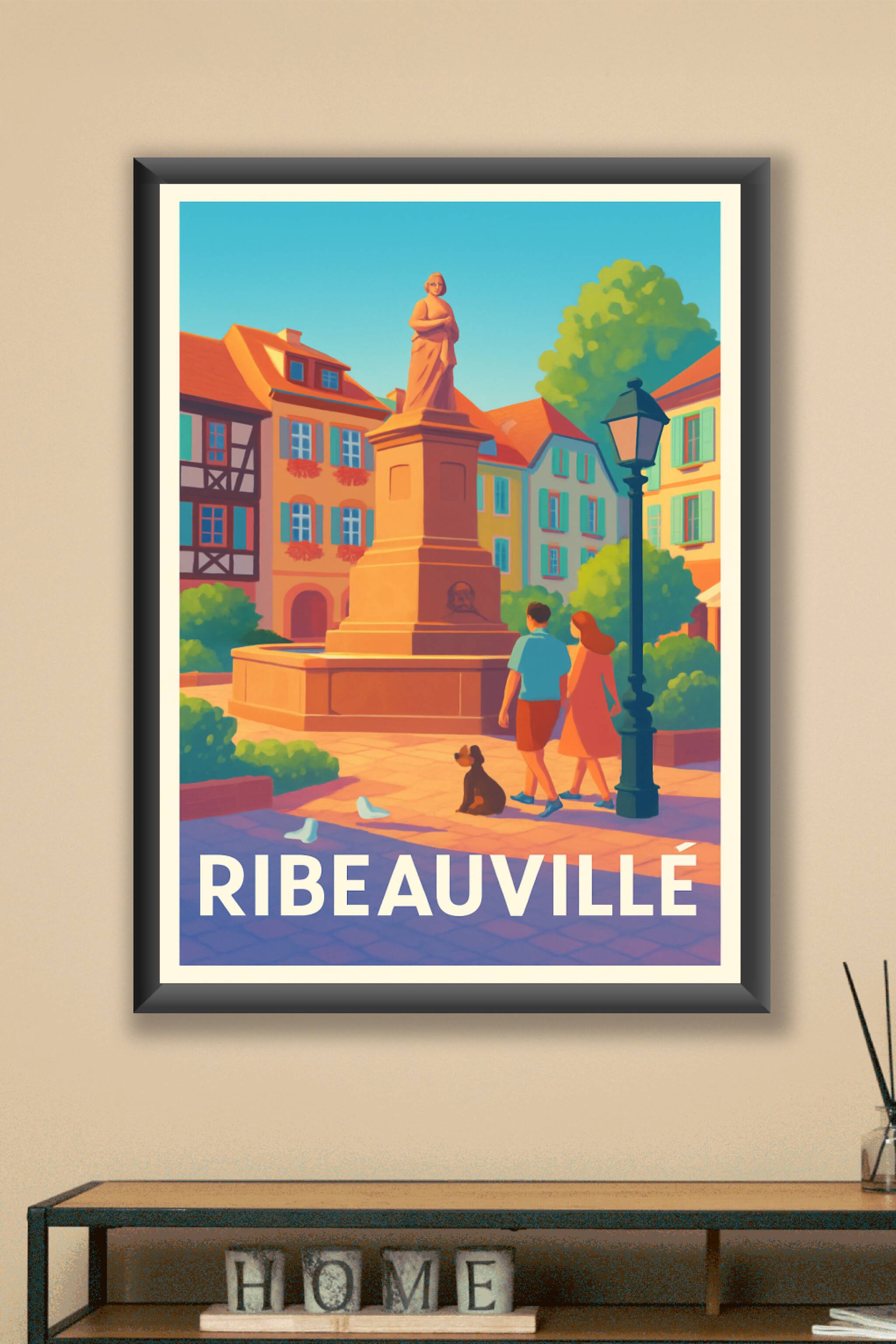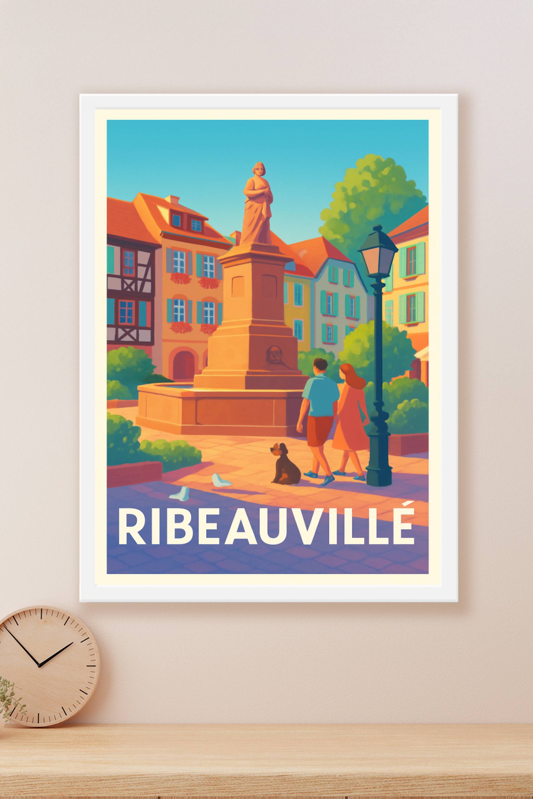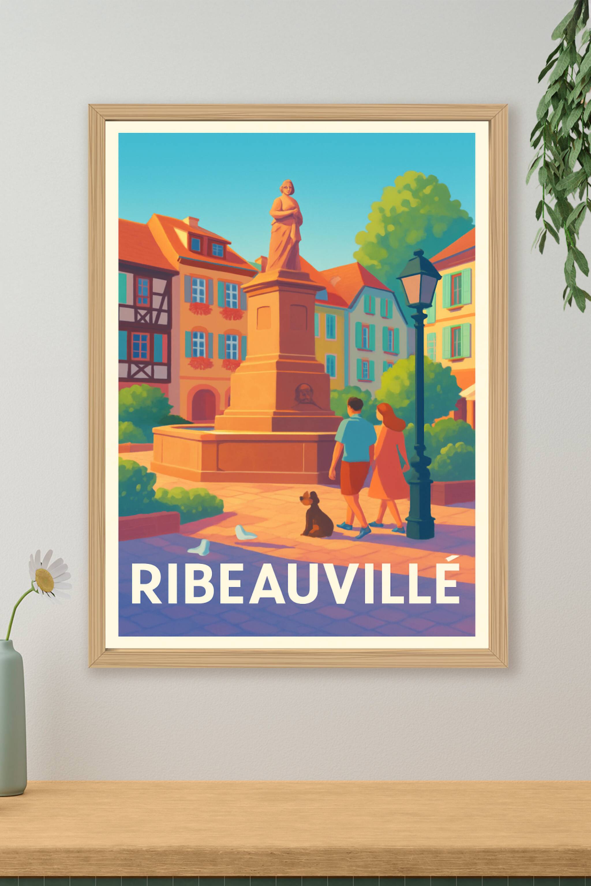 Découvrez l'élégance paisible de Ribeauvillé avec cette affiche évoquant une scène typique de la ville, où monuments historiques et ruelles pittore...