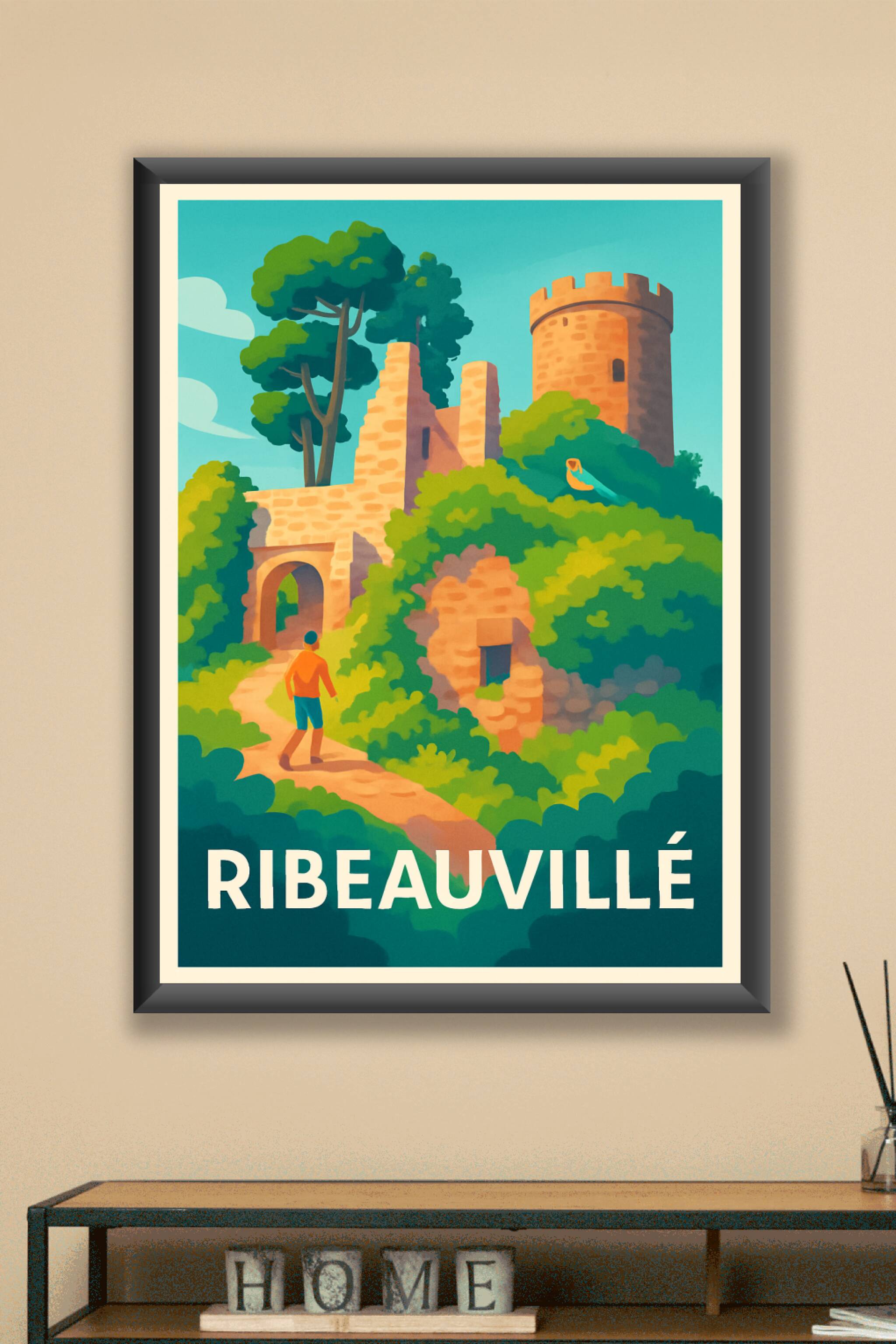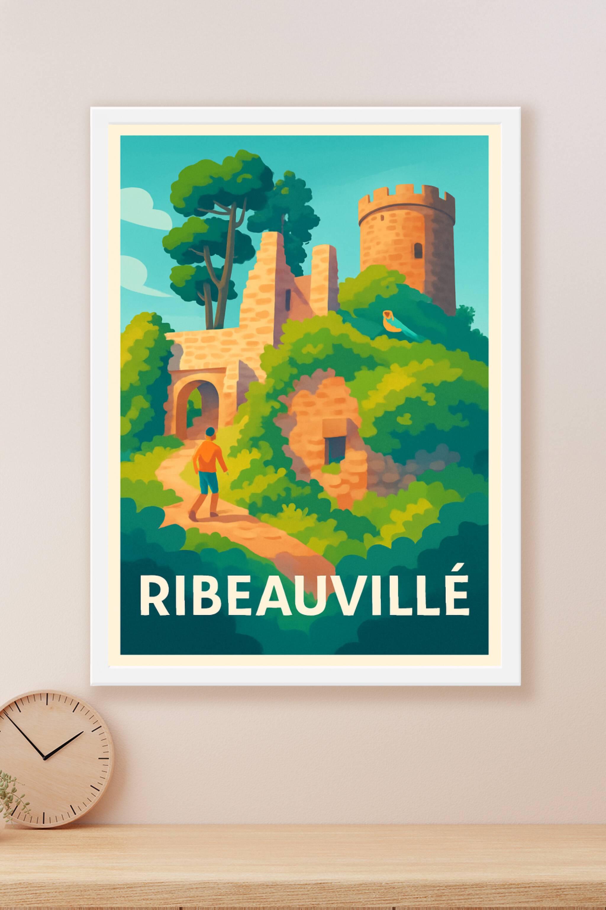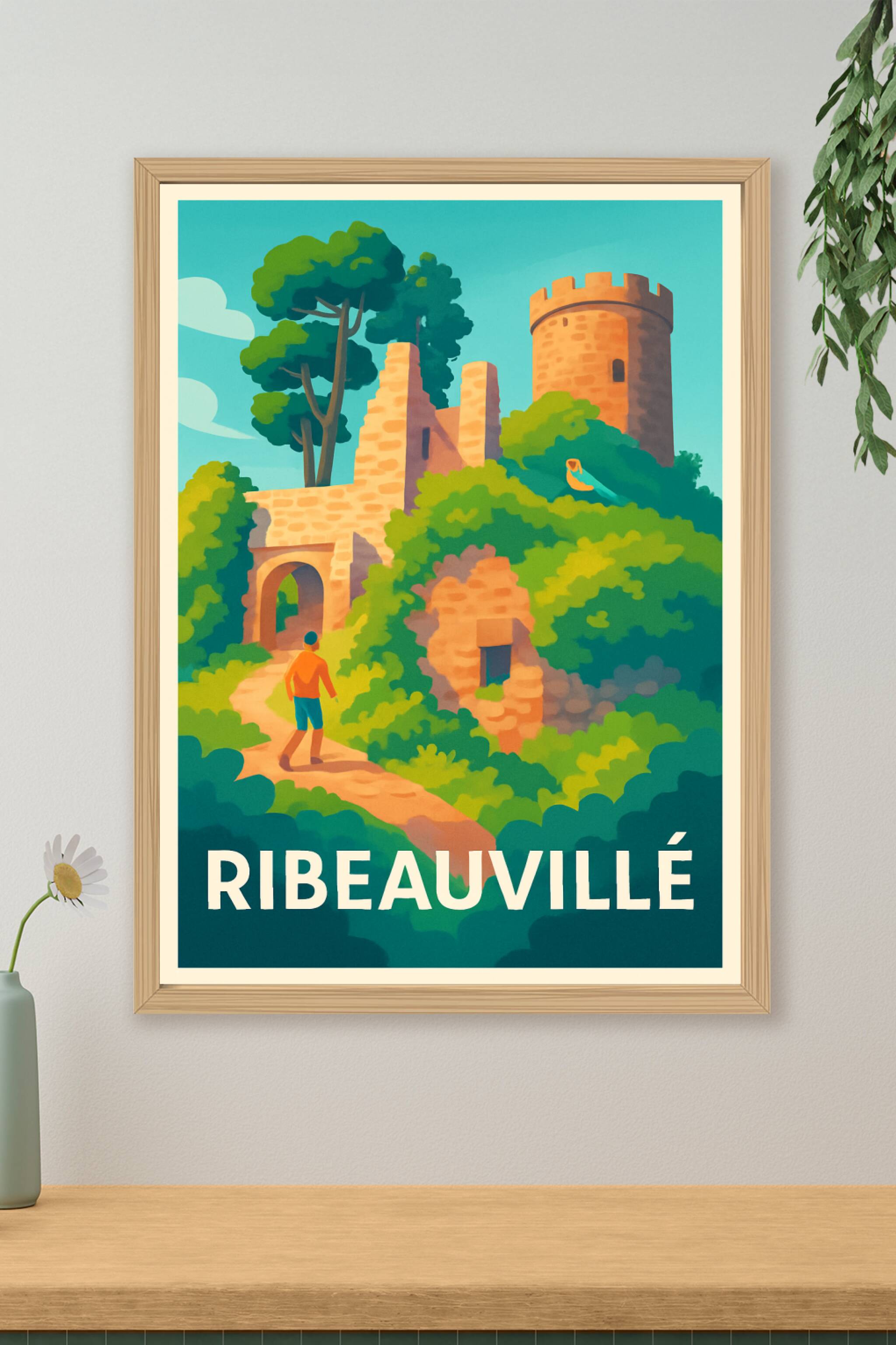 Découvrez la magie de Ribeauvillé avec cette affiche illustrée qui révèle les ruines médiévales baignées par une lumière douce, nichées au milieu d...