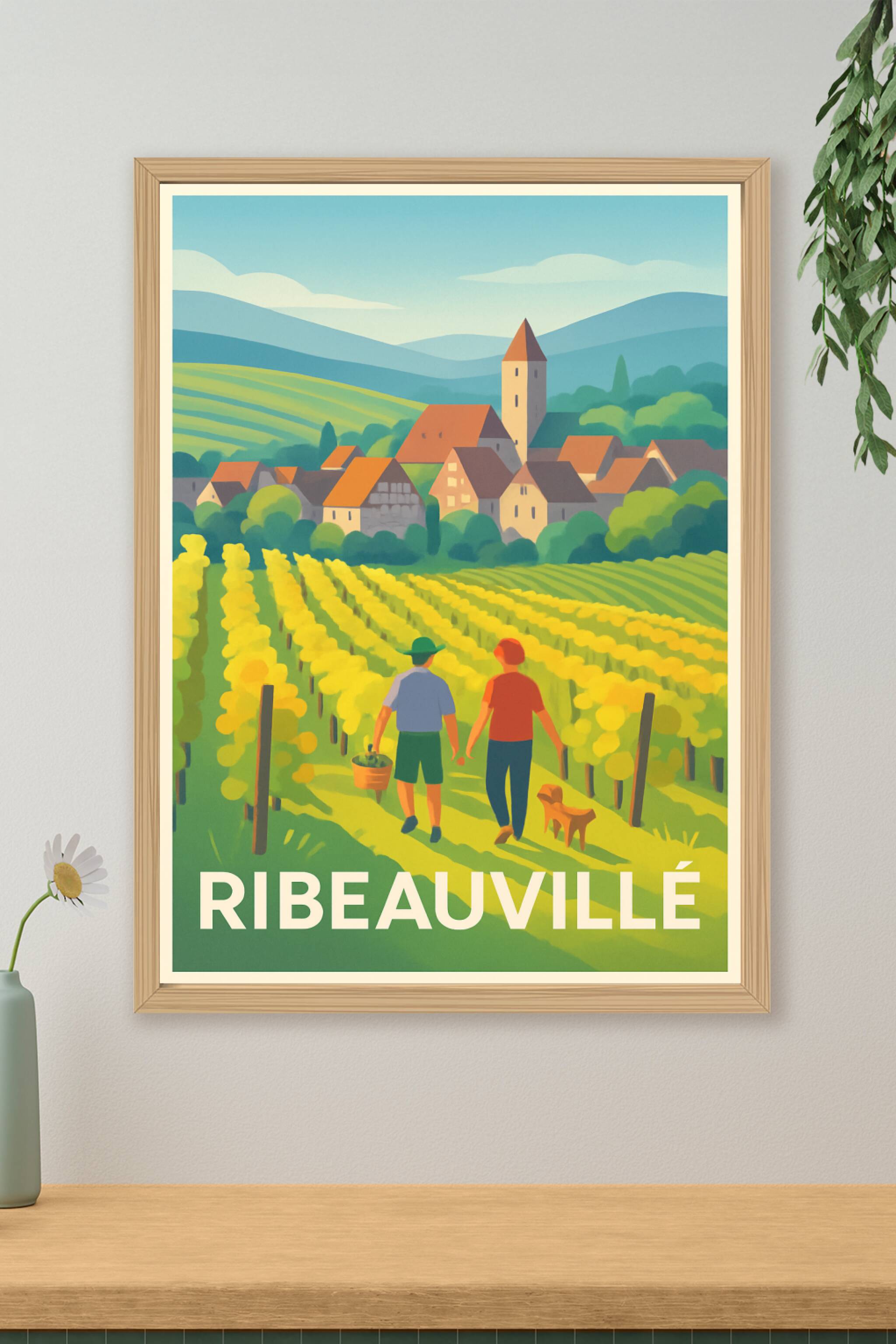 Découvrez toute la douceur et le charme des paysages viticoles de Ribeauvillé avec cette affiche illustrée aux couleurs chaleureuses et apaisantes....