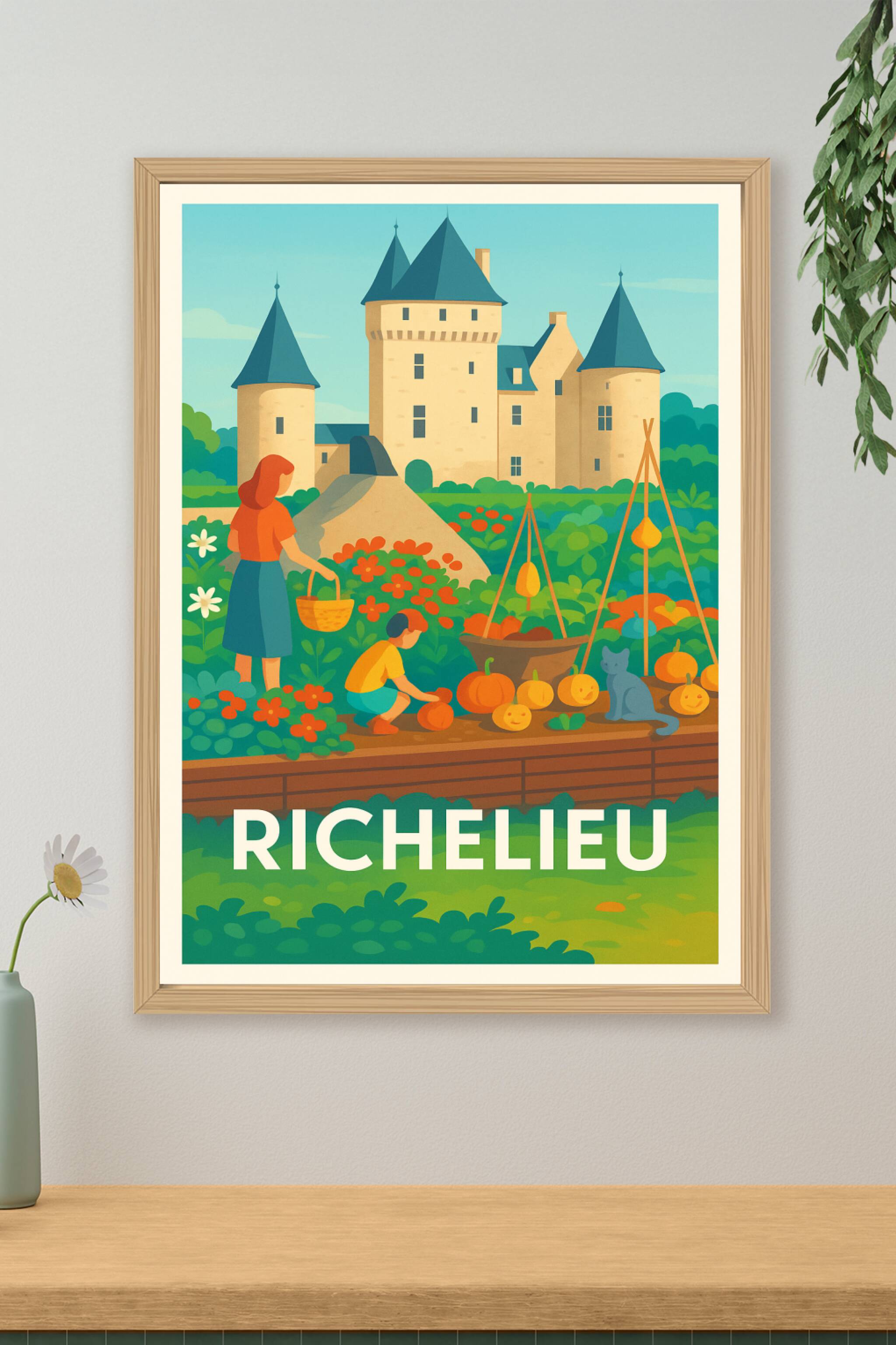 Découvrez la quiétude et la beauté bucolique de Richelieu à travers cette affiche illustrée mettant en scène le célèbre château et son jardin en pl...