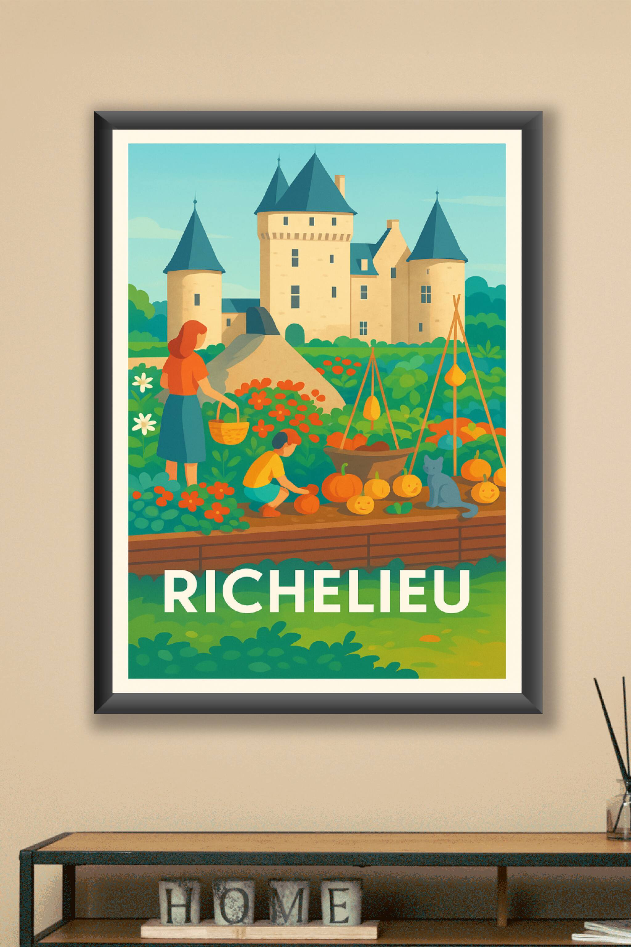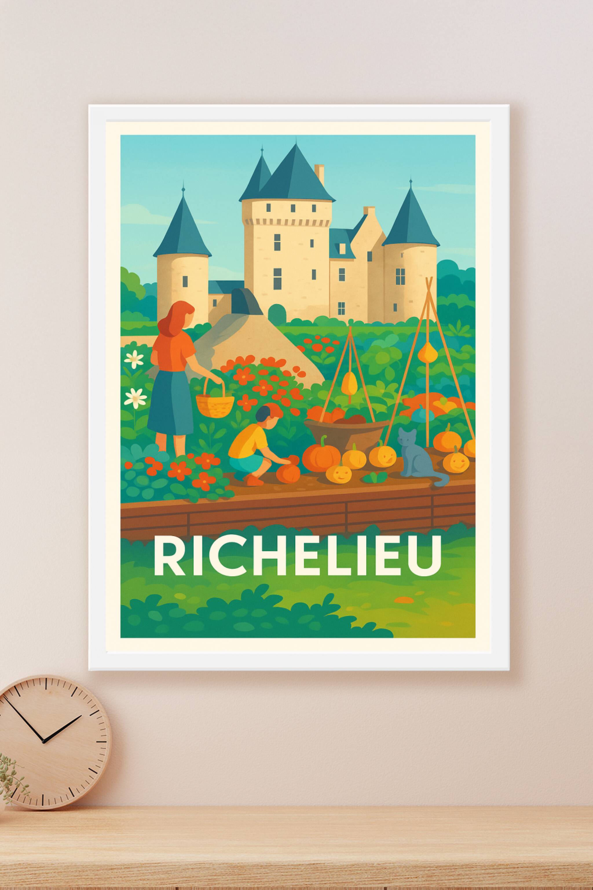 Découvrez la quiétude et la beauté bucolique de Richelieu à travers cette affiche illustrée mettant en scène le célèbre château et son jardin en pleine récolte. Cette scène paisible est sublimée par des couleurs douces et un style vintage qui apportera une atmosphère chaleureuse à votre intérieur. Ce poster est imprimé en tirage "Fine Art" sur papier 305g coton, garantissant une qualité d'impression exceptionnelle et une durabilité accrue. Disponible en formats A1 à A4, avec ou sans cadre, il s'adapte parfaitement à tous les espaces et styles de décoration. Offrez-vous ce souvenir élégant et raffiné qui met en valeur l'histoire et la nature de Richelieu.