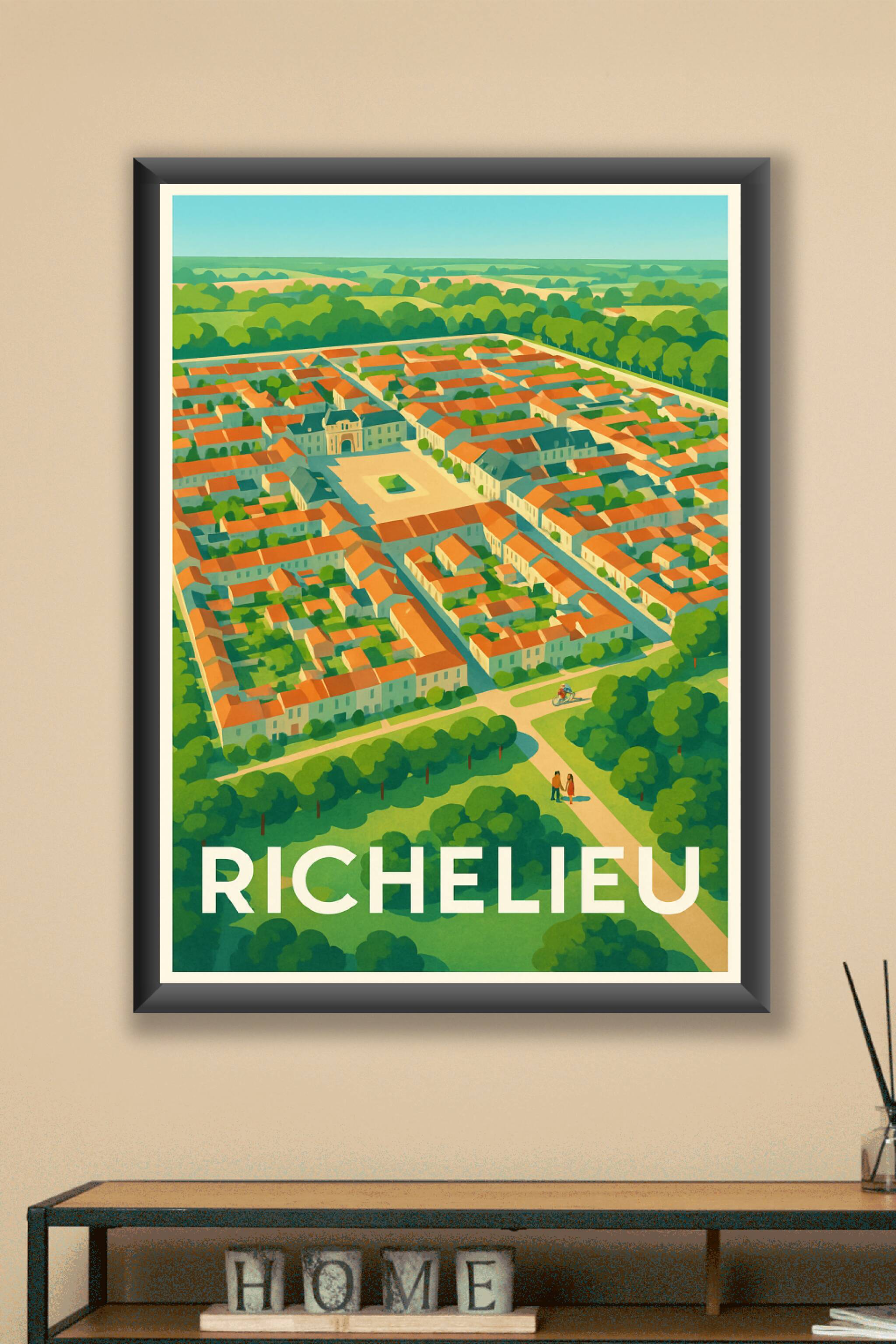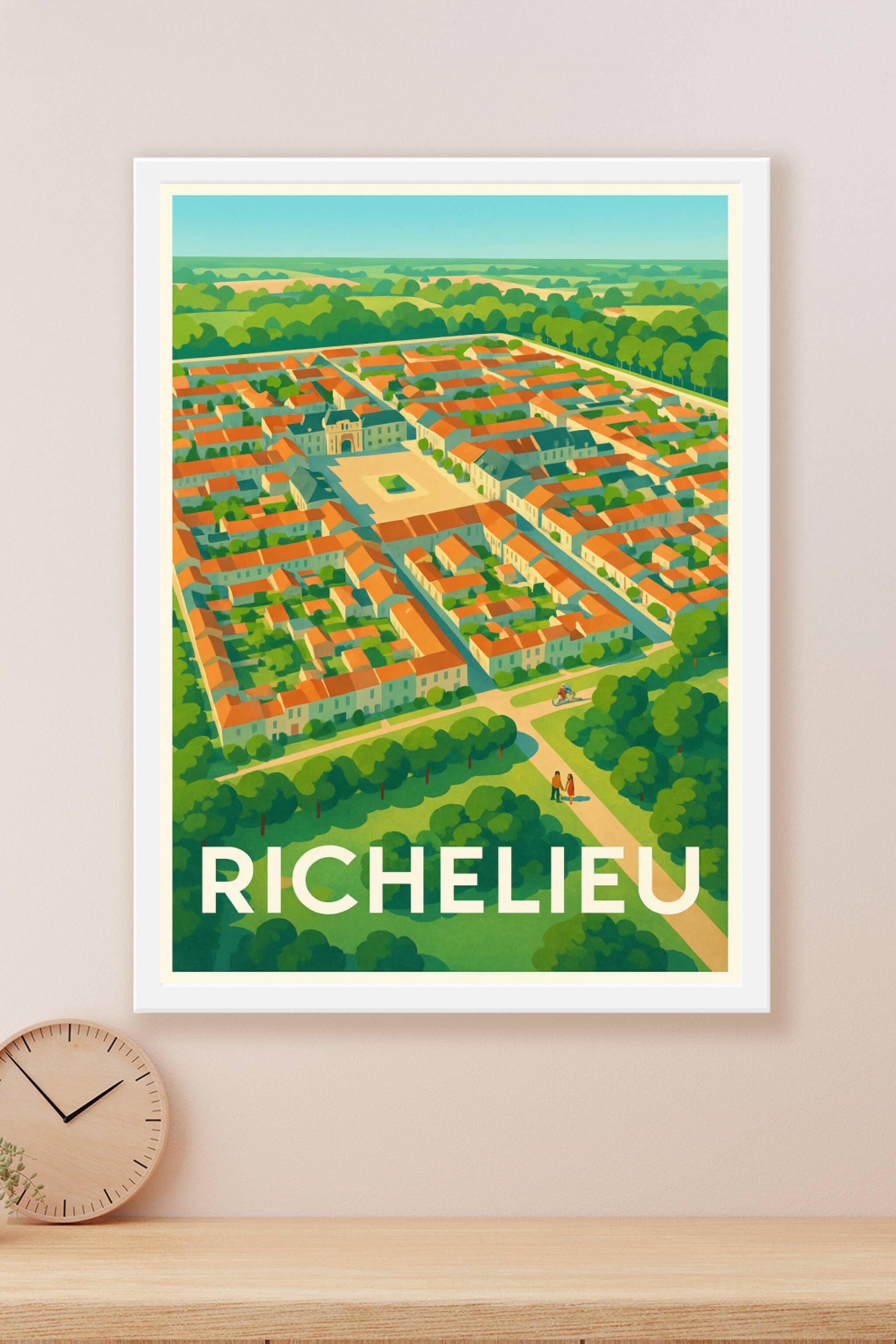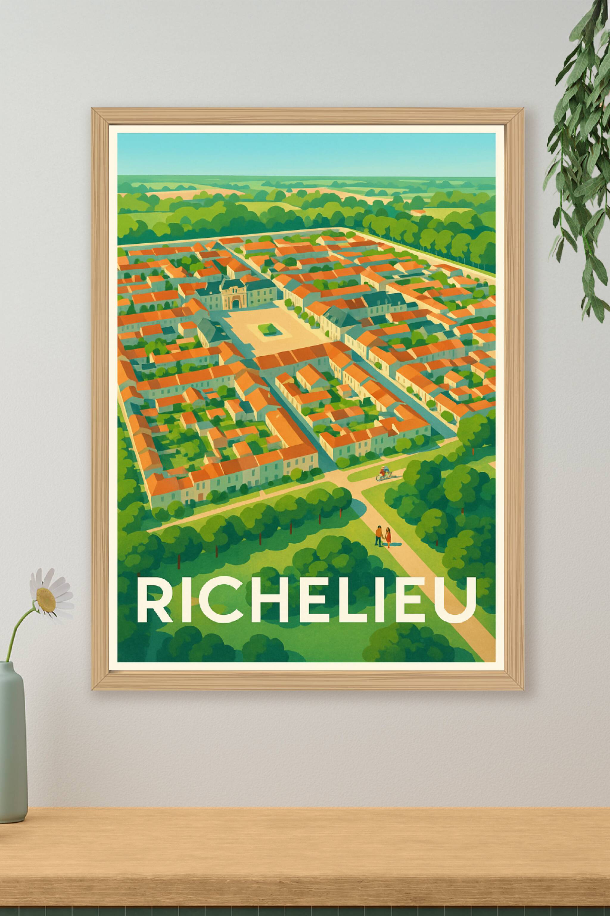 Découvrez l'affiche représentant Richelieu, cette charmante ville française conçue comme un véritable chef-d'œuvre d'urbanisme. Ce poster met en va...