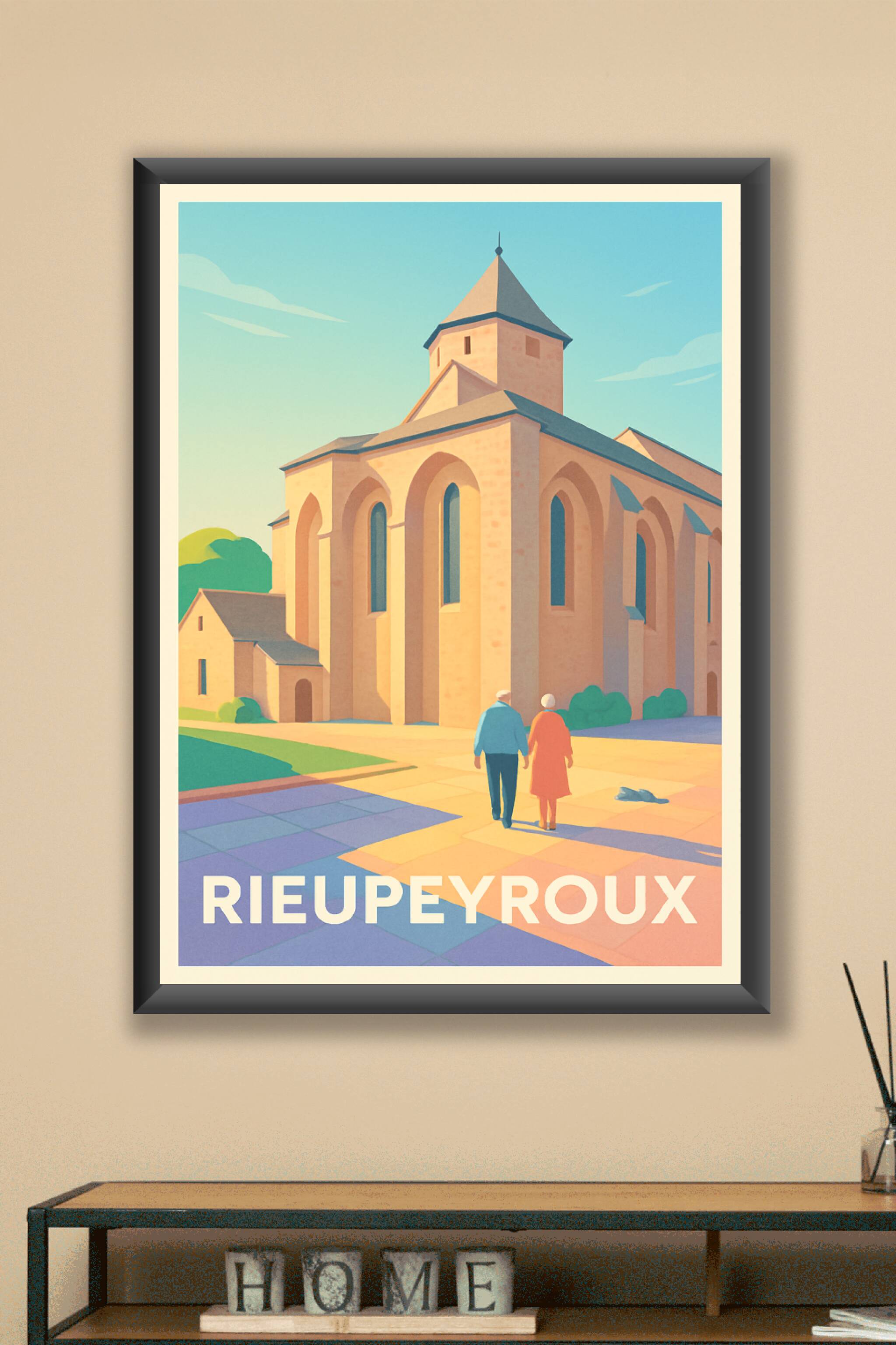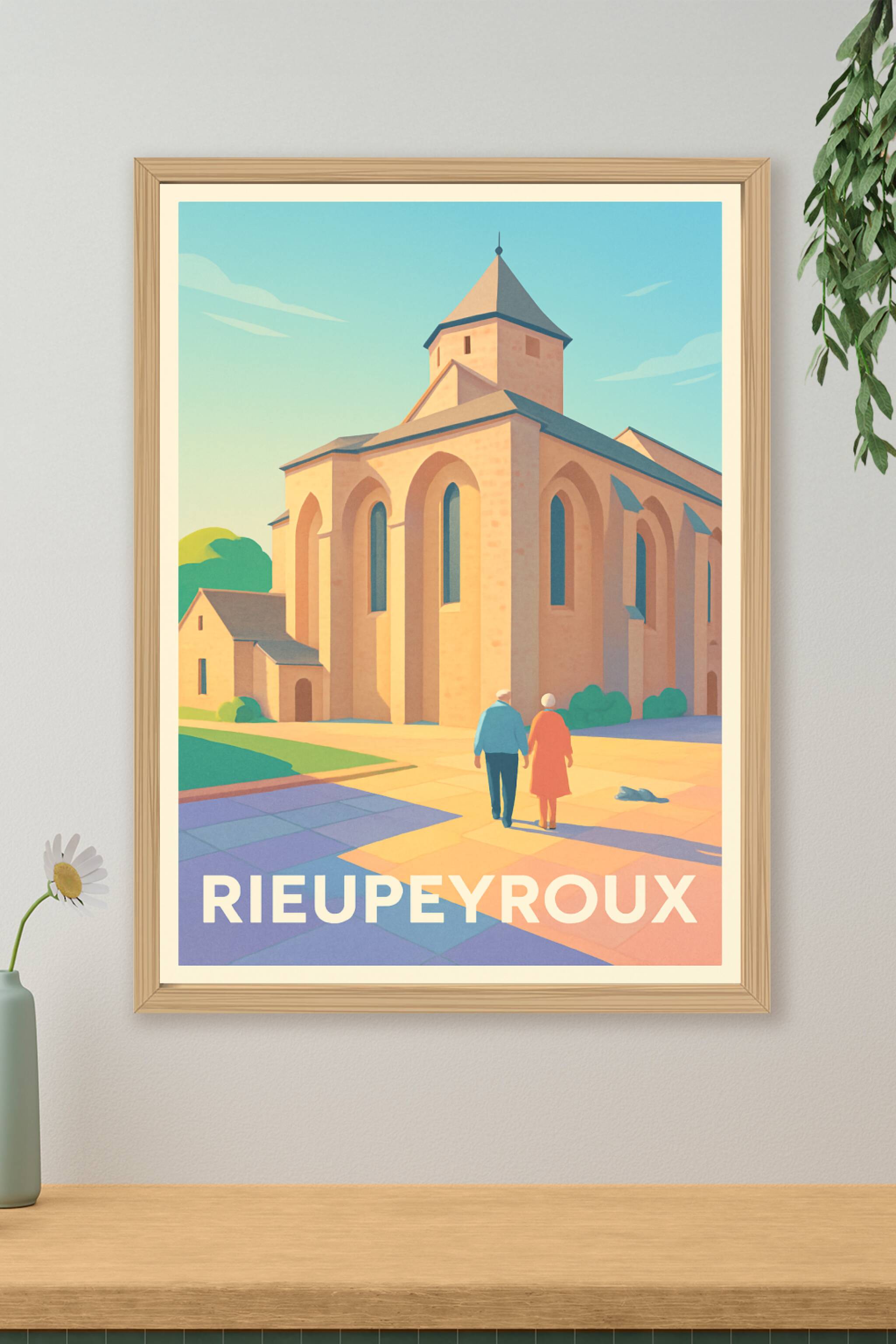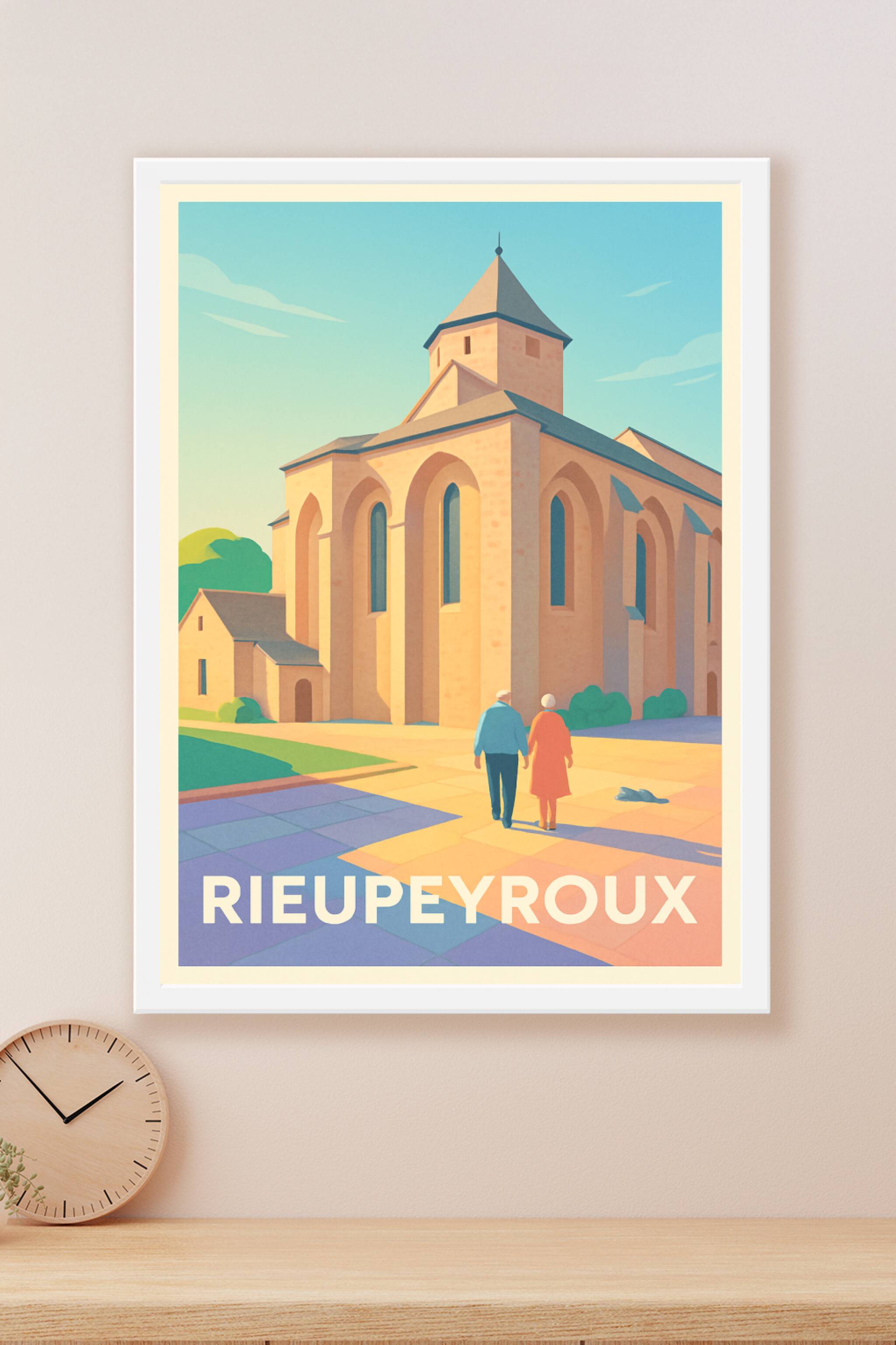 Redécouvrez le charme authentique de Rieupeyroux avec cette affiche au style rétro doux et apaisant. Ce poster illustre un moment de calme et de sé...