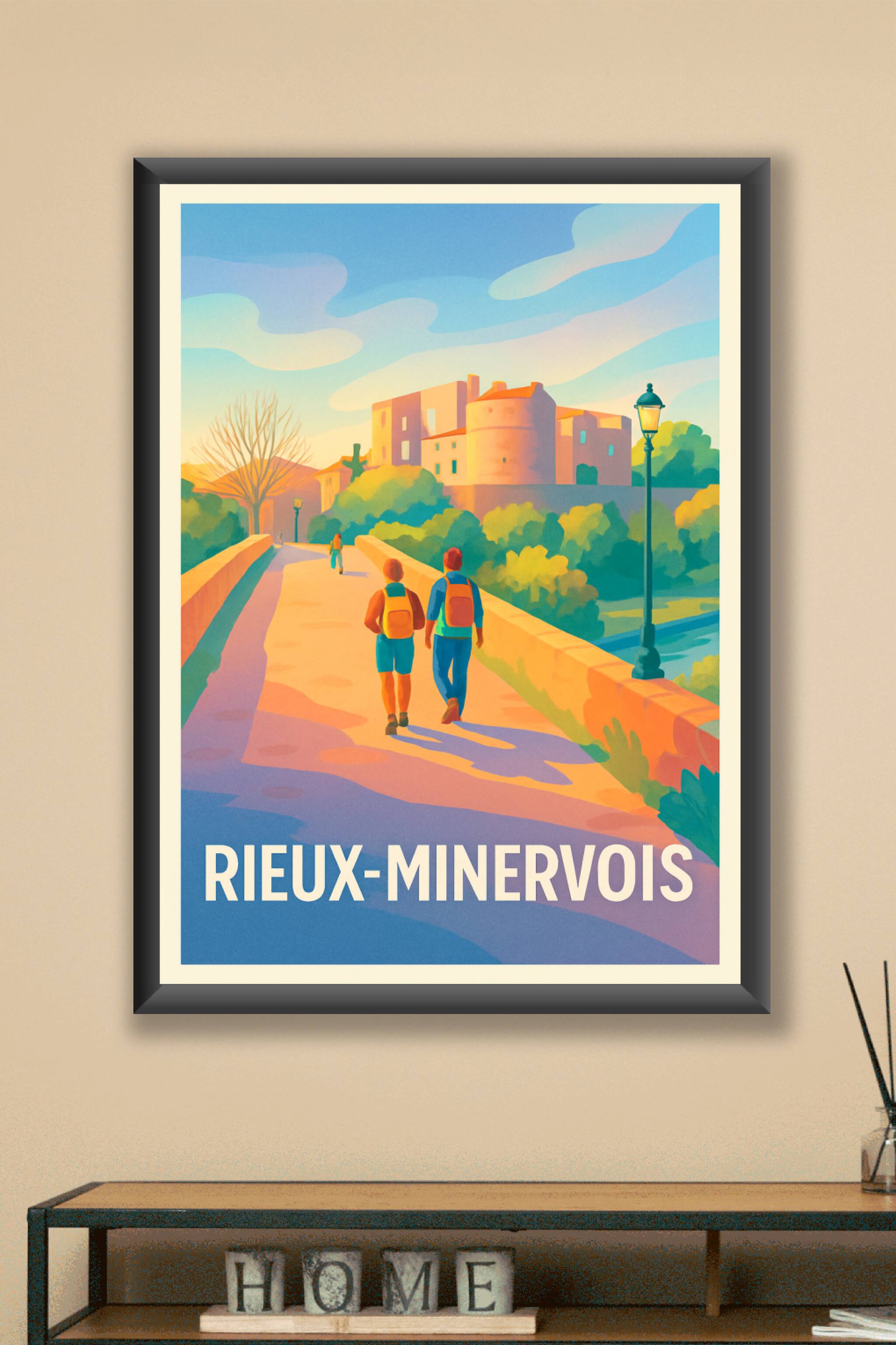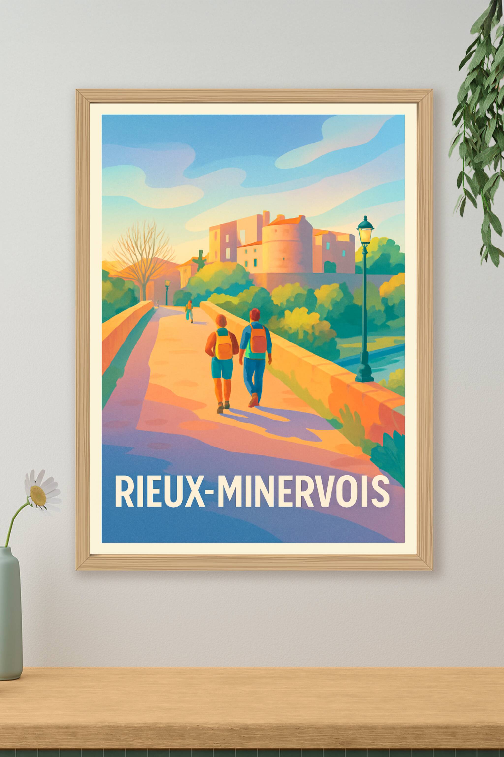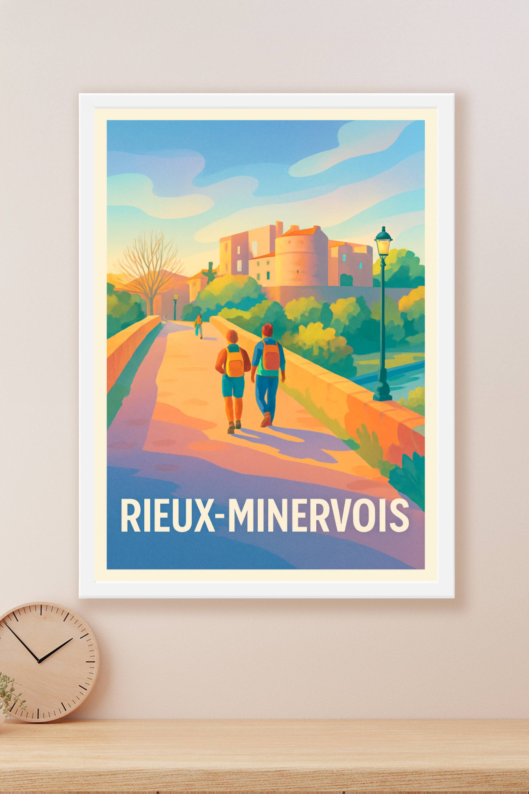 Offrez-vous une escapade visuelle au sein de Rieux-Minervois avec cette affiche pleine de douceur et de lumière. Ce poster met en scène une promena...