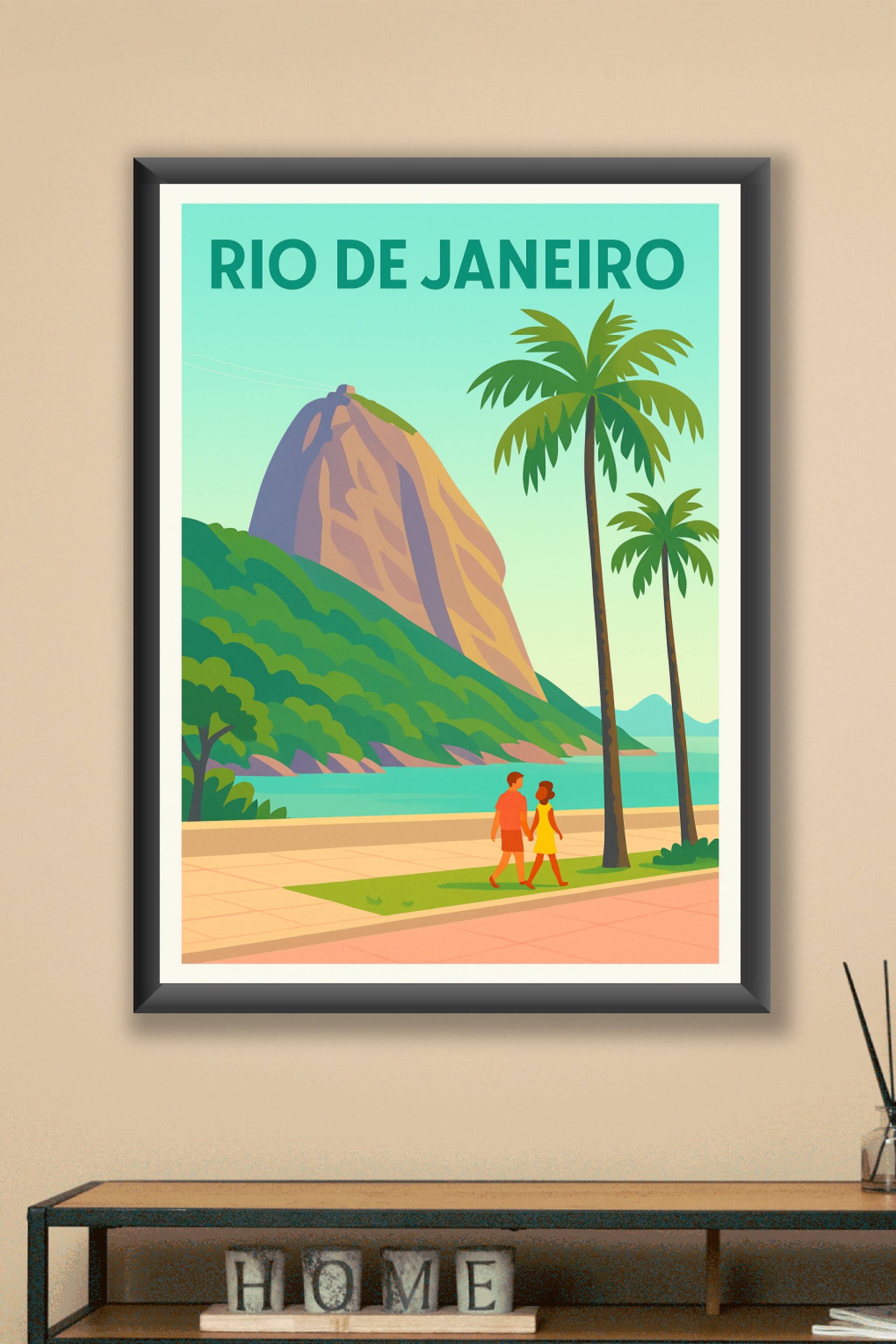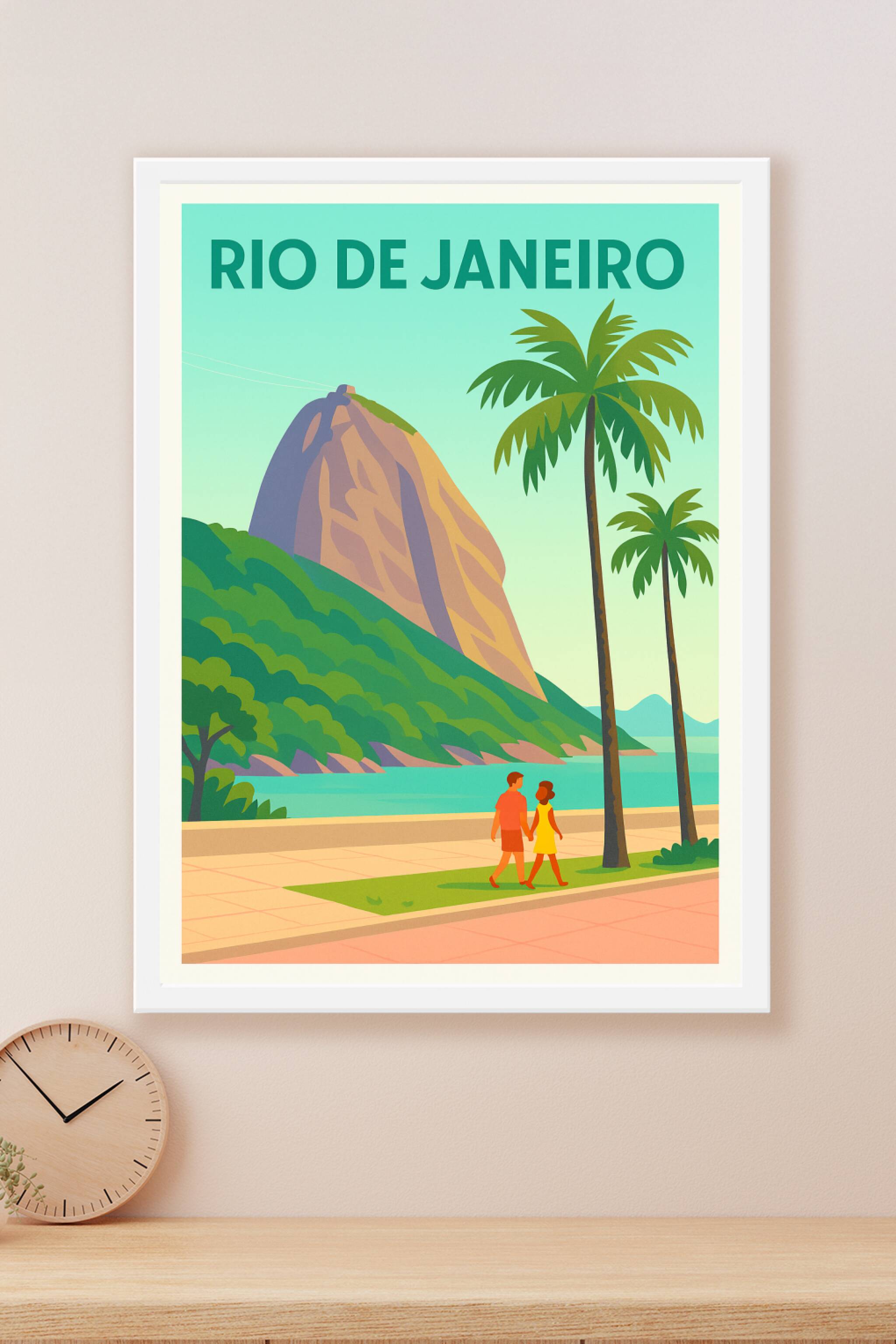 Découvrez la beauté emblématique de Rio de Janeiro avec cette affiche vintage qui capture la sérénité d'une promenade le long de la plage, au pied ...