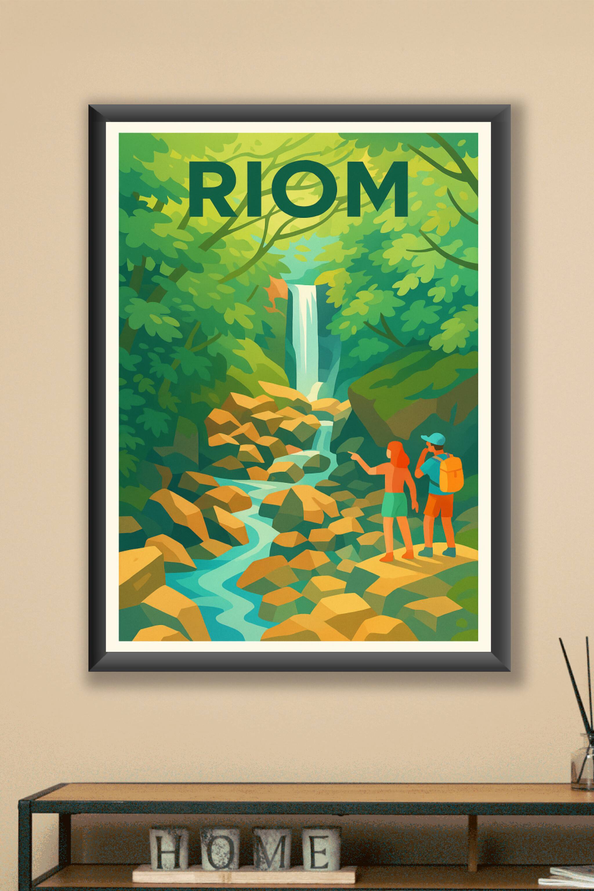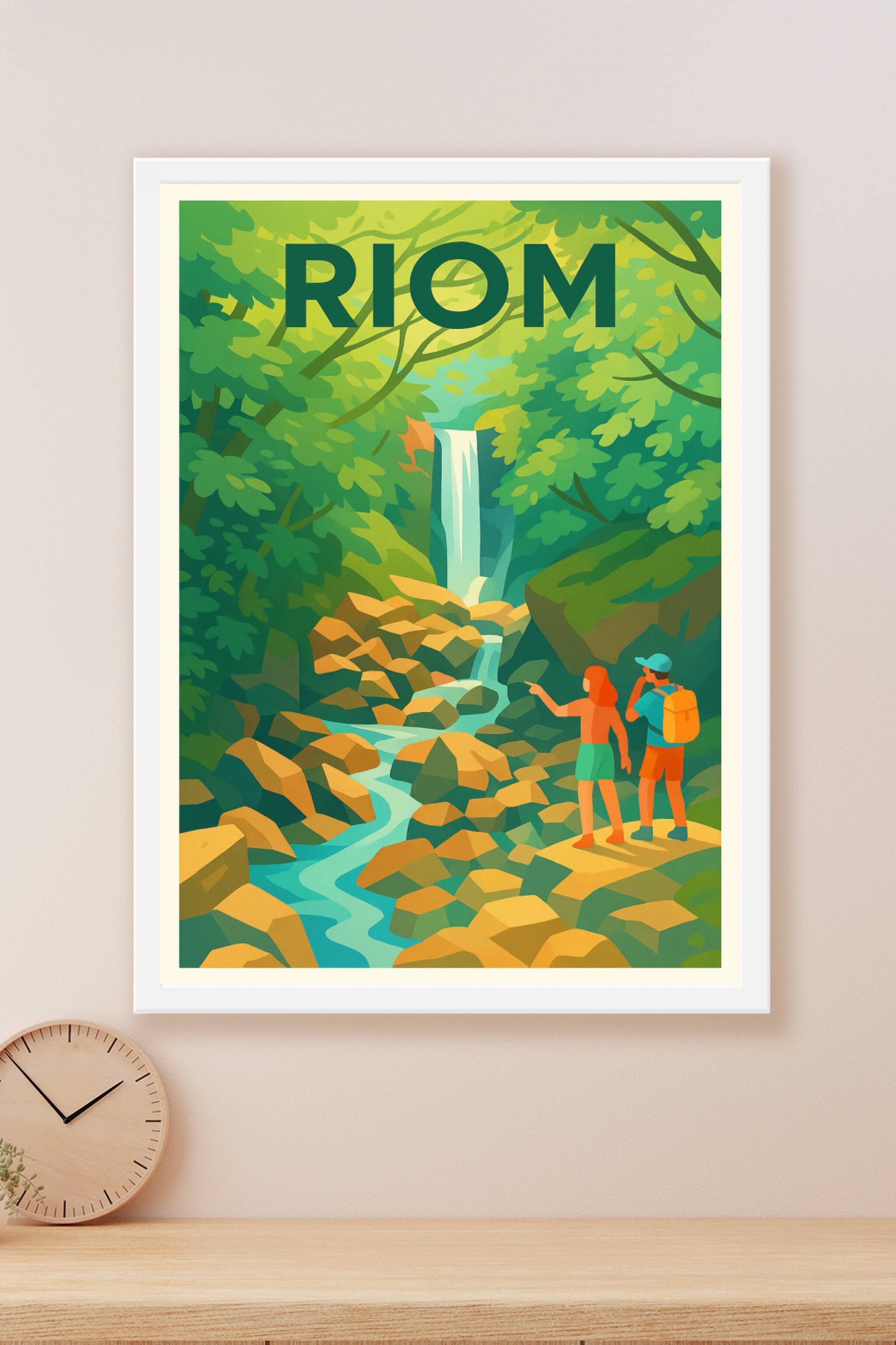 Découvrez la magie sauvage de Riom avec ce poster illustré mettant en scène une cascade paisible au cœur d'une forêt luxuriante. Cette affiche invi...