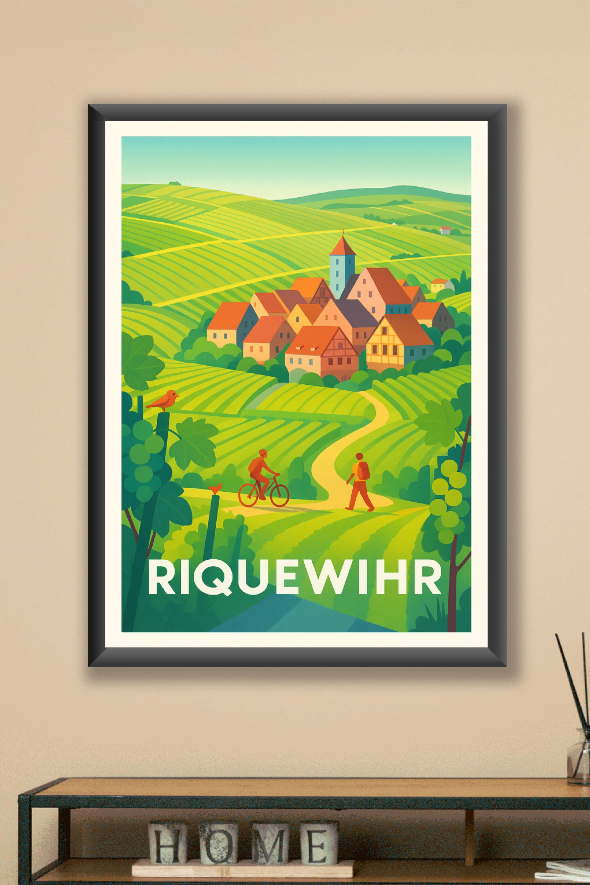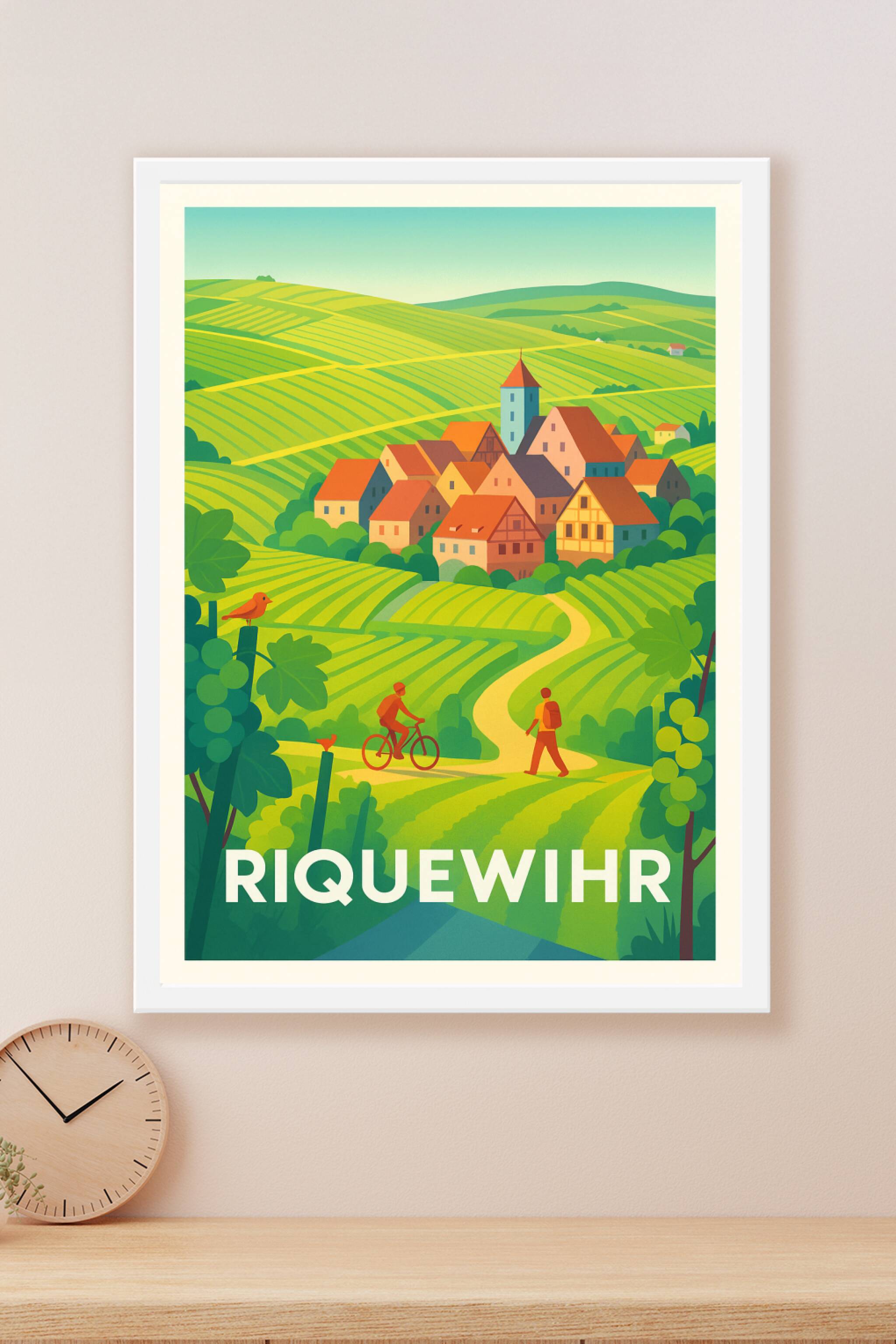 Découvrez la beauté pittoresque de Riquewihr, joyau alsacien niché au milieu des vignobles verdoyants, avec cette affiche au style vintage et color...